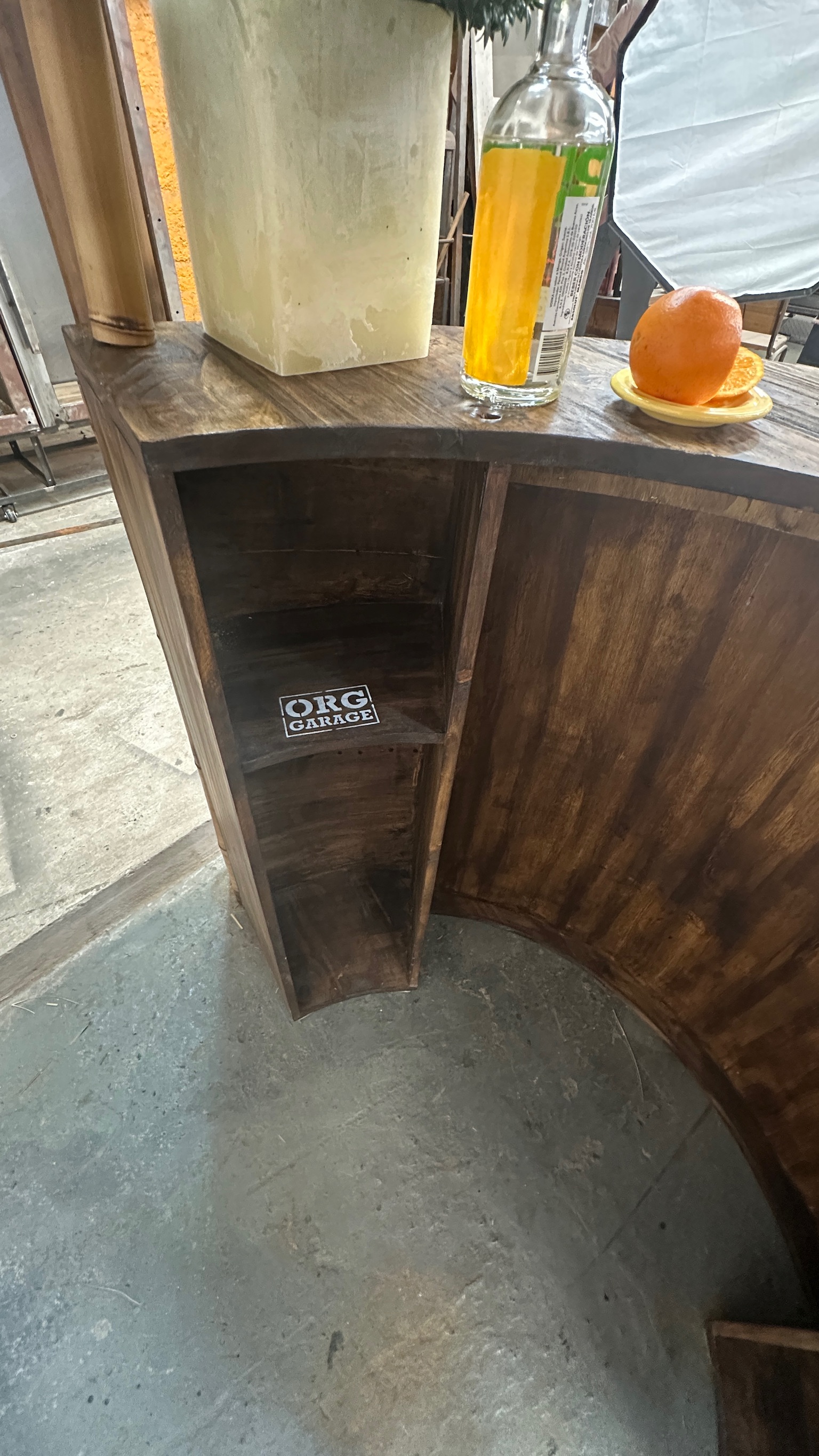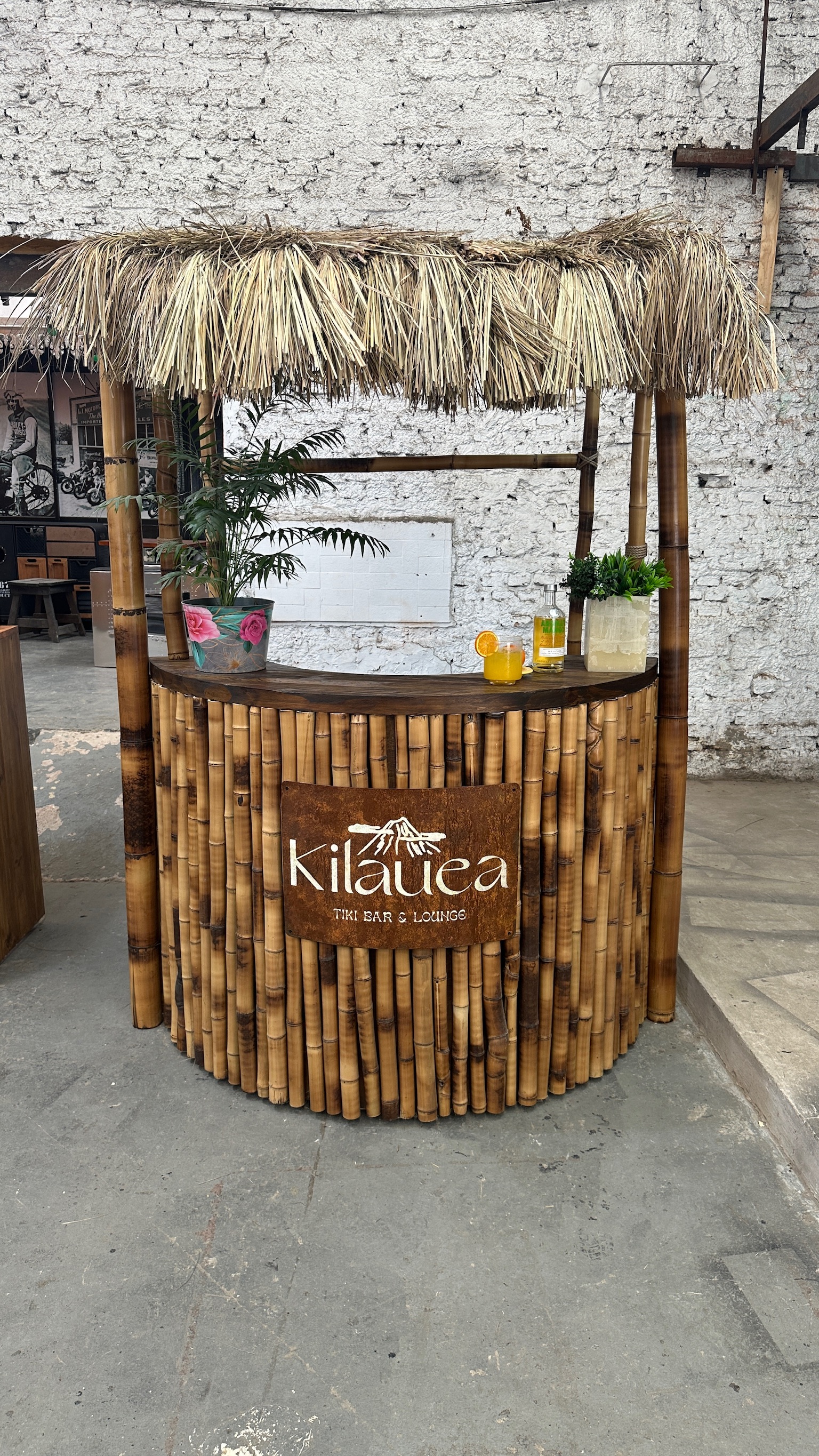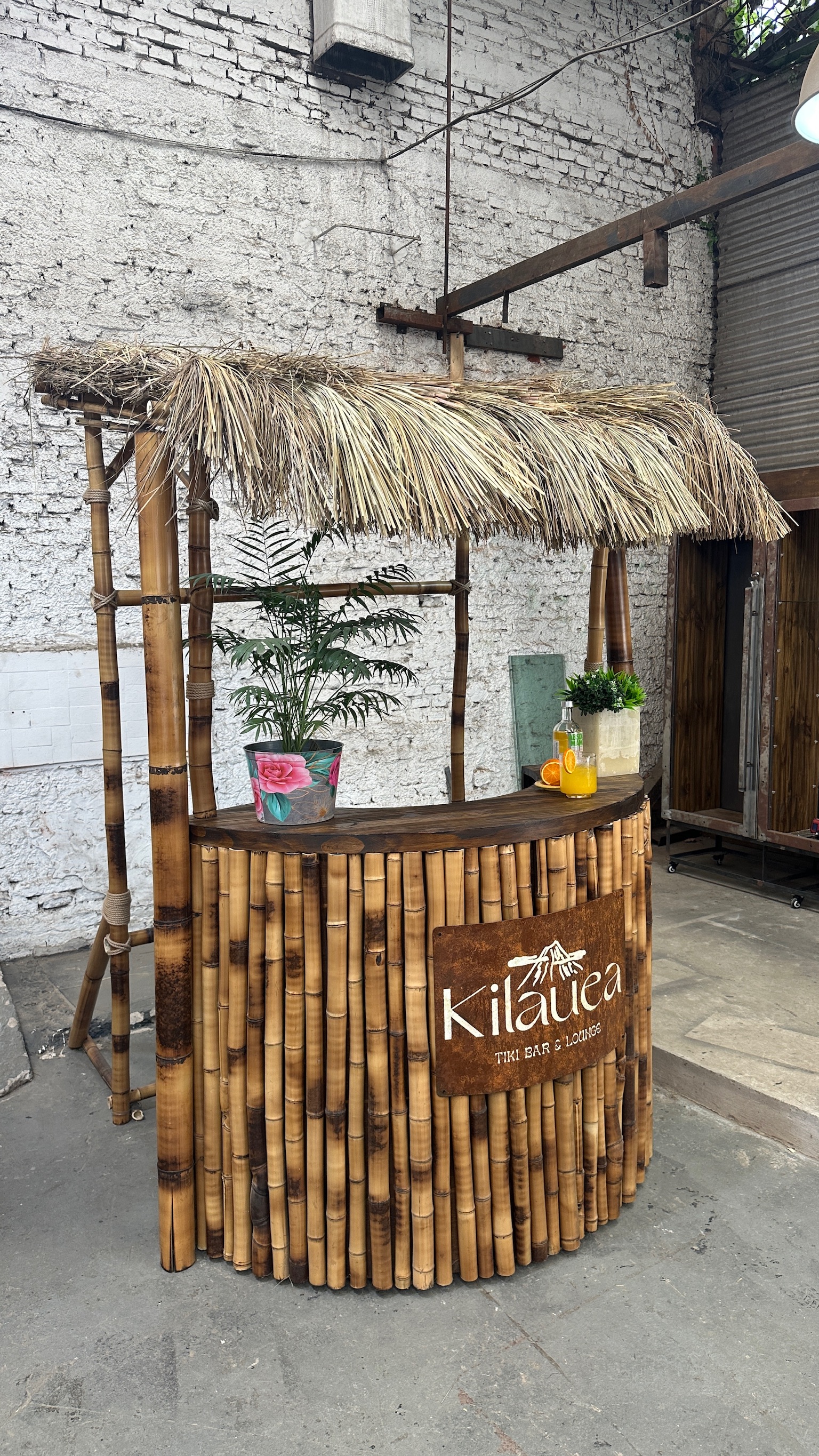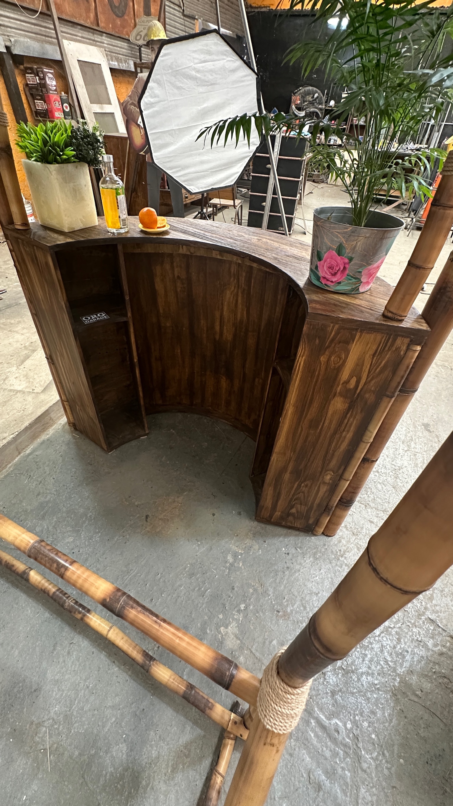 Recibidor con interior de madera con 2 estantes y un exterior de cañas de bambu y paja en el techo