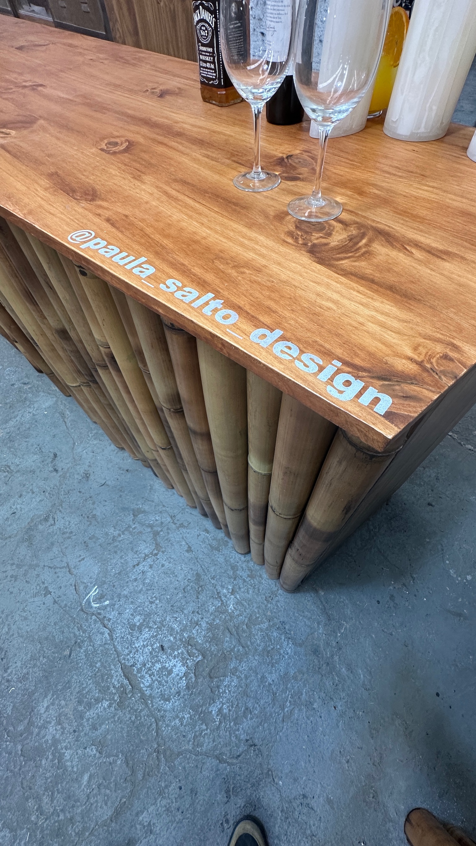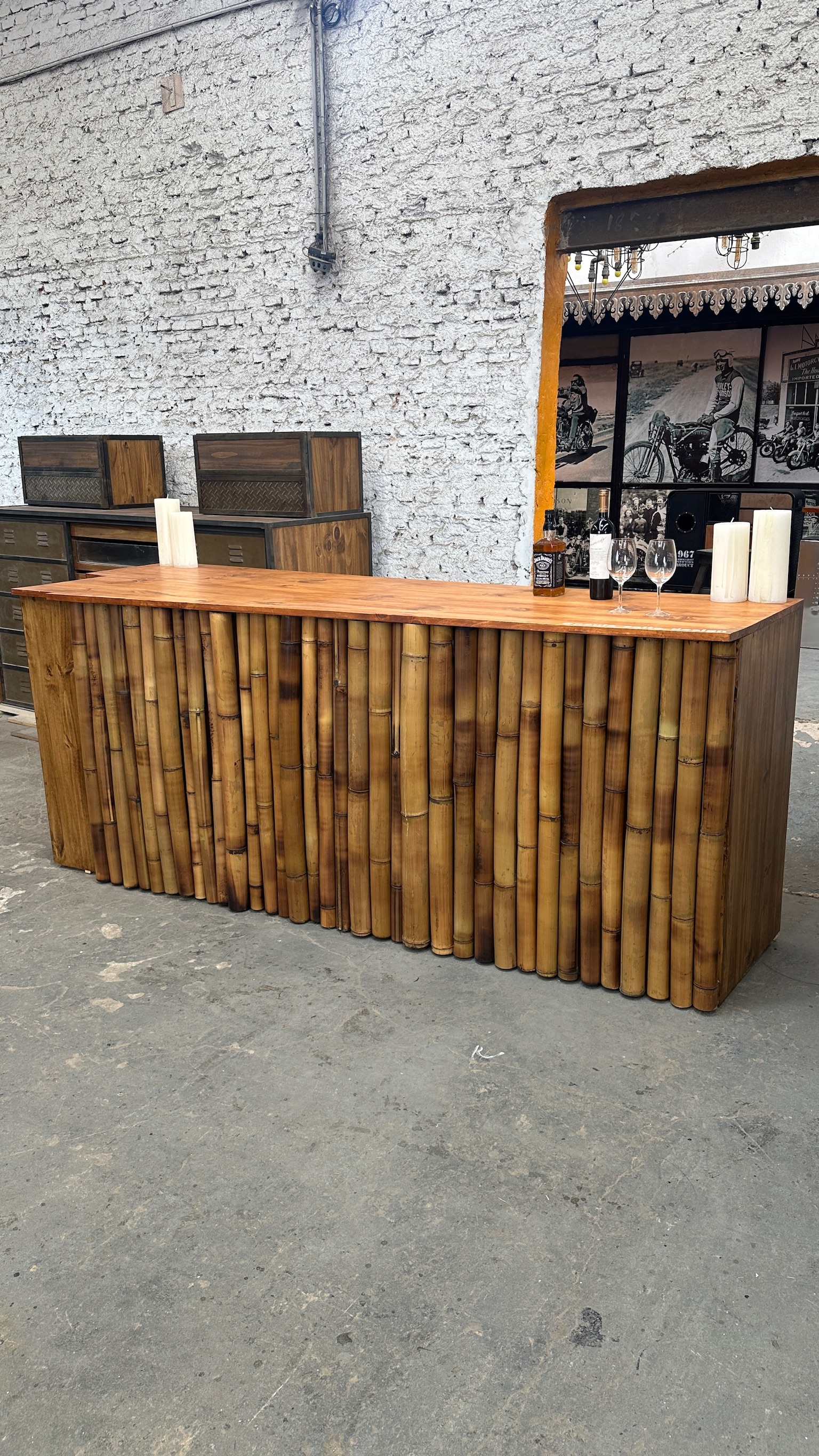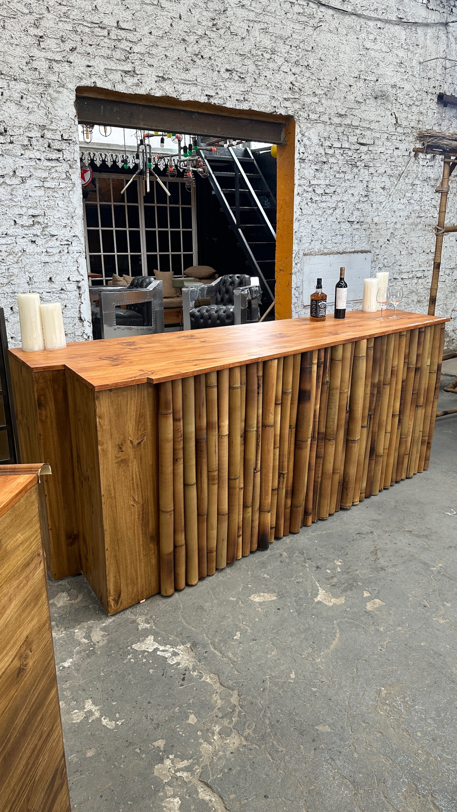 cubre heladera d madera con un exterior cubierto de cañas de bambu de distintos grosores