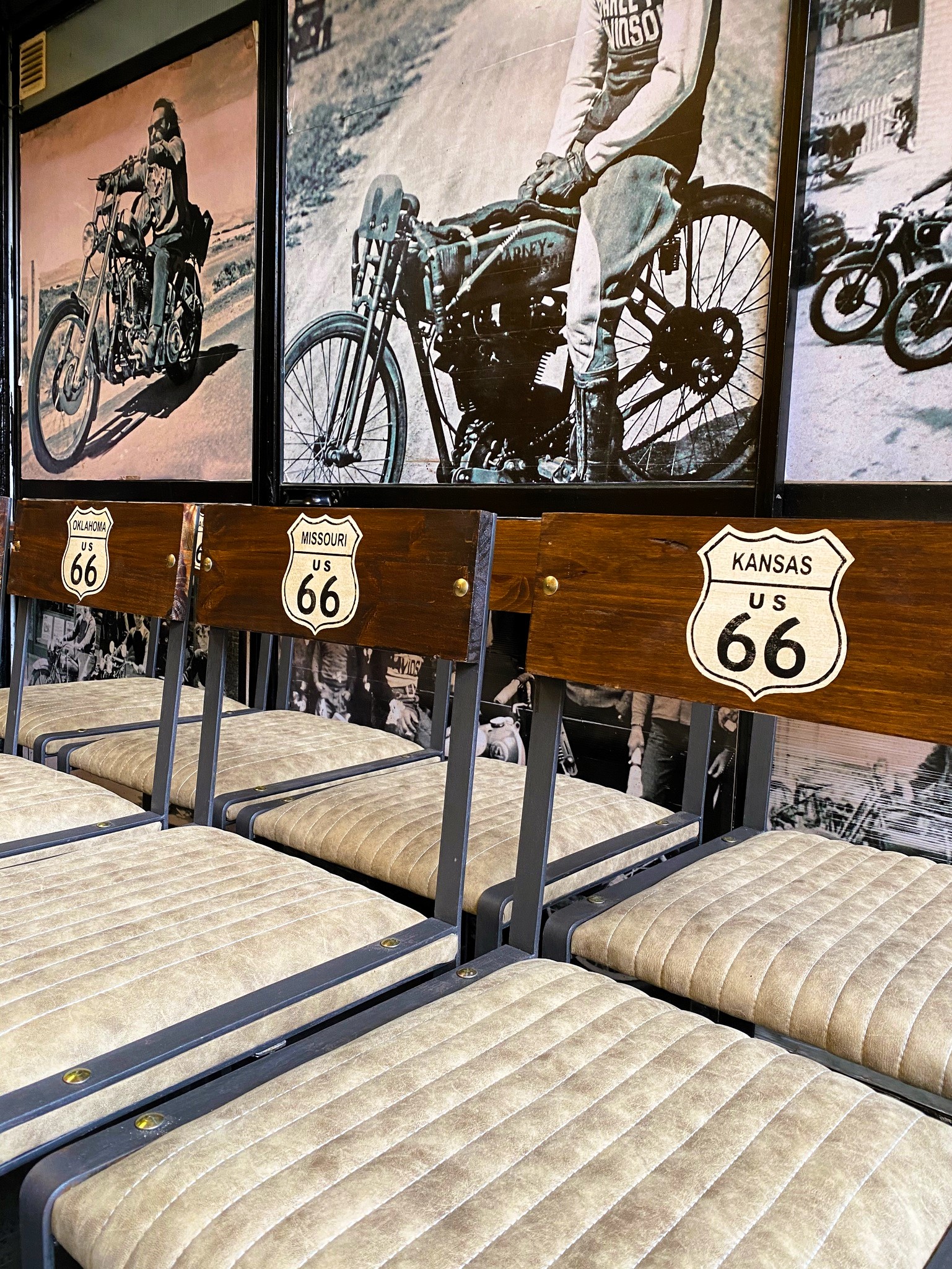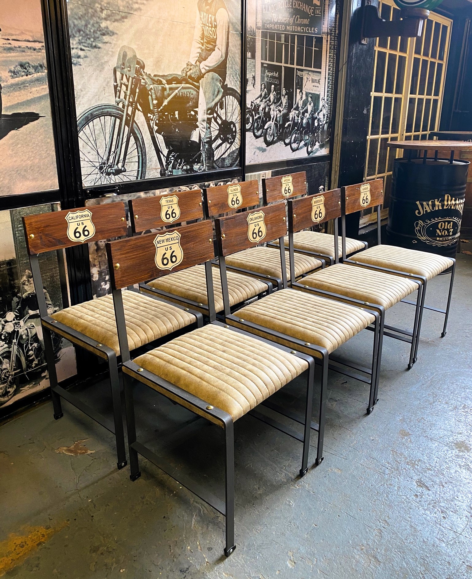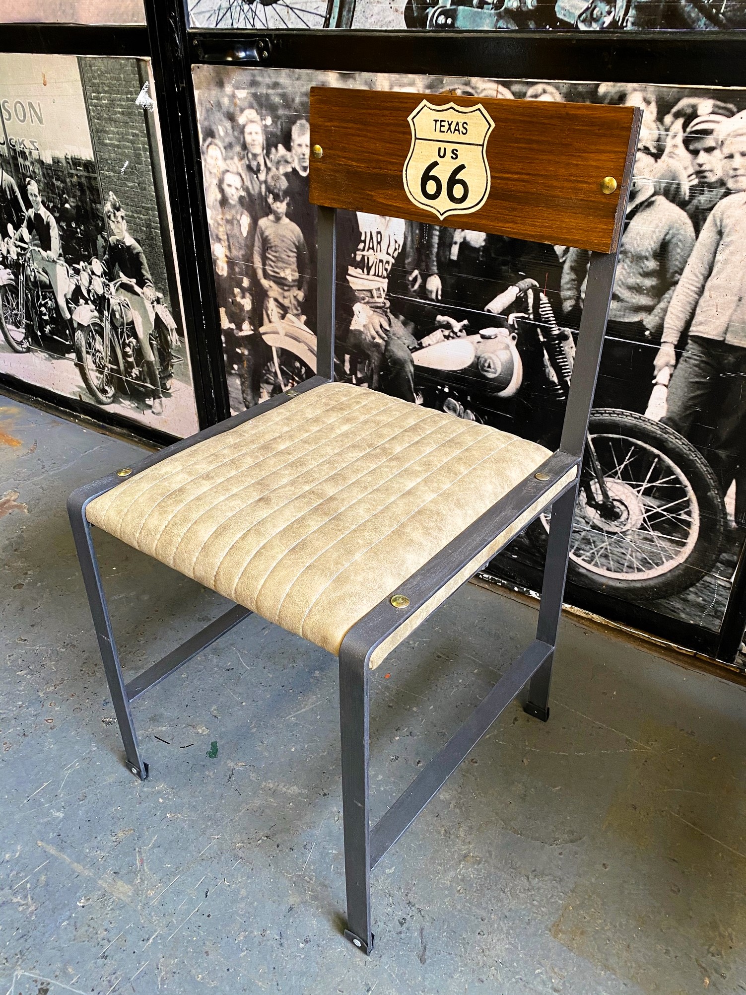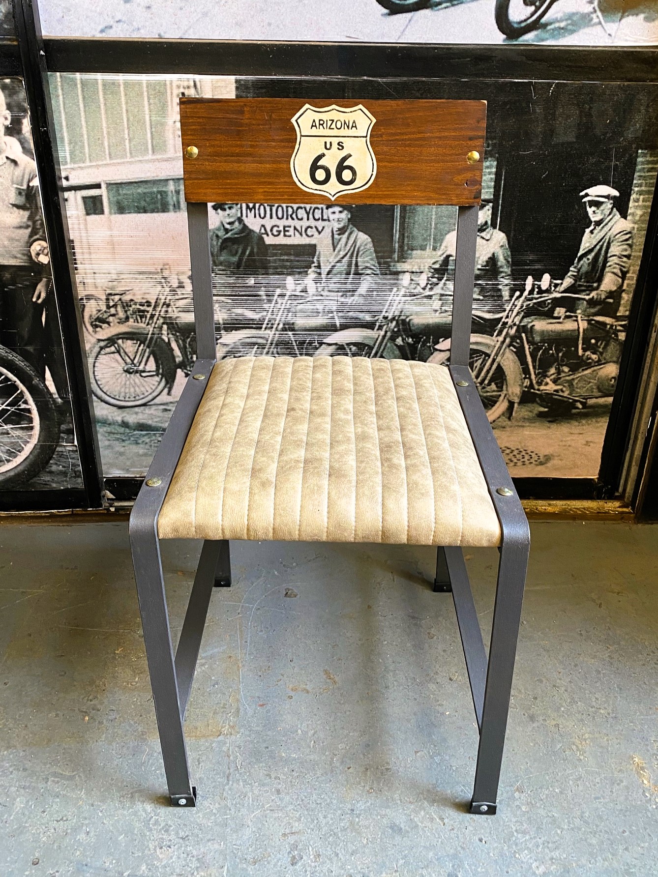 Silla lounge de hierro con respaldo de madera y asiento tapizado con cuero blanco.