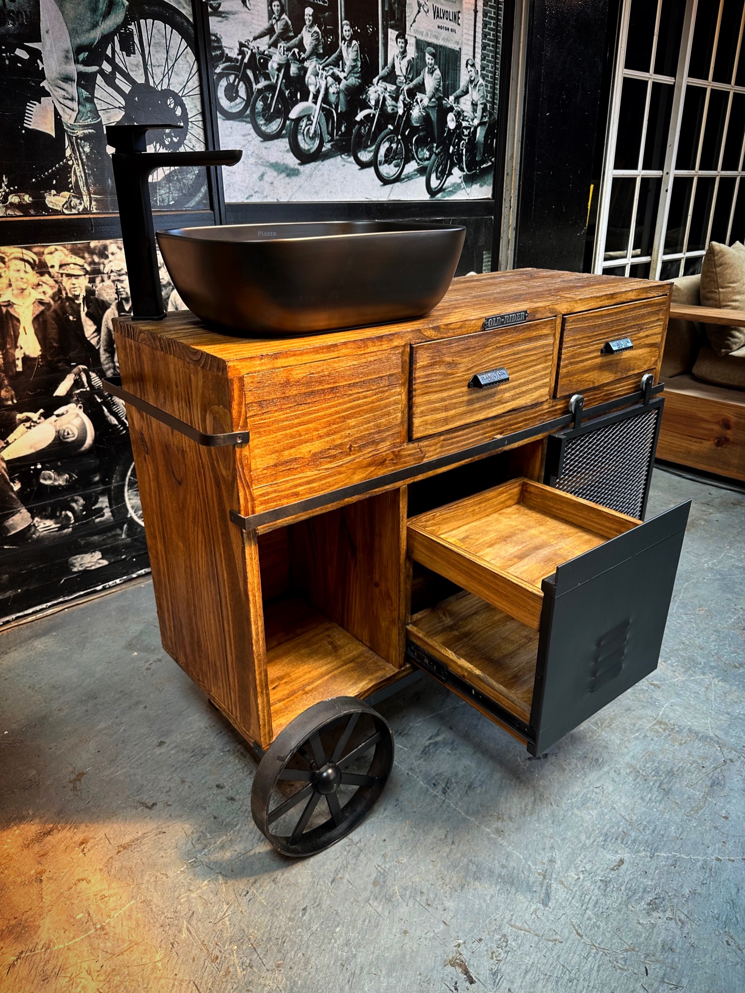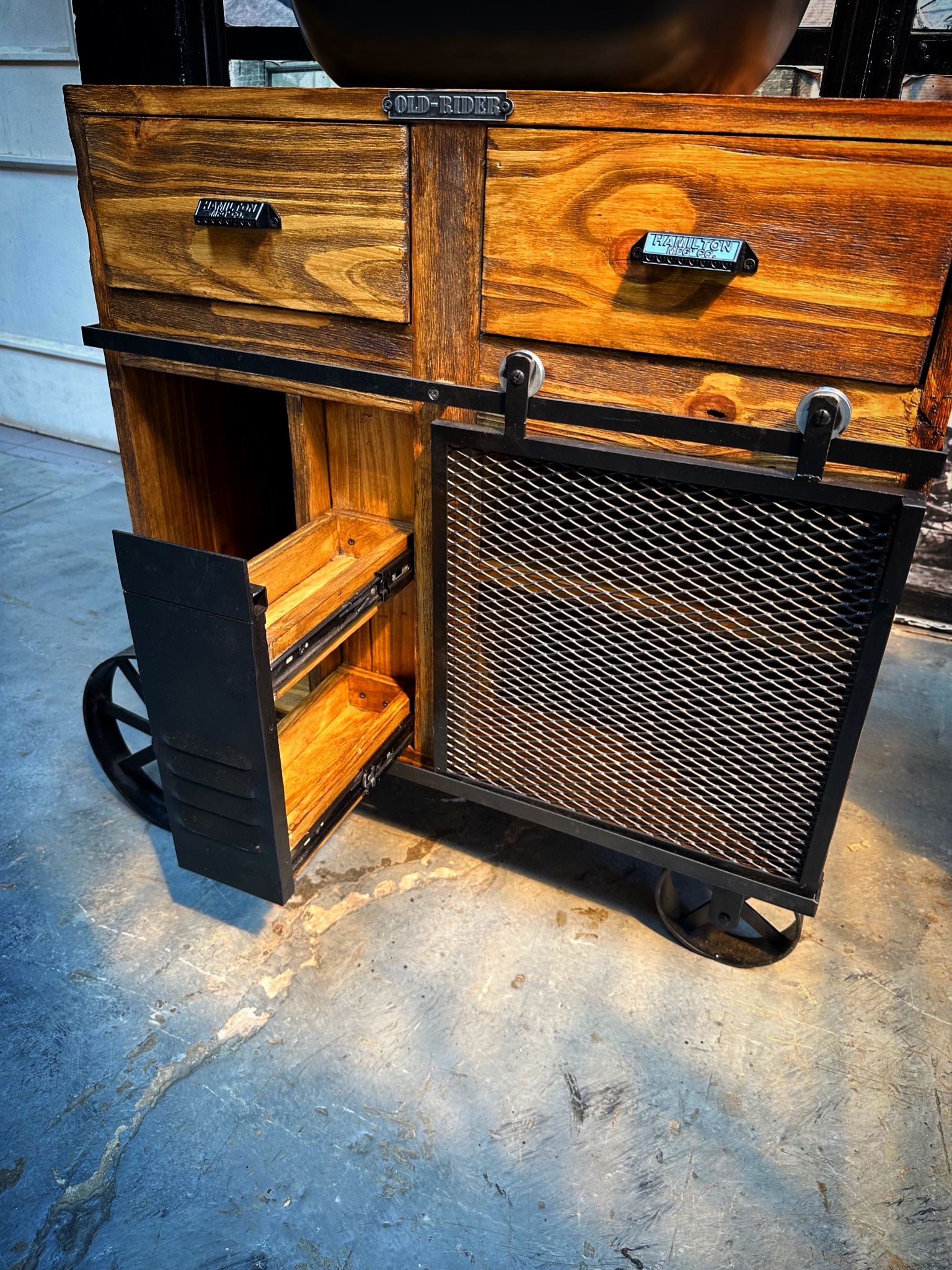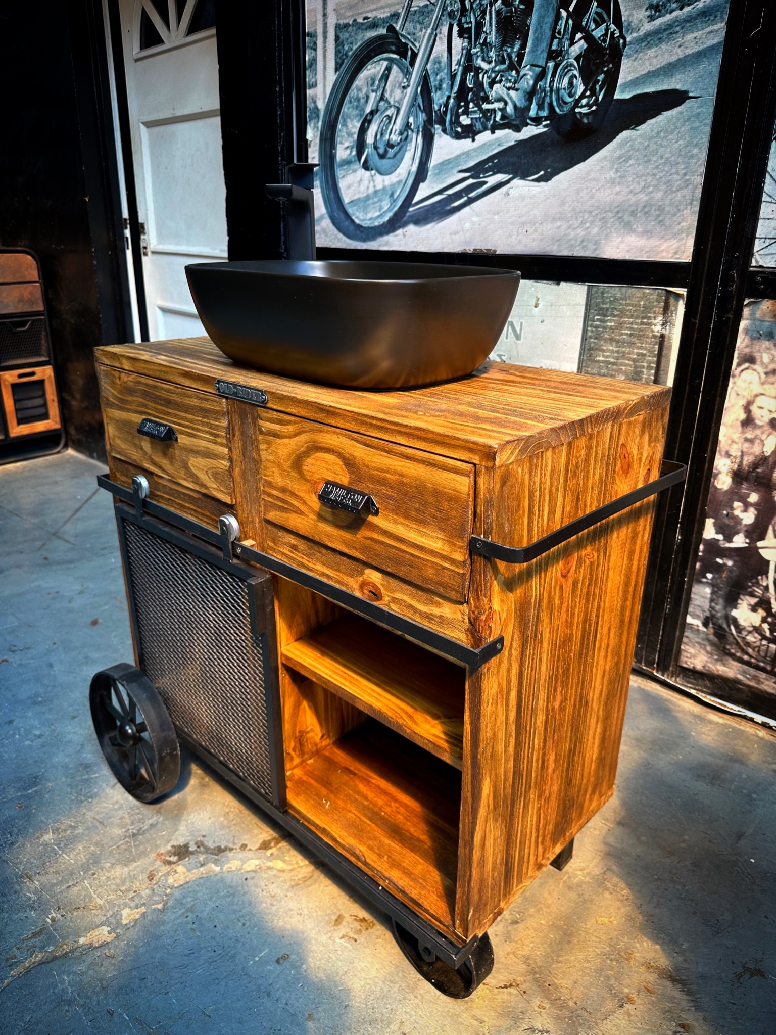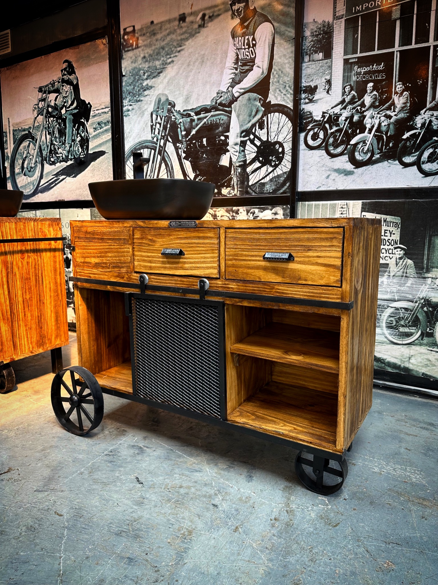 vanitory de madera con puerta granero, cajones estantes y ruedas.
