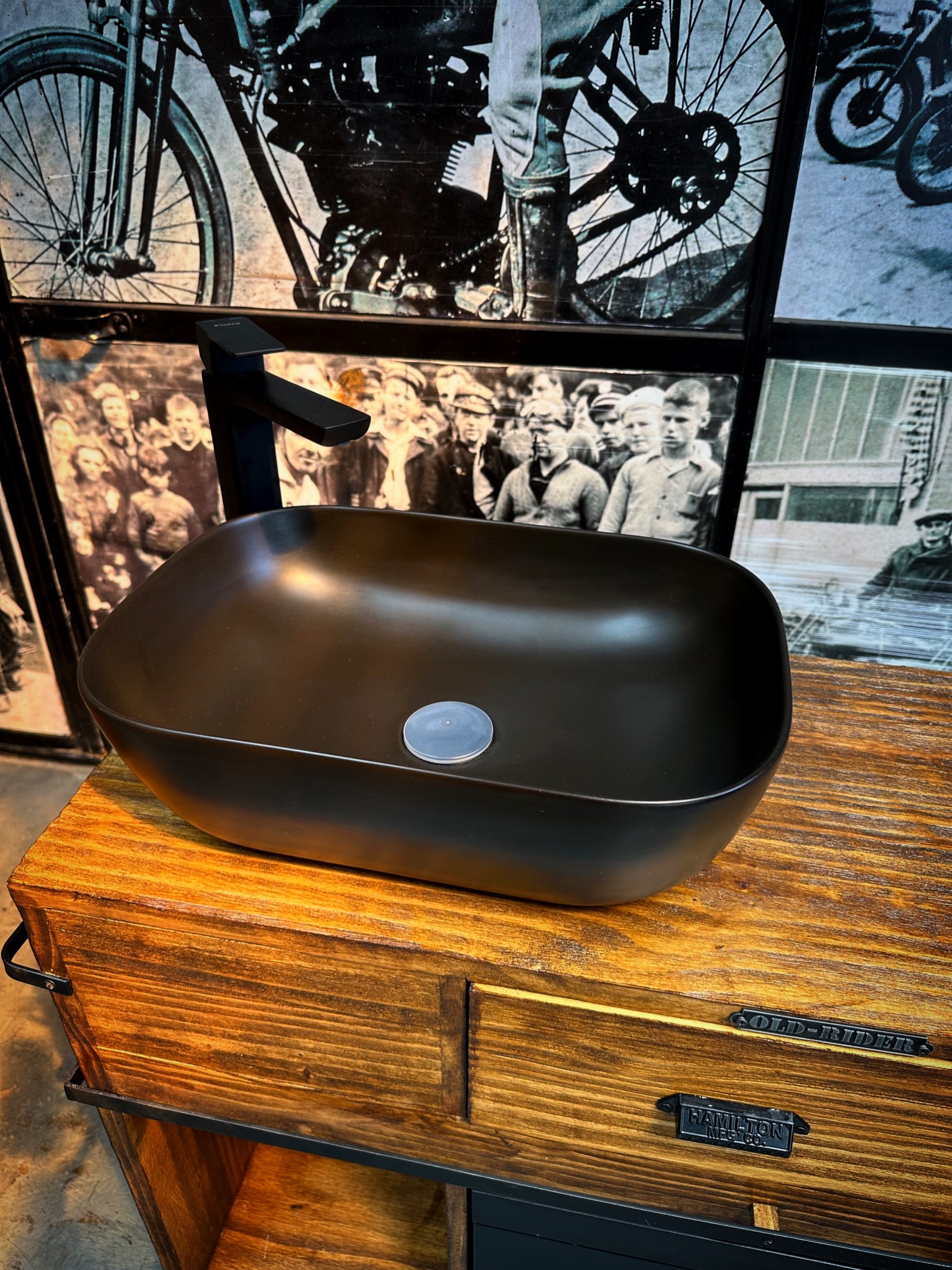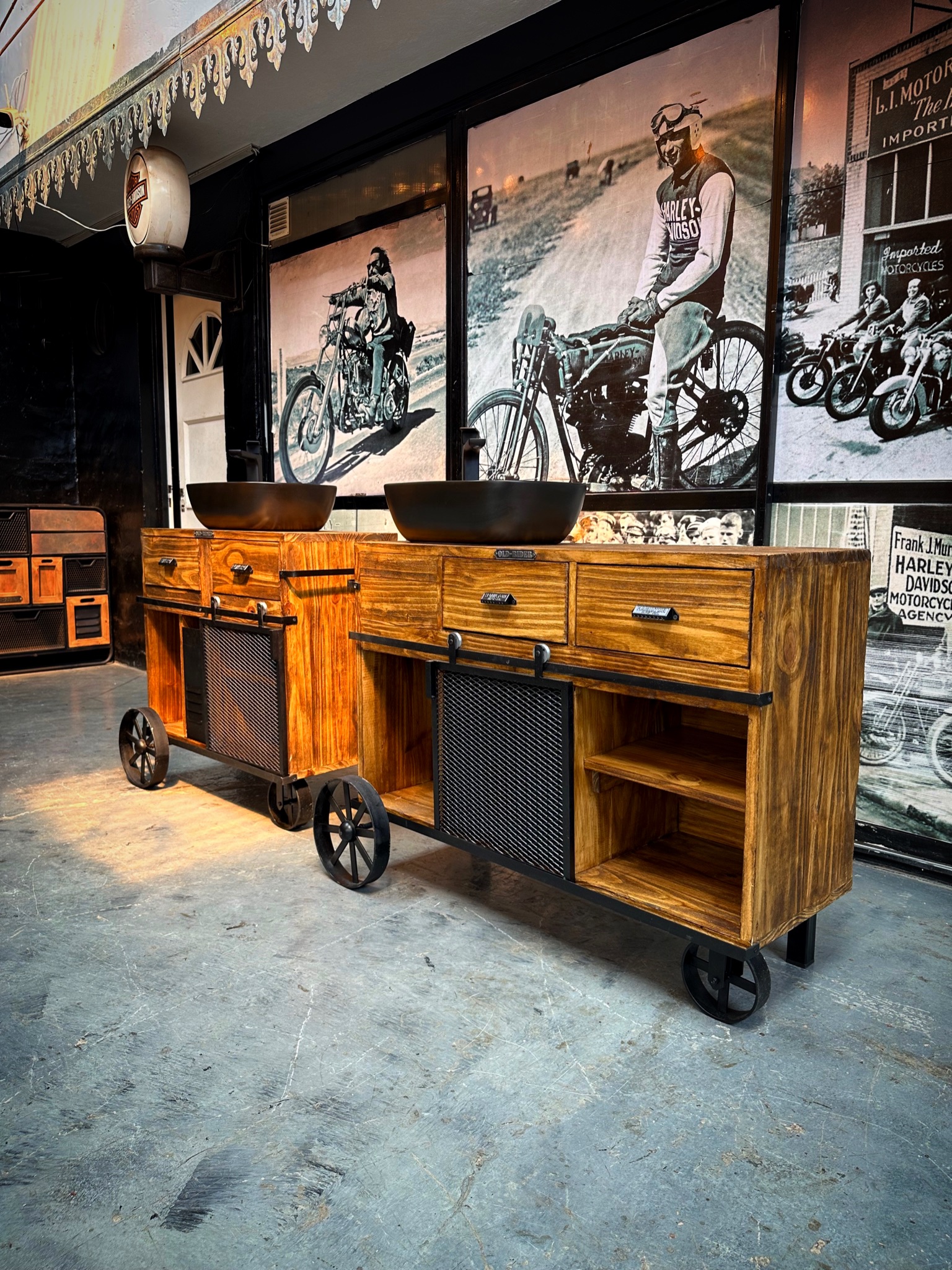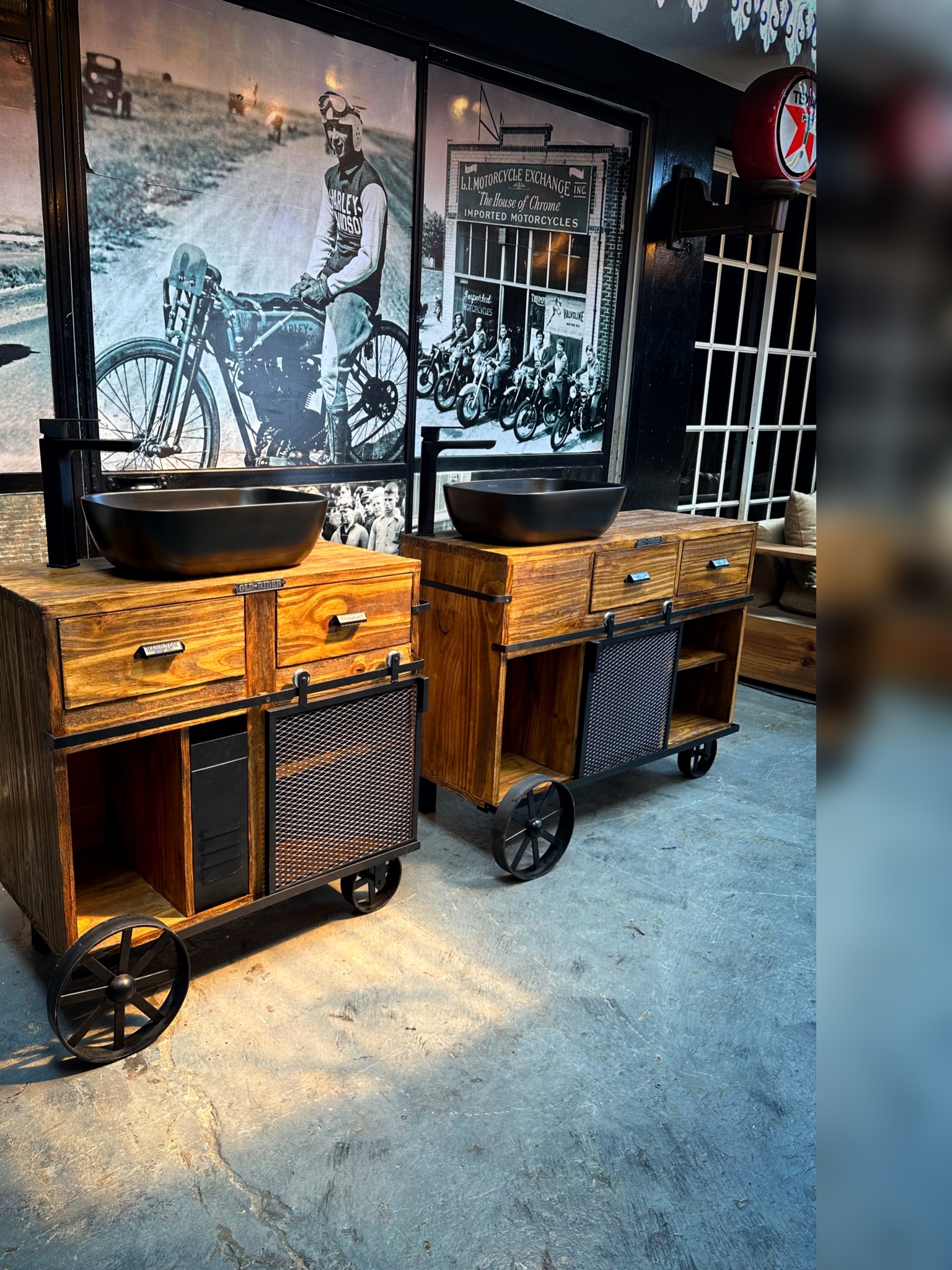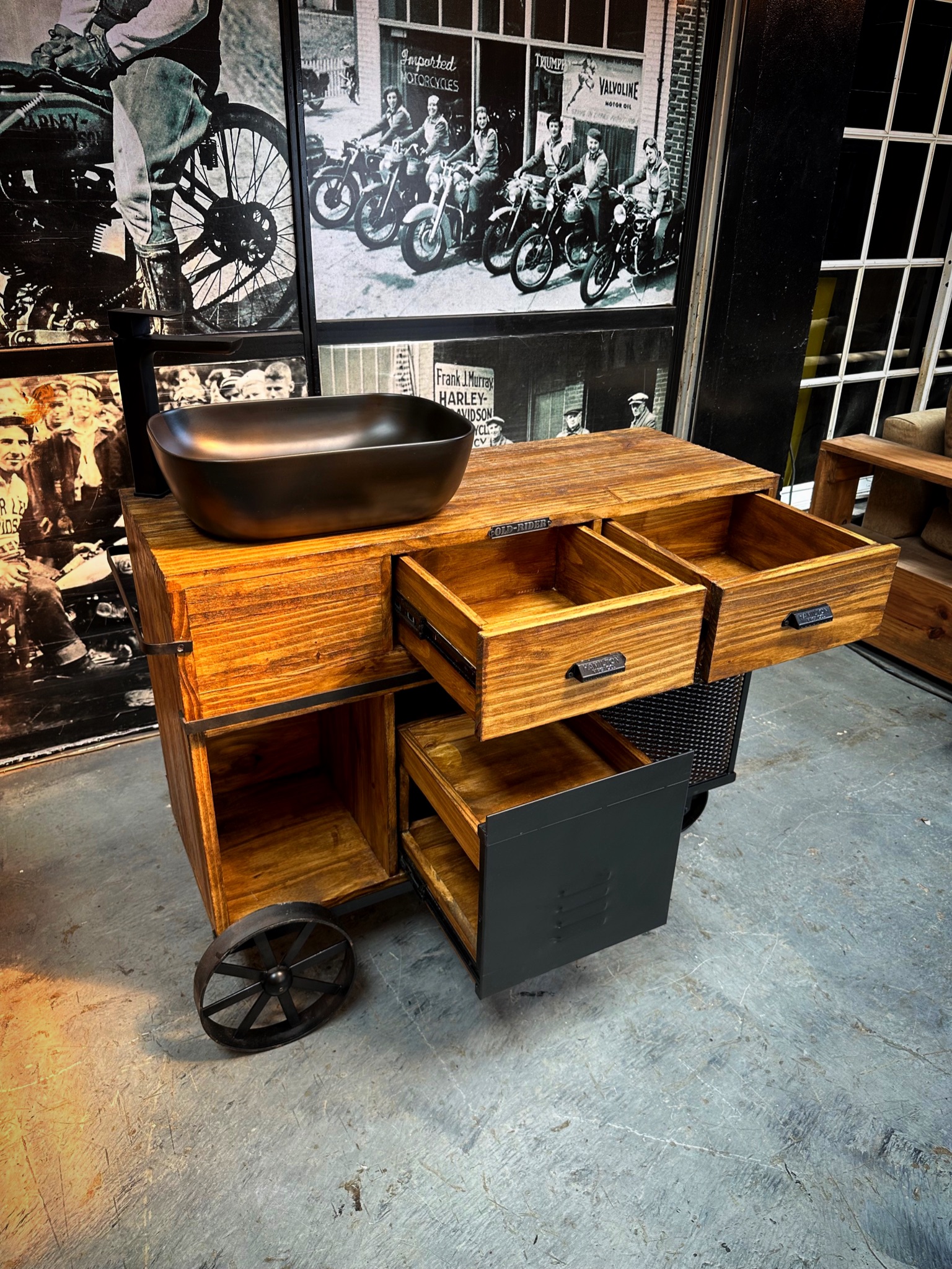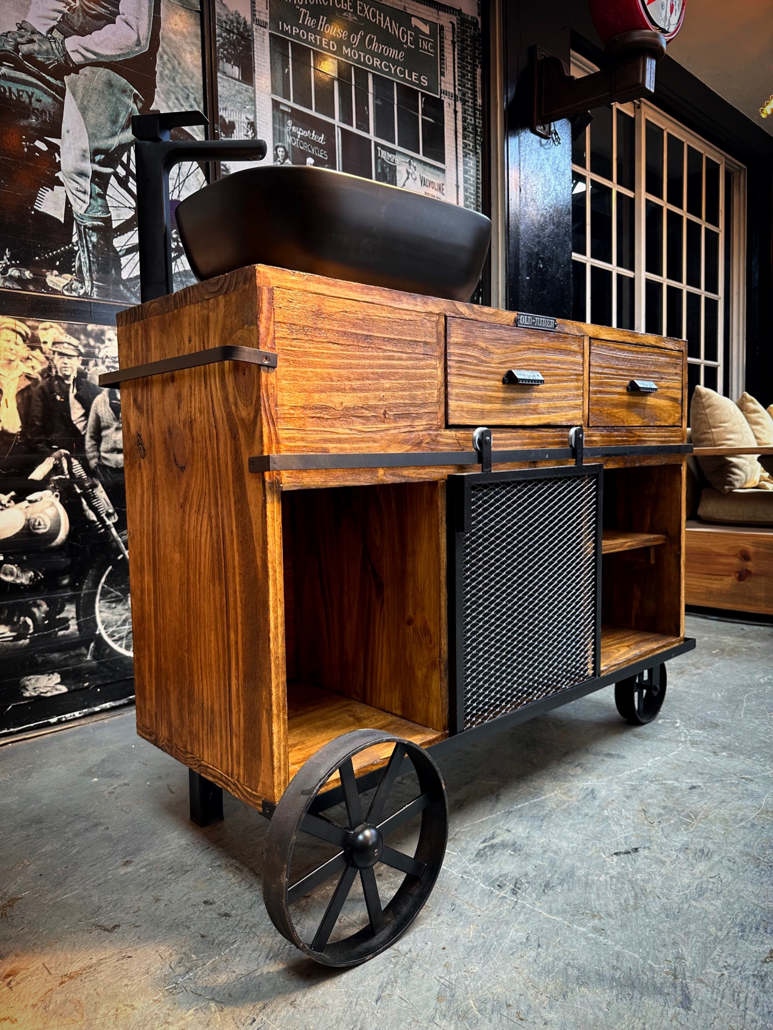 vanitory de madera con puerta granero, cajones estantes y ruedas.