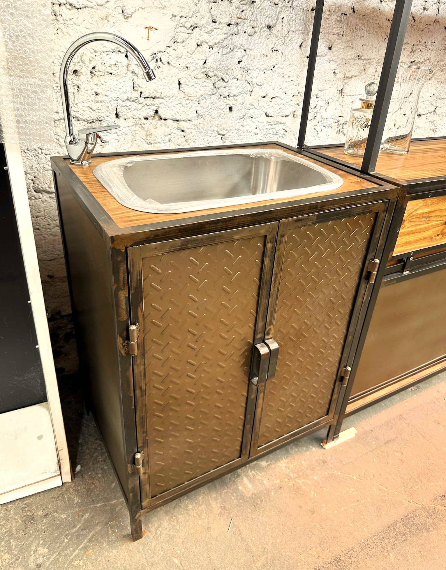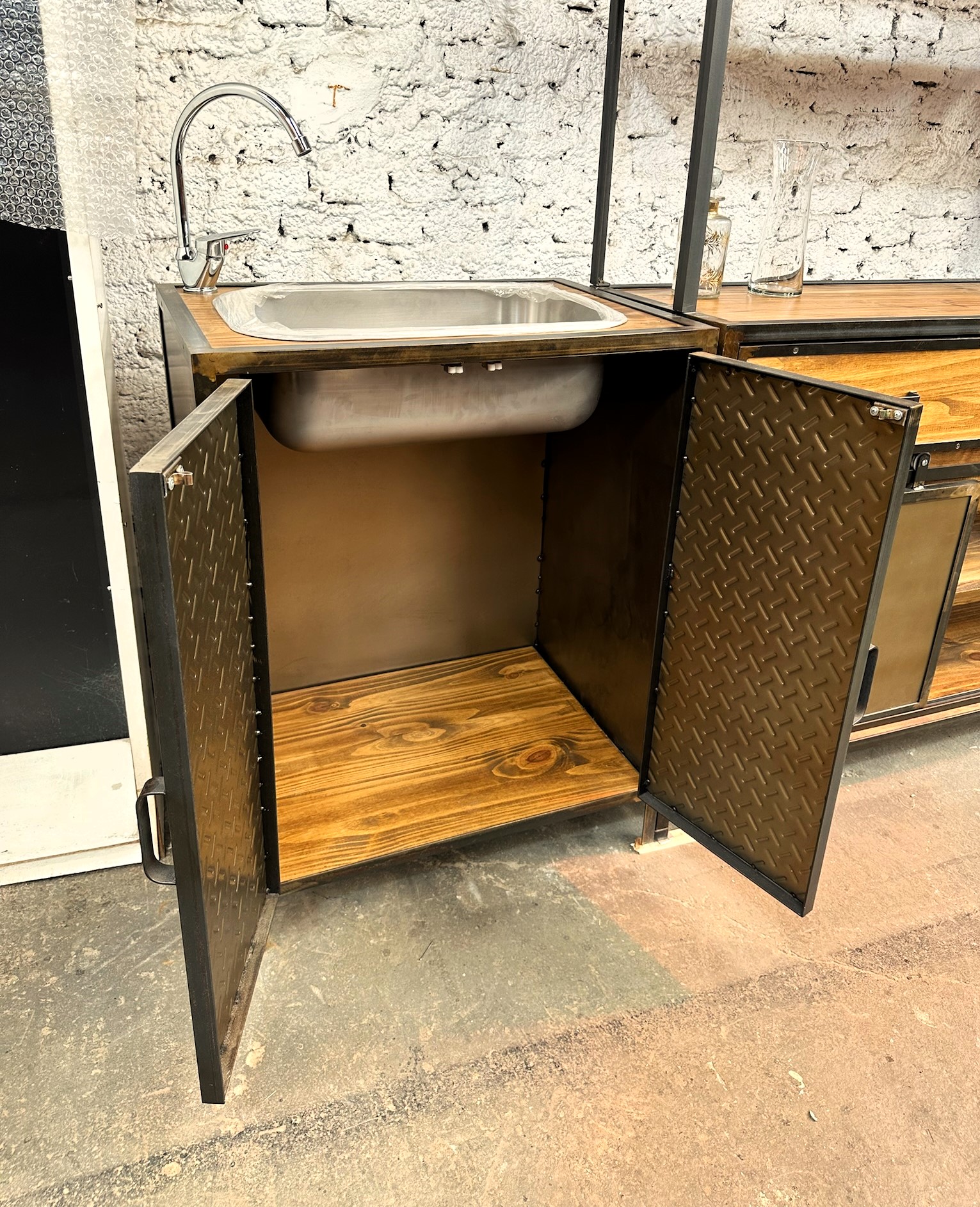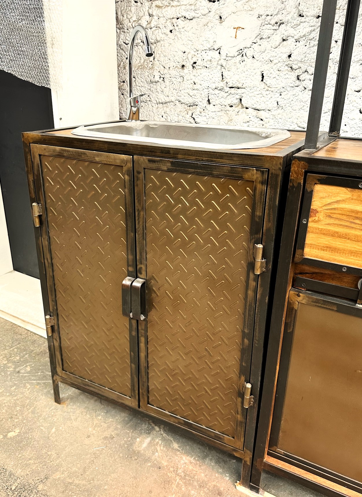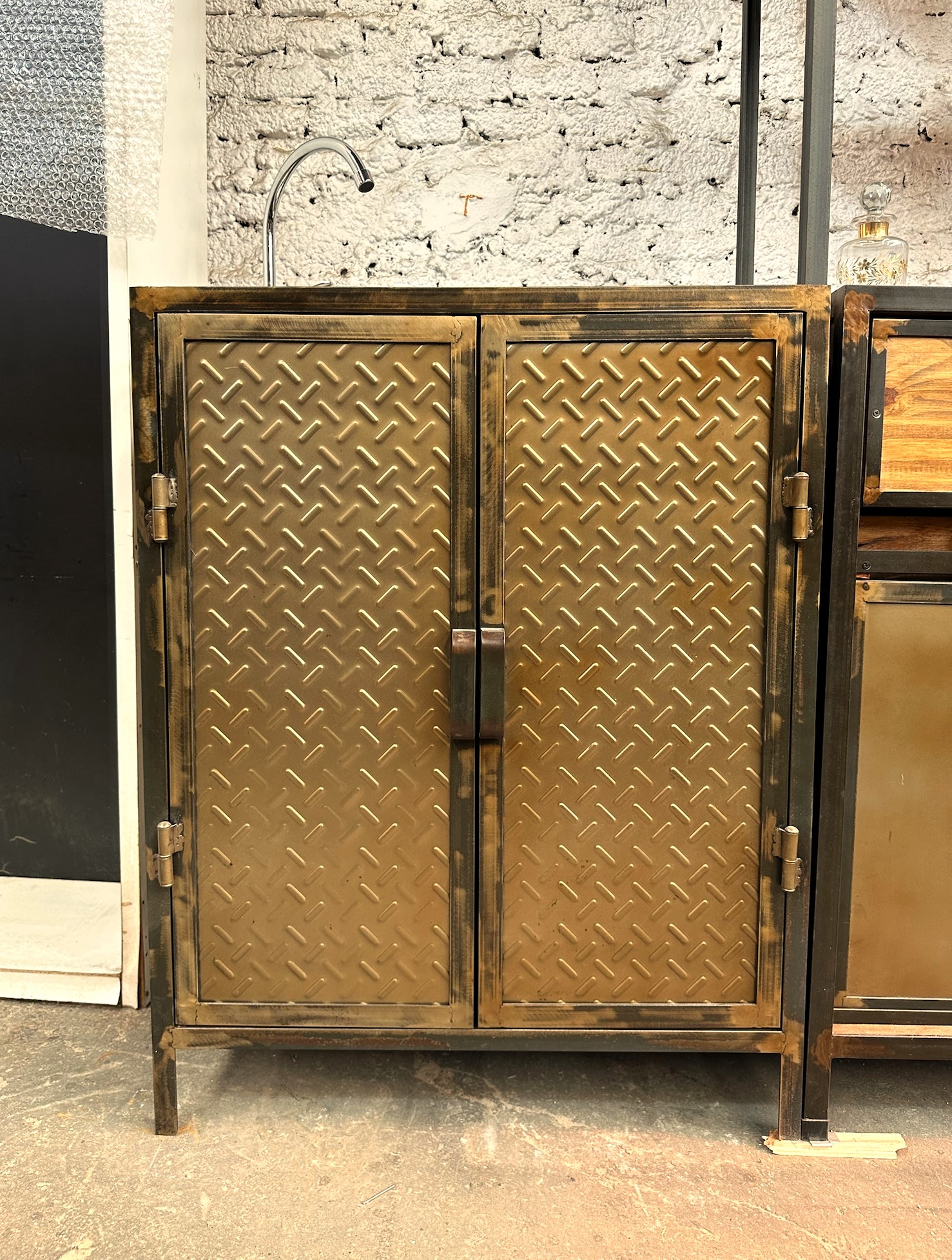 Vanitory de madera con estructura de hierro y puertas de chapa. color bronce