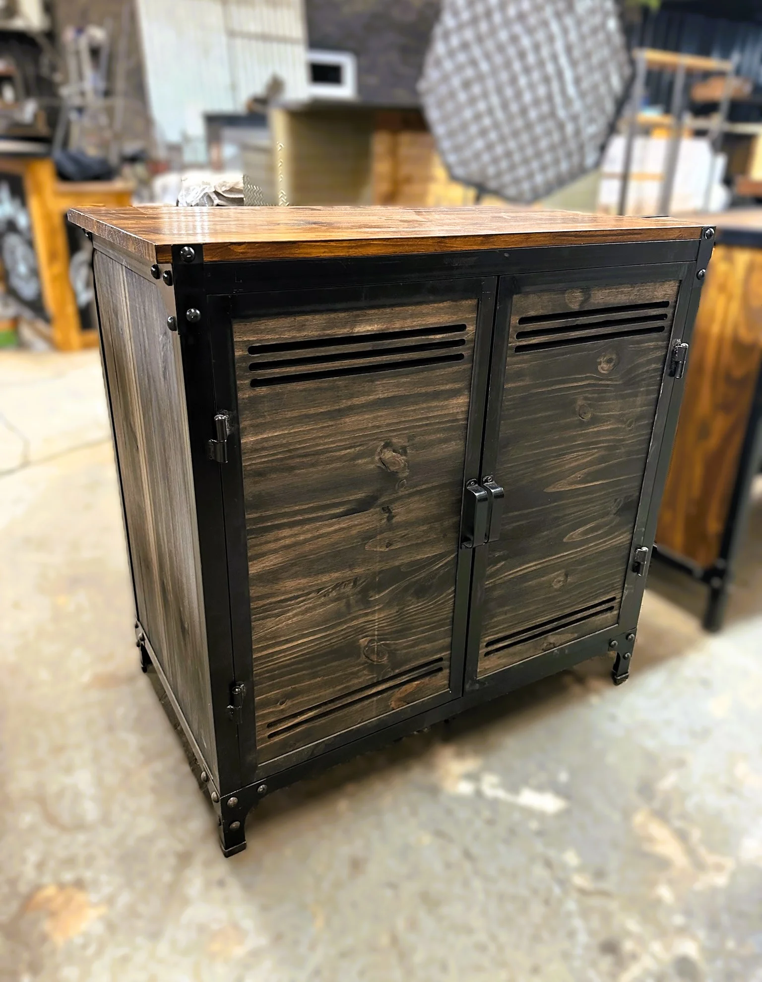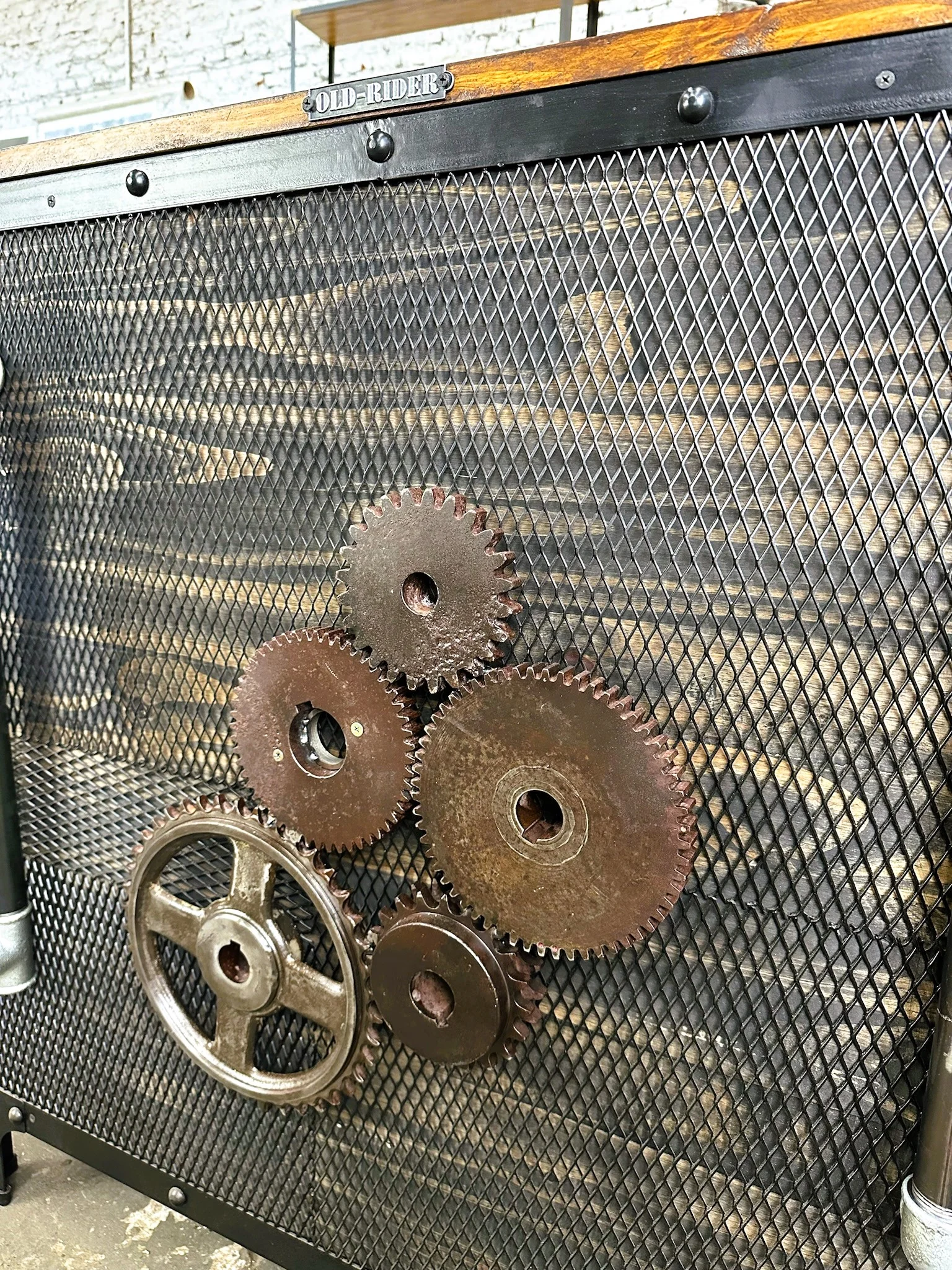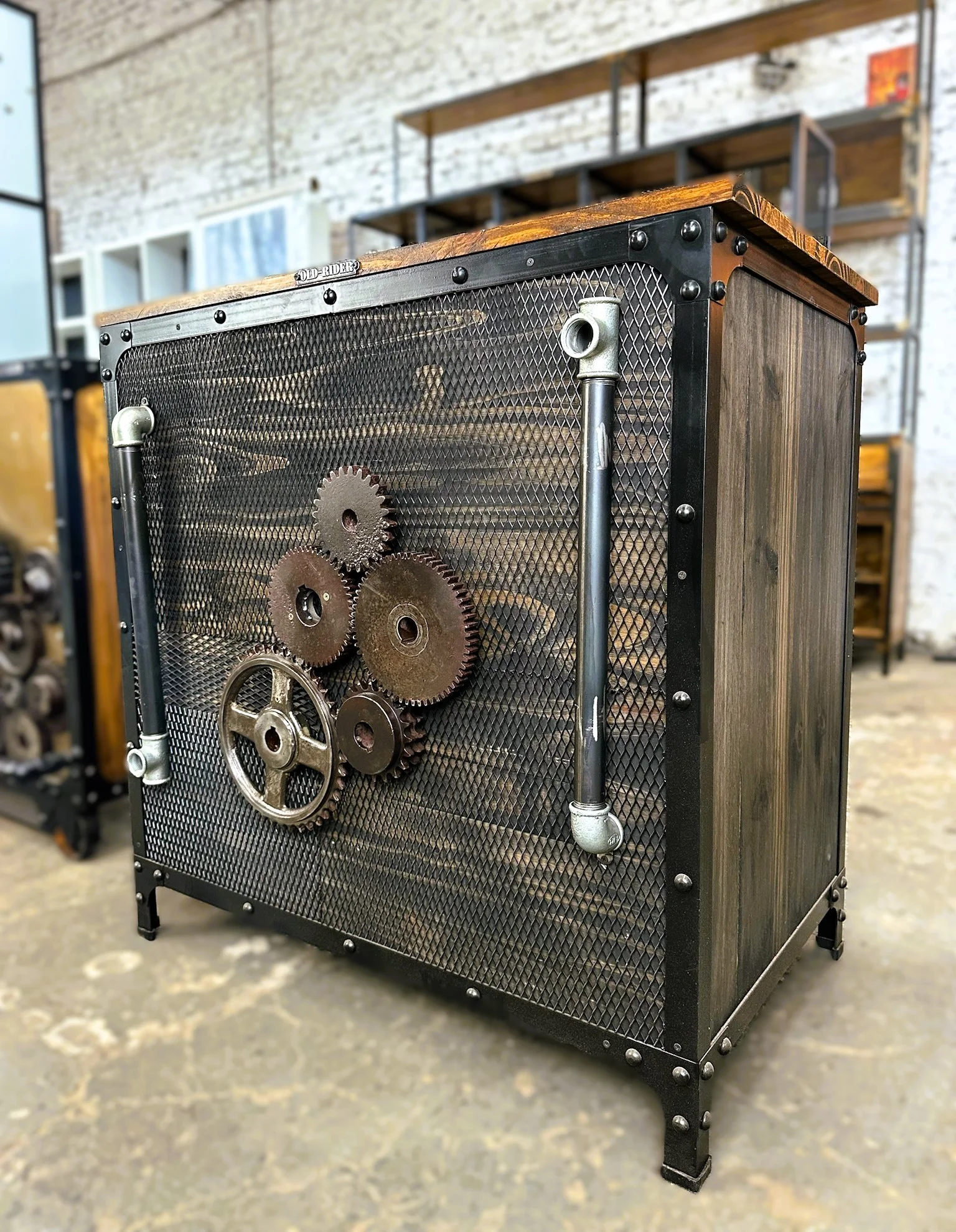 Aparador de madera reforzado con hierro y detalles de engranajes.