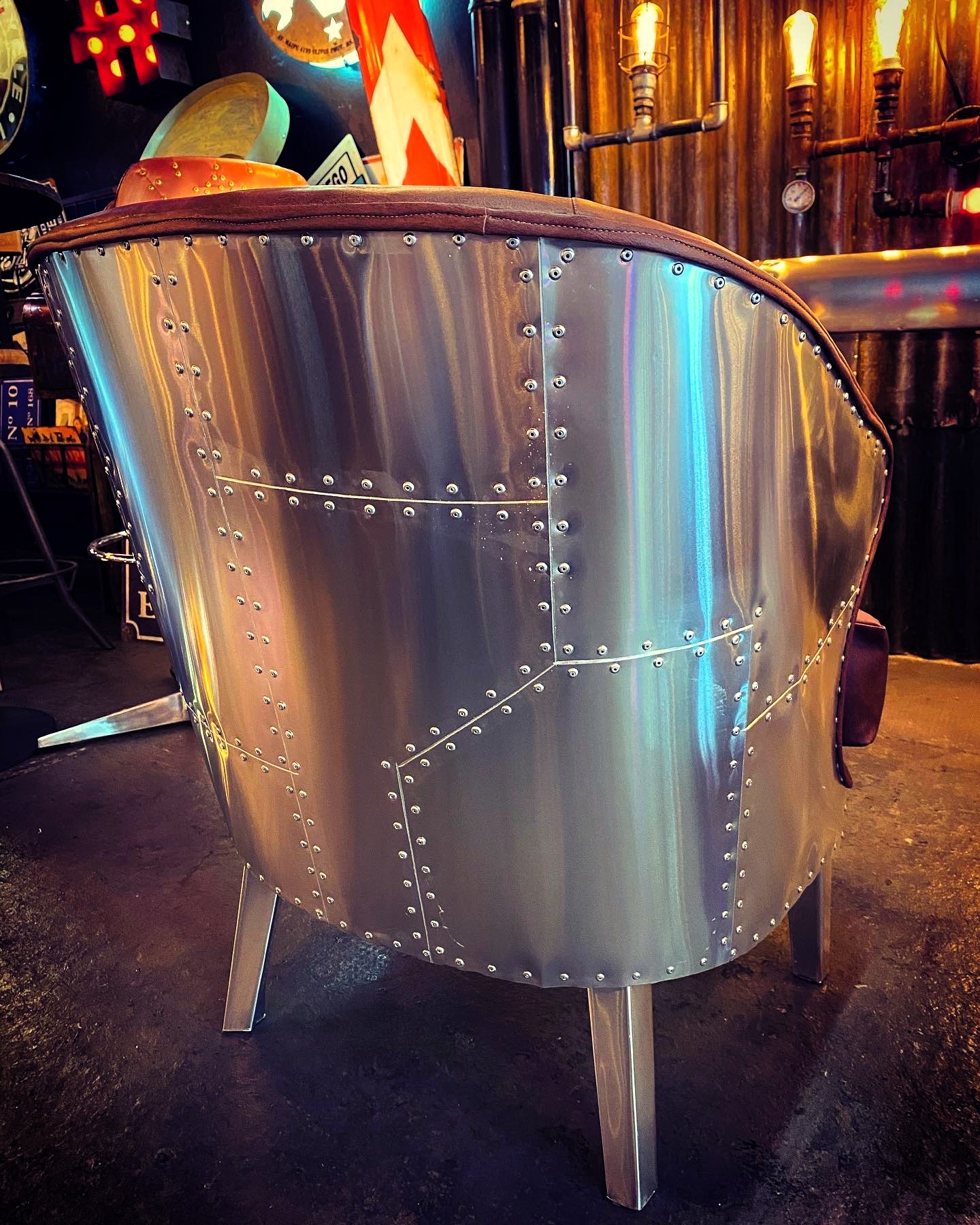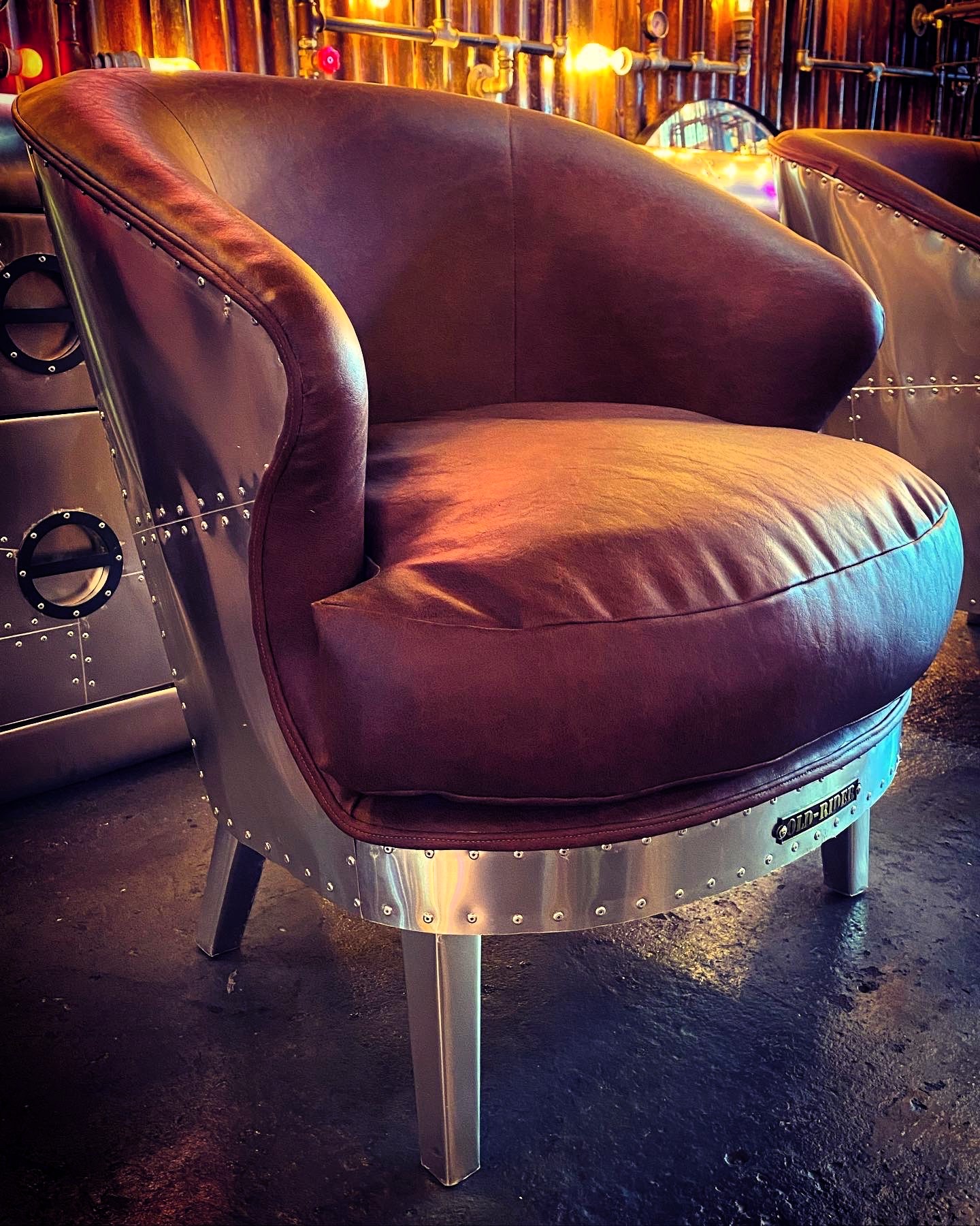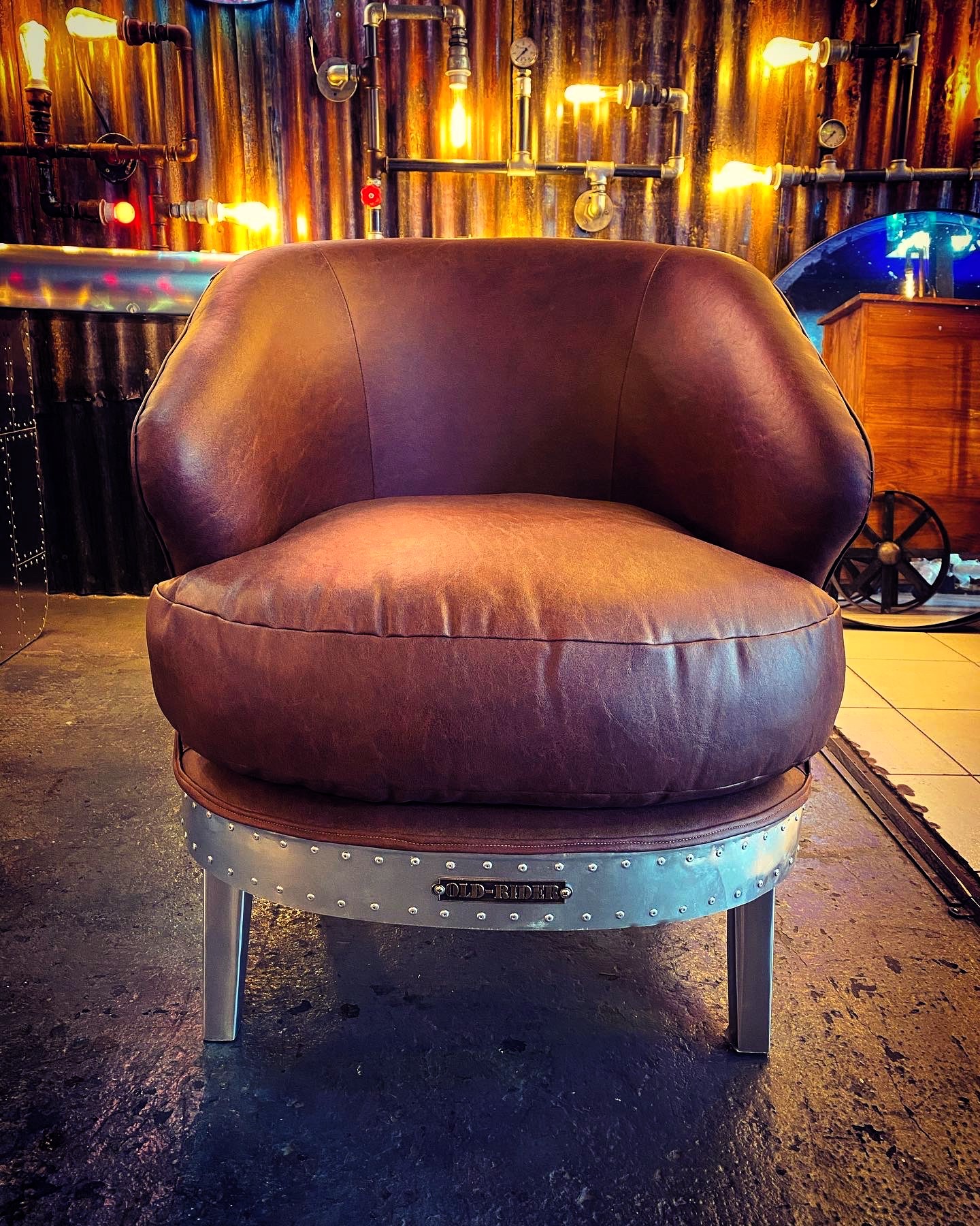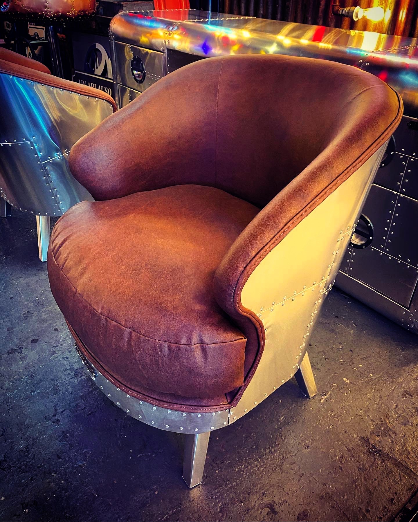 Sillón aviator con estructura metálica curvada y almohadón redondo en cuero.