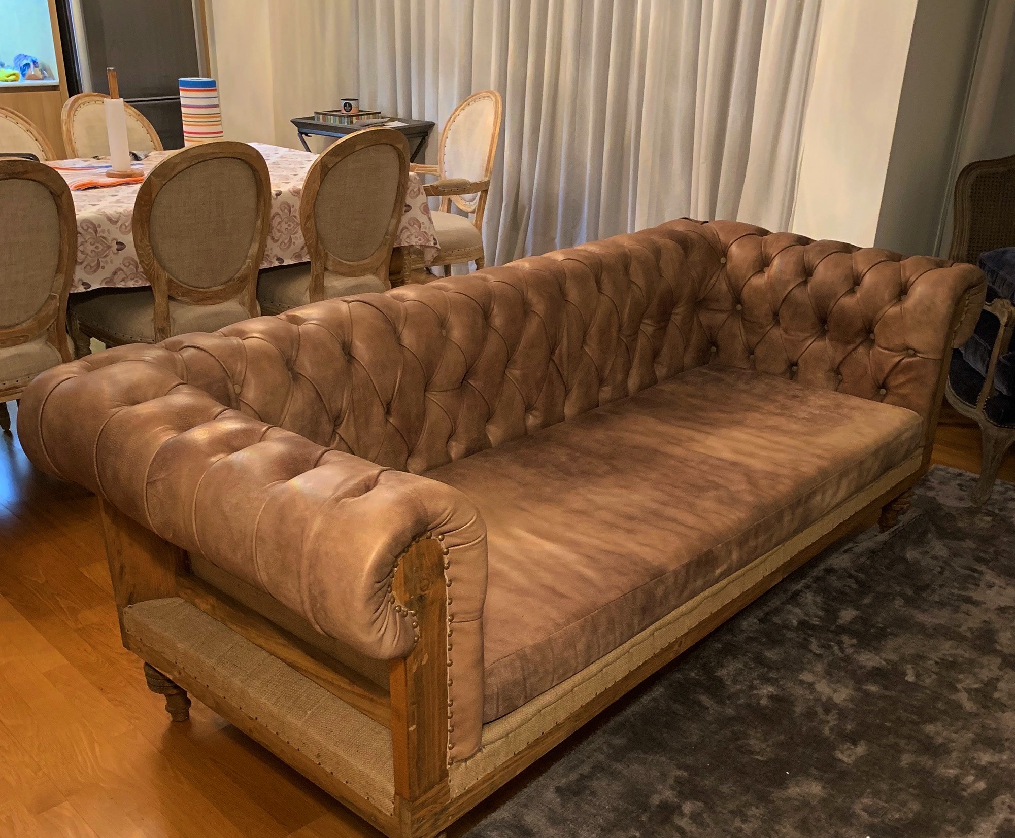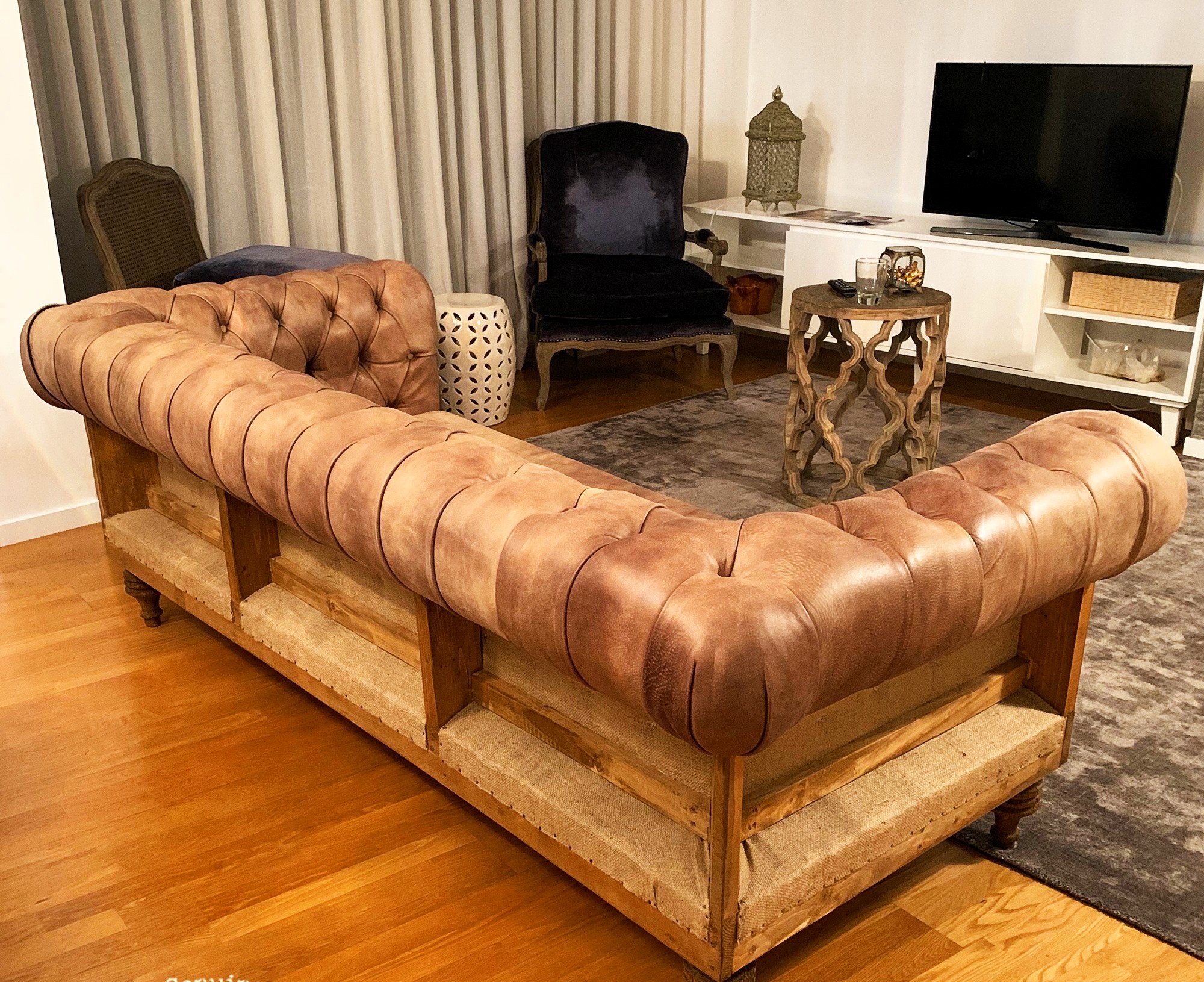 Sillón Chesterfield con cuero capitoné y base de madera expuesta