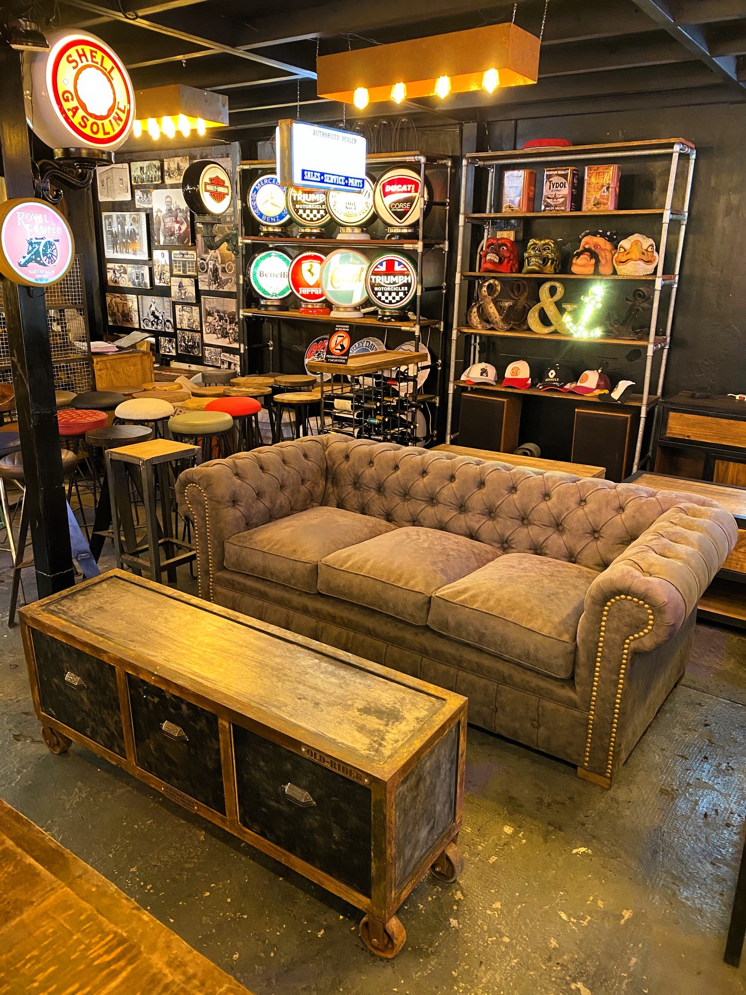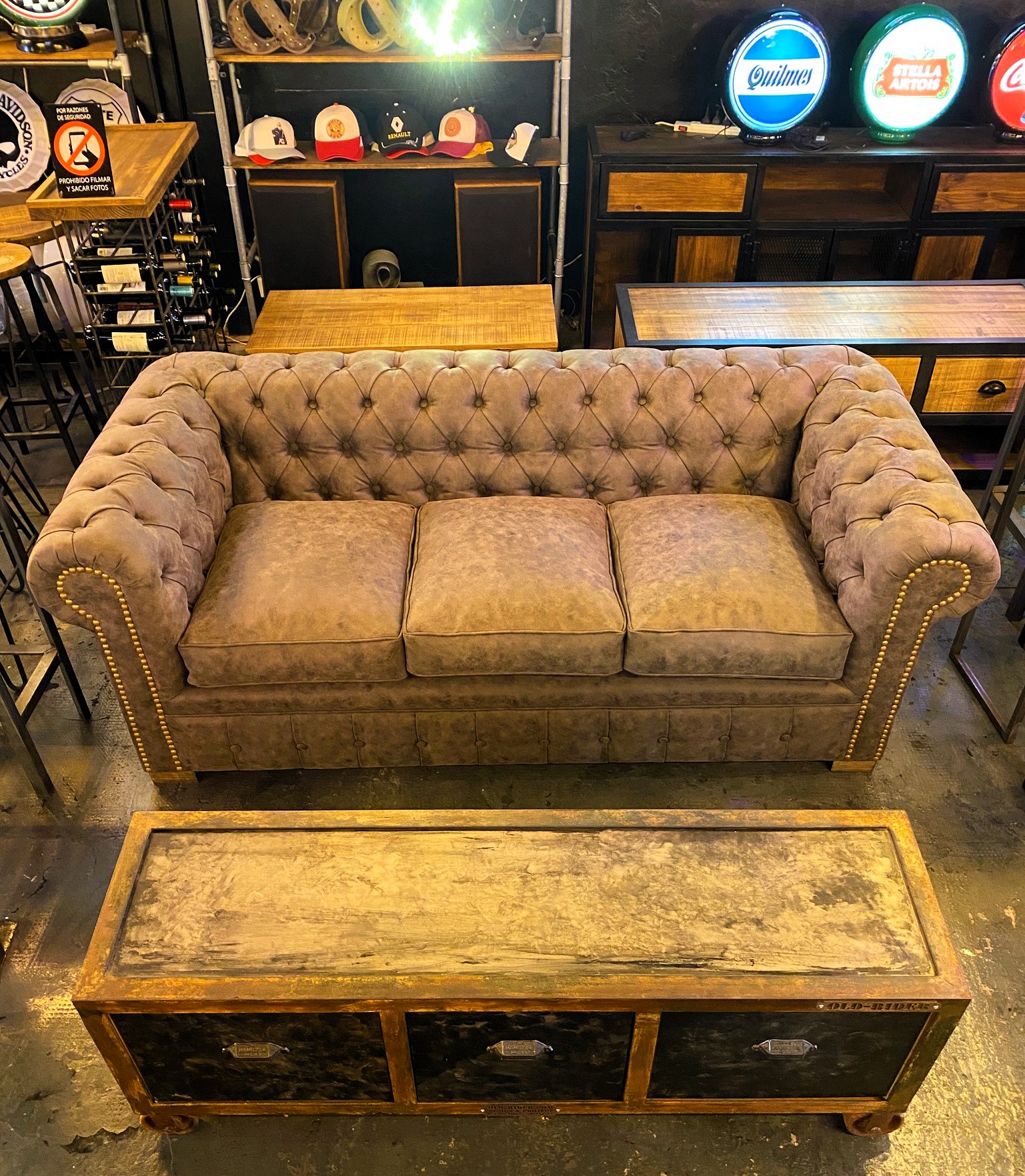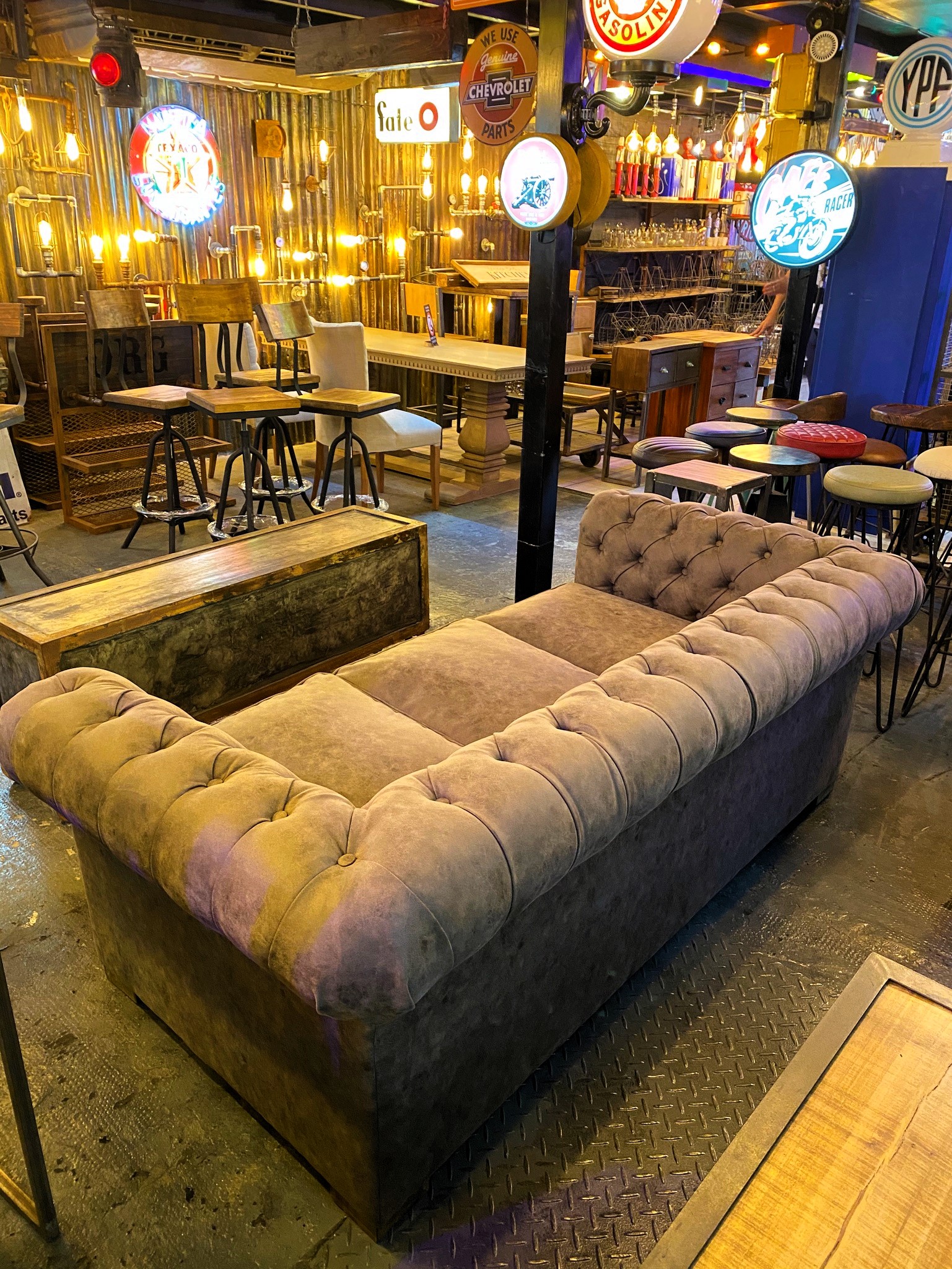 Sillón capitoné 3 cuerpos con tapizado en gamuza y tachas doradas.