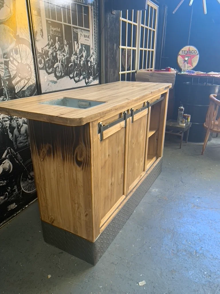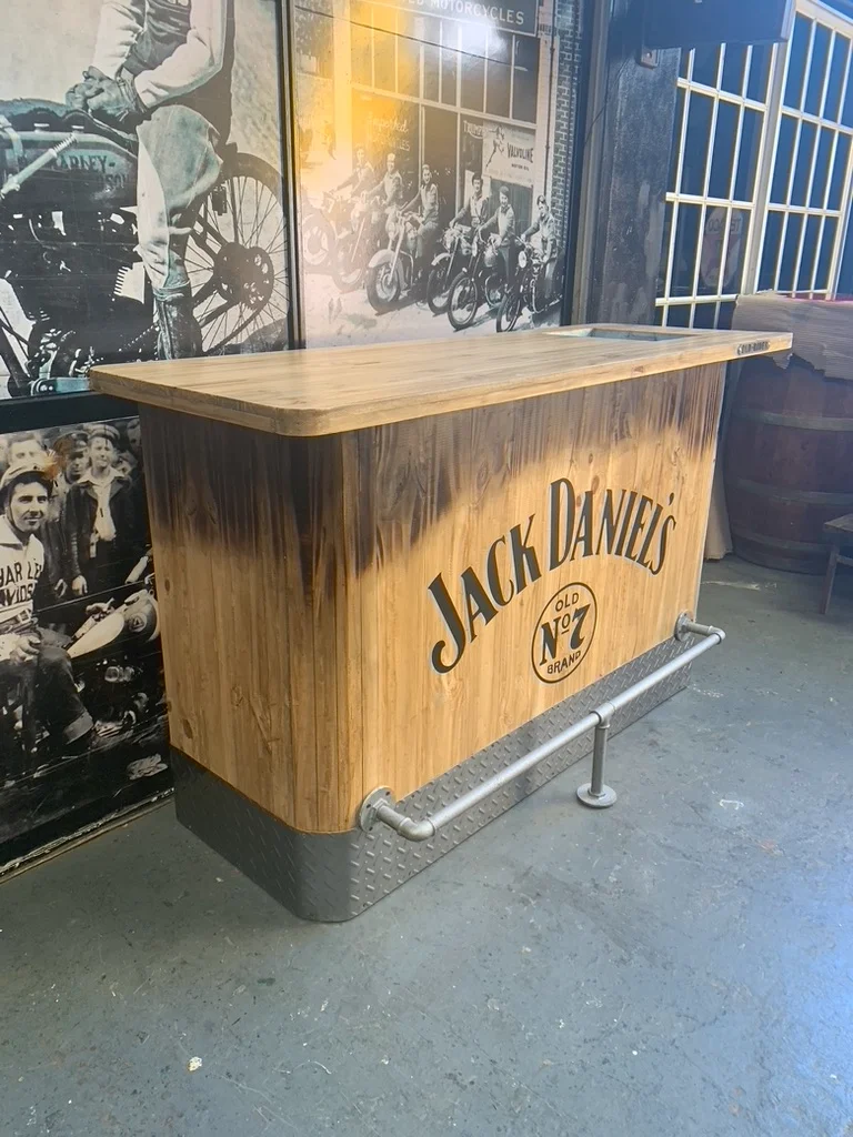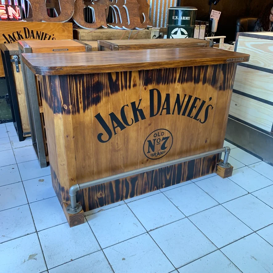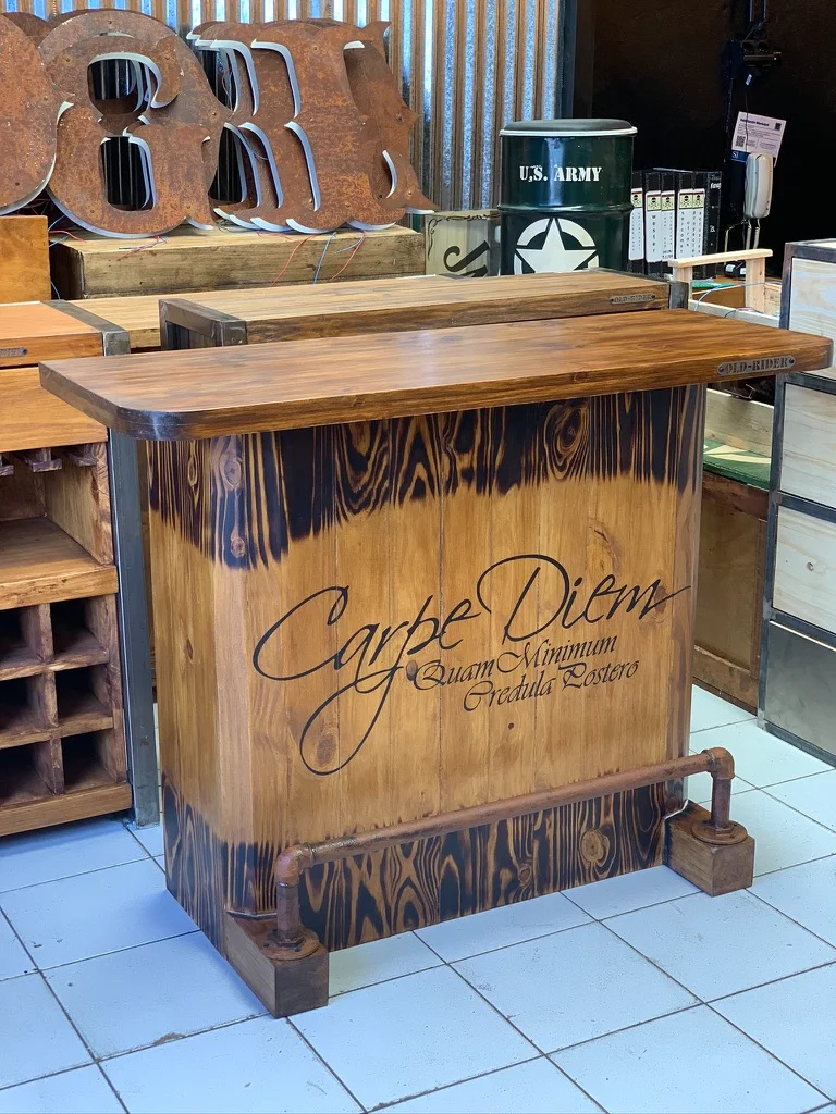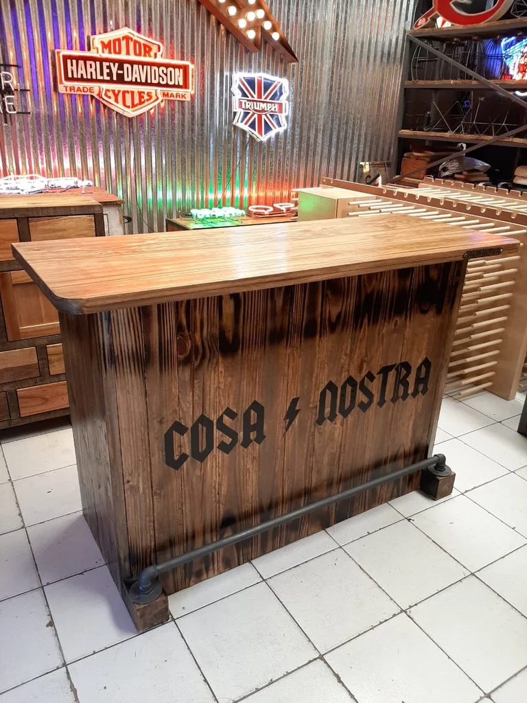 Barra en madera eco lisa con terminación quemada que resalta sus vetas naturales. Frente con gráfica personalizada y caño apoya pies que aporta funcionalidad y carácter. Totalmente personalizable.