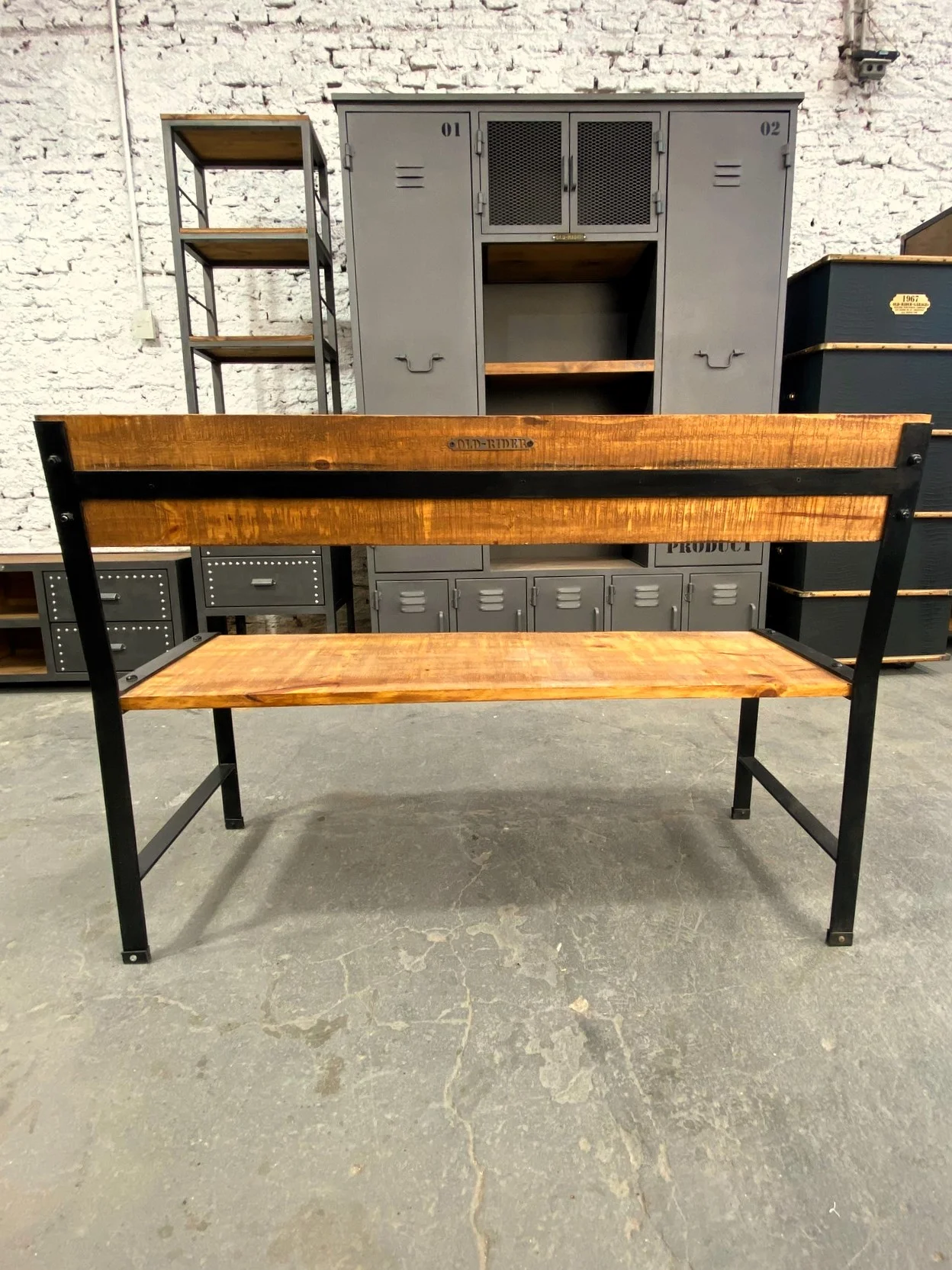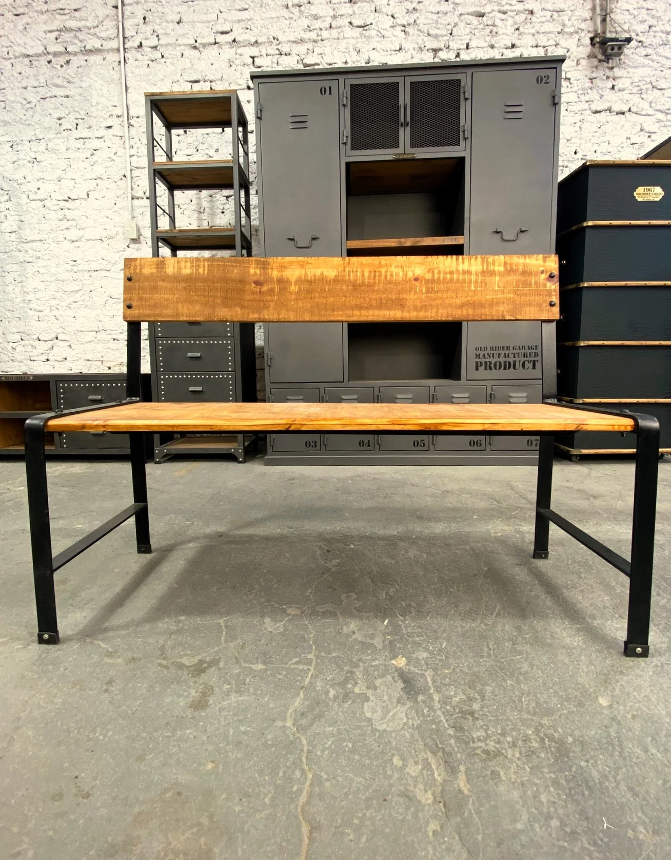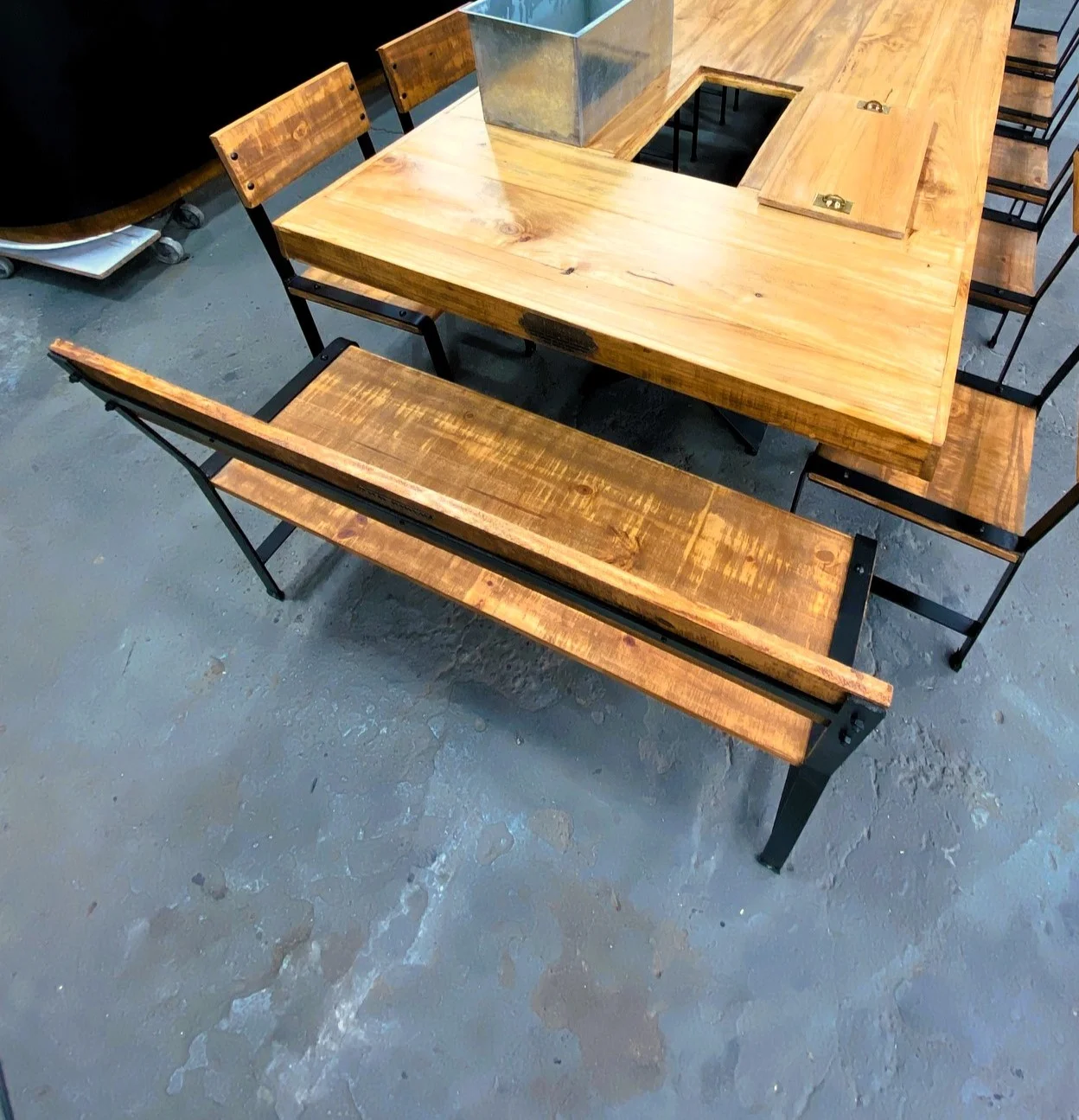 Banco rústico de madera con planchuelas y patas de hierro.