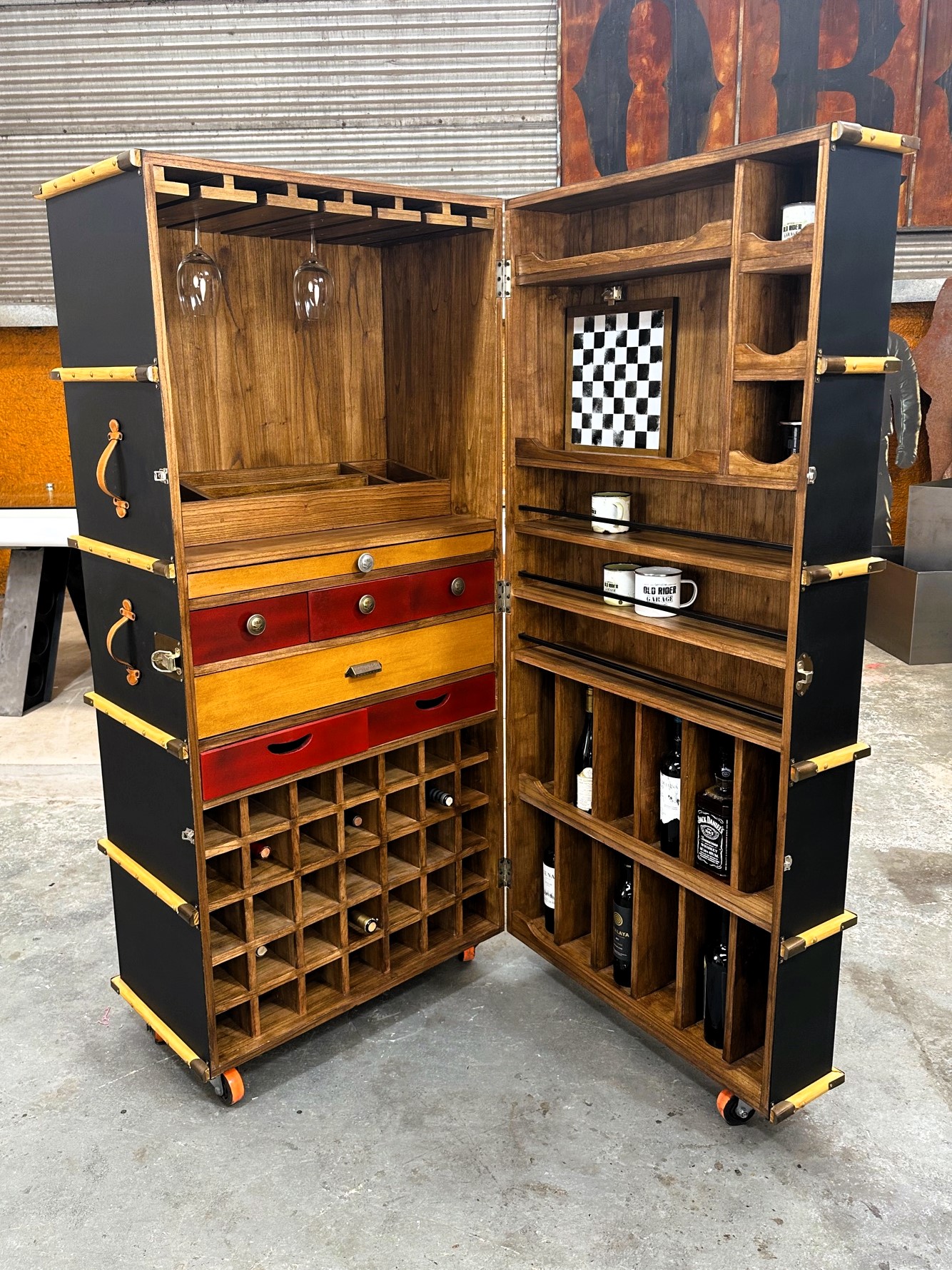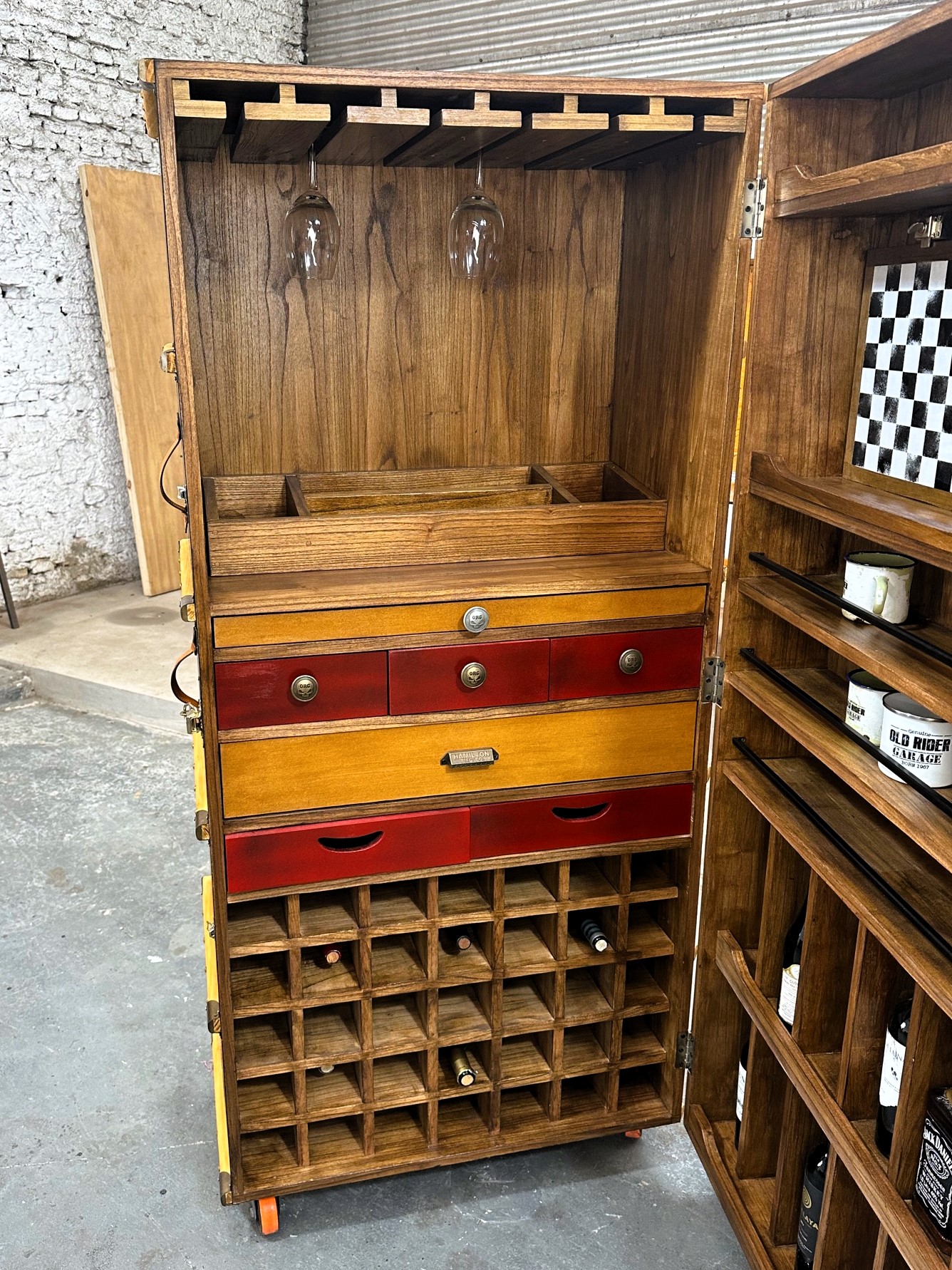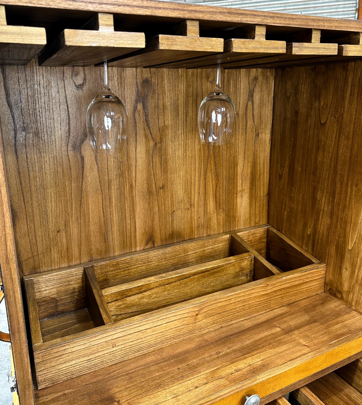 Cava bodega de madera con estantería para copas, vinos y accesorios.