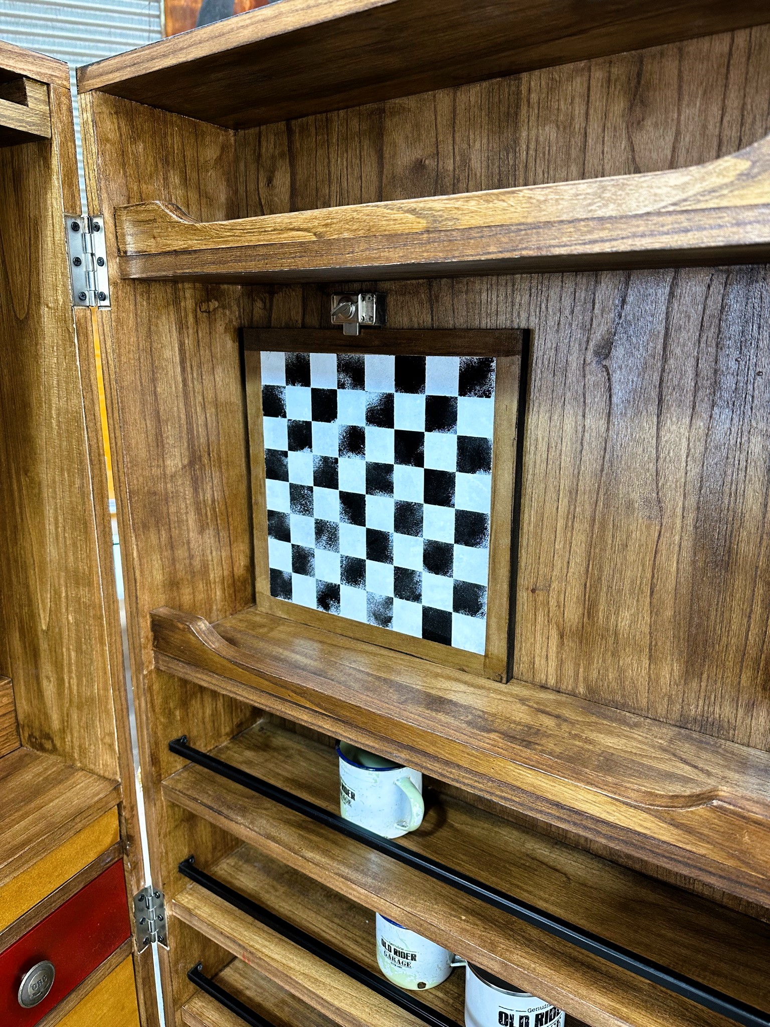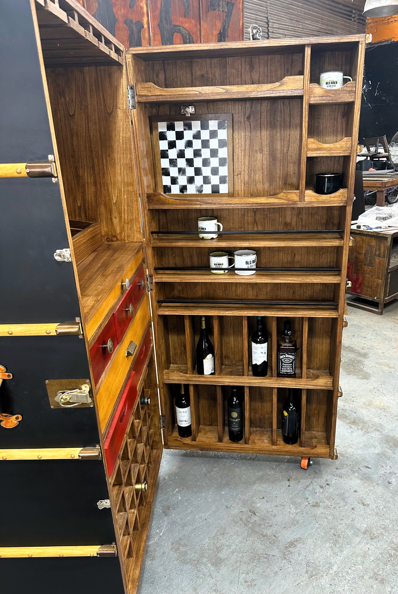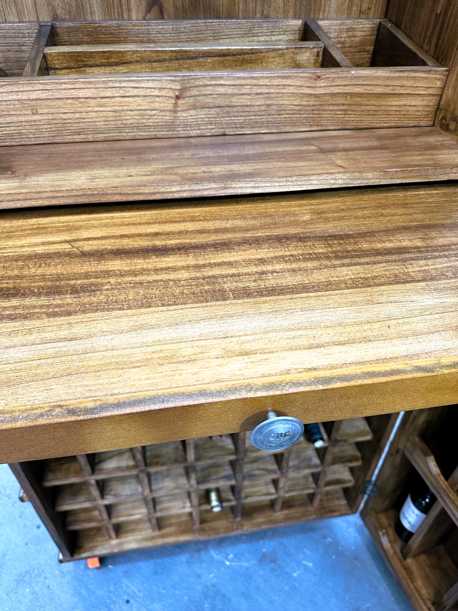 Cava bodega de madera con estantería para copas, vinos y accesorios.
