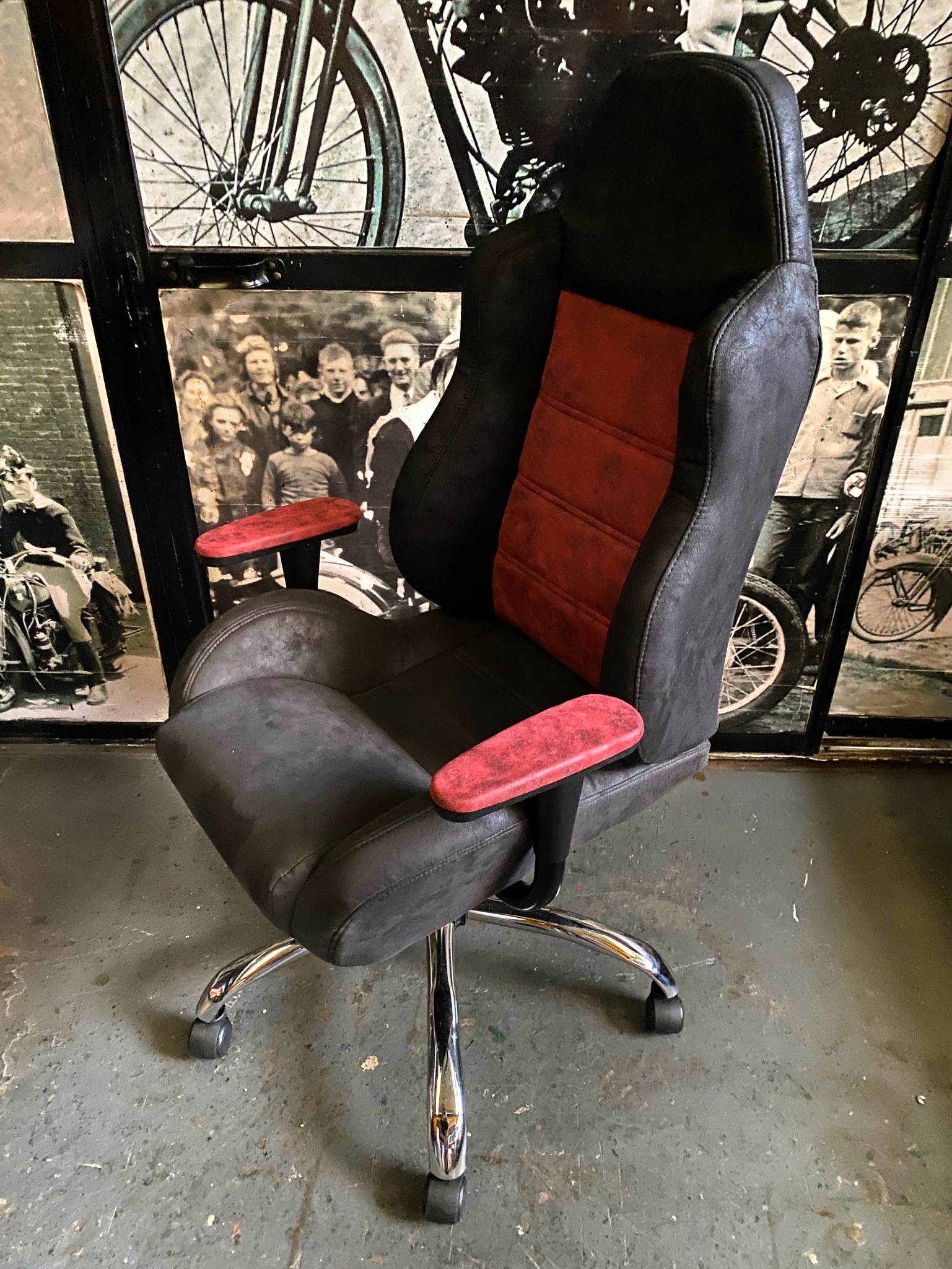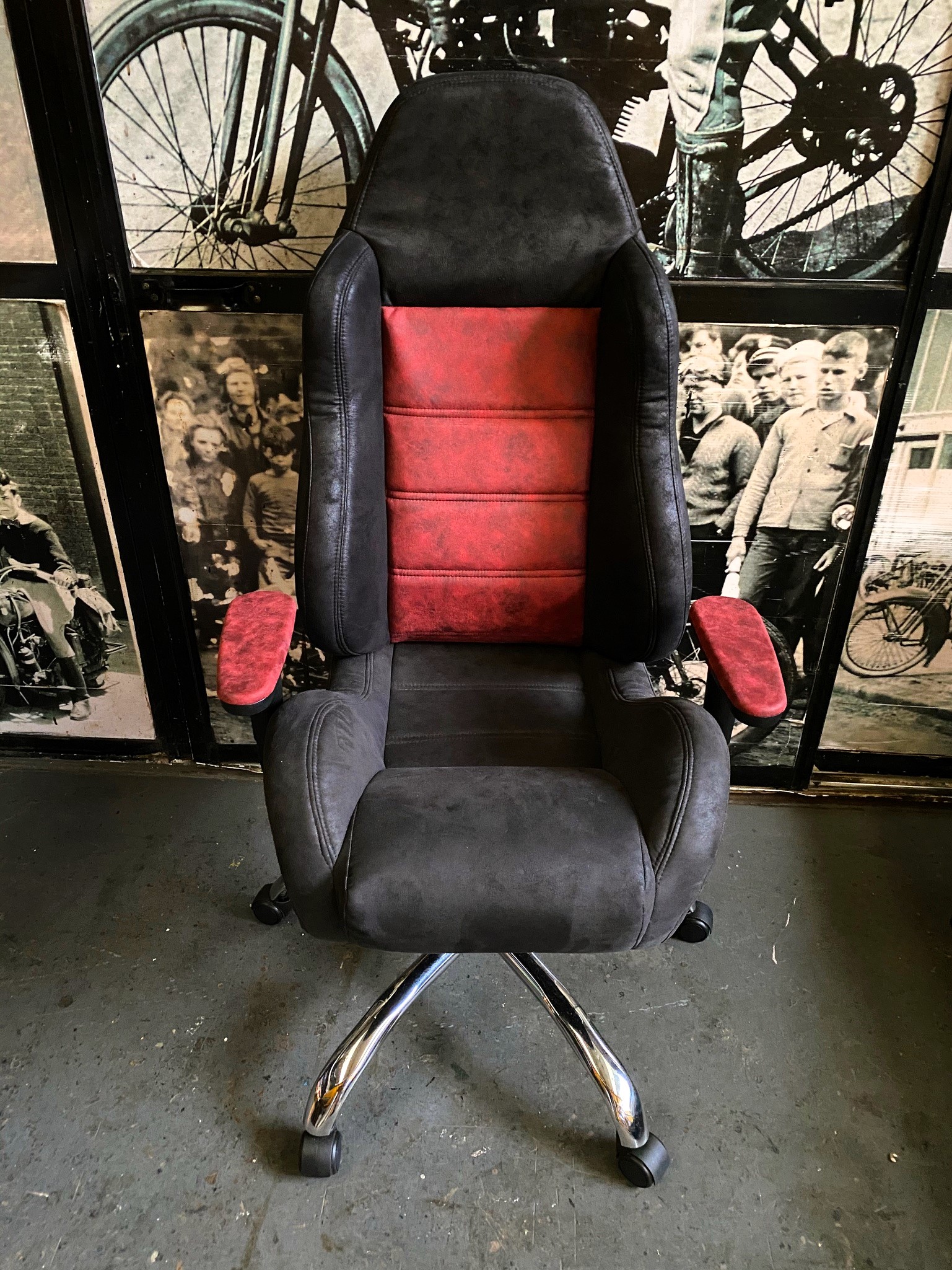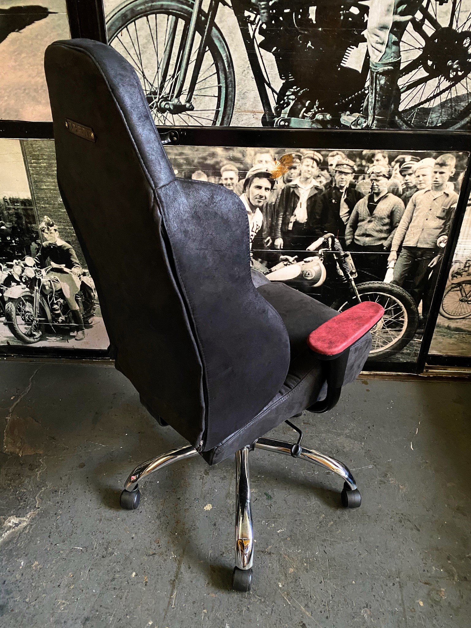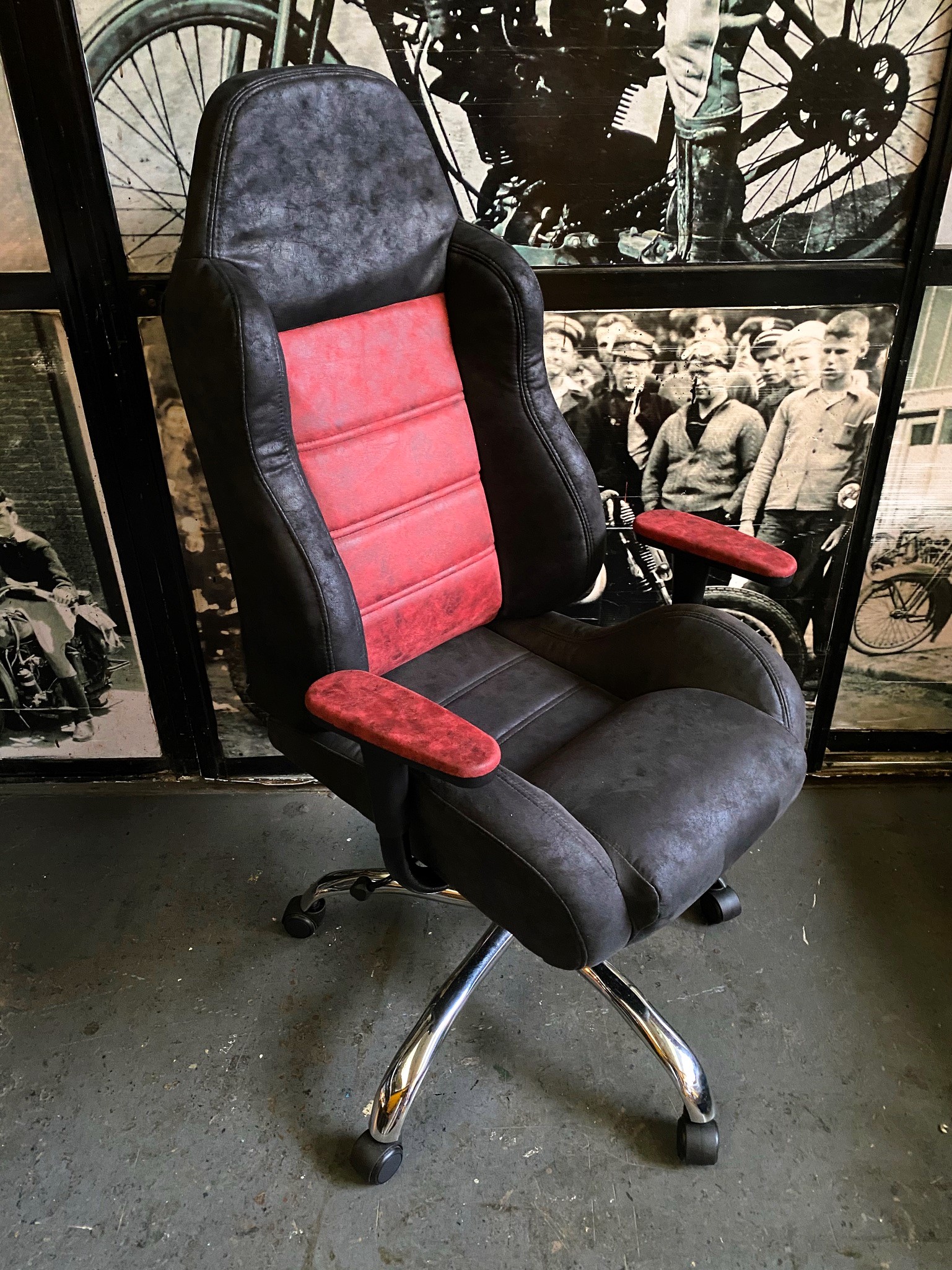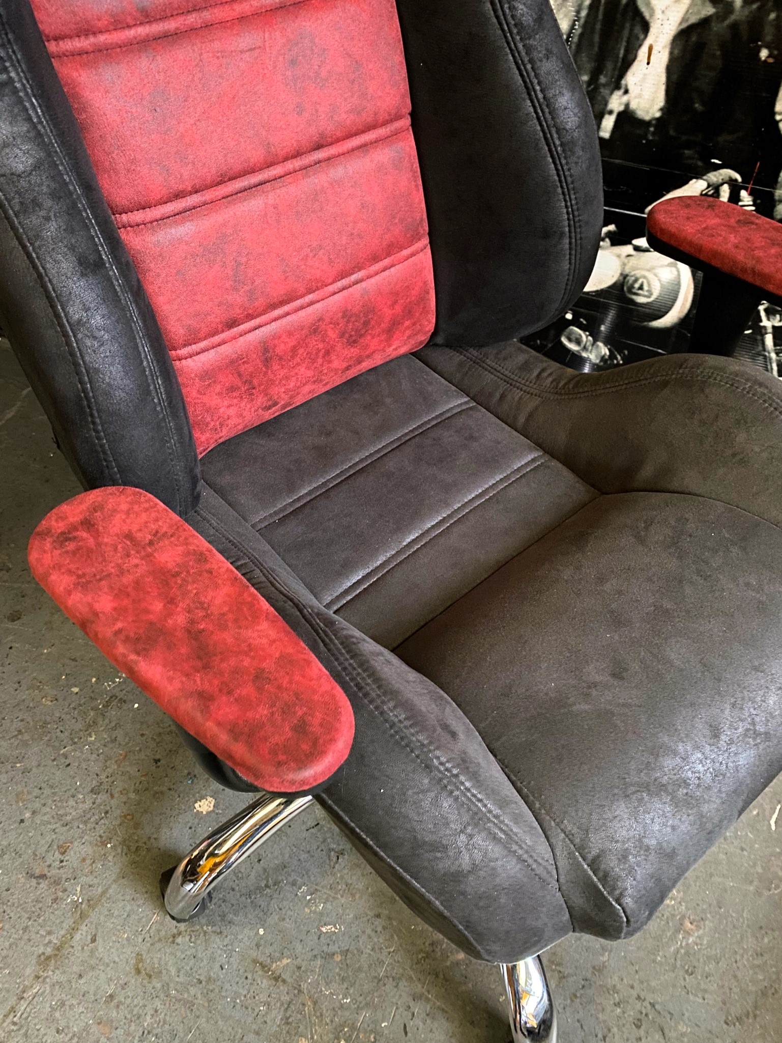 Silla tipo butaca con diseño bicolor en cuero y gamuza.