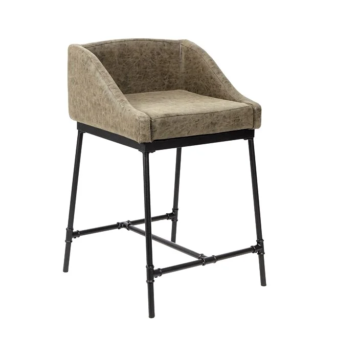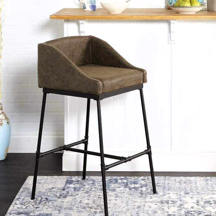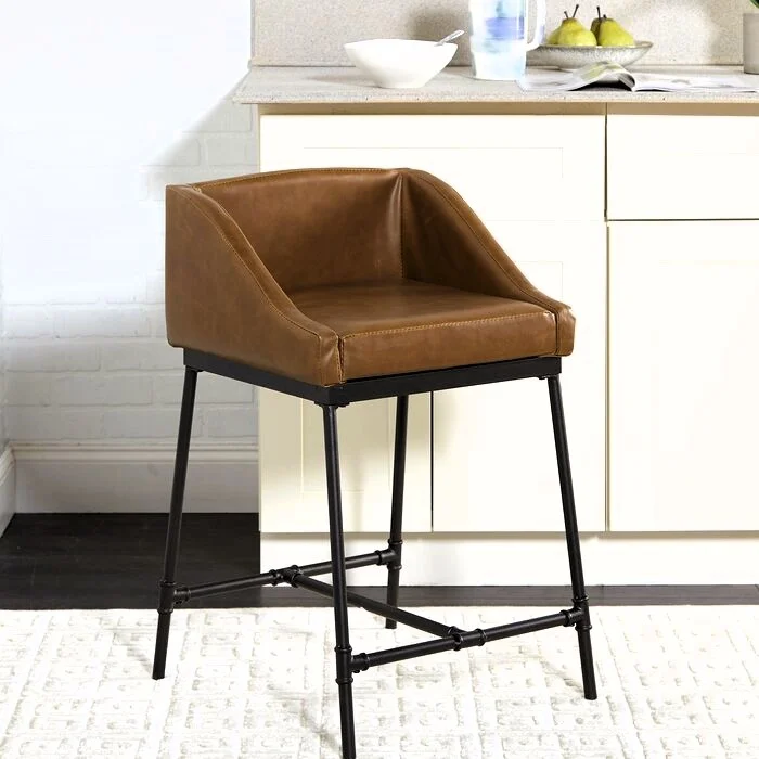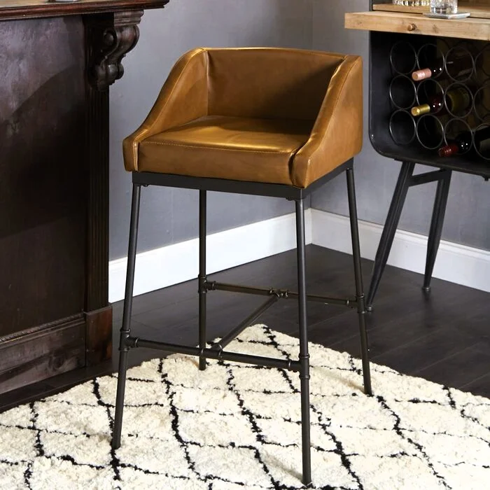 Banqueta con asiento tapizado en cuero y base metálica negra de diseño industrial.