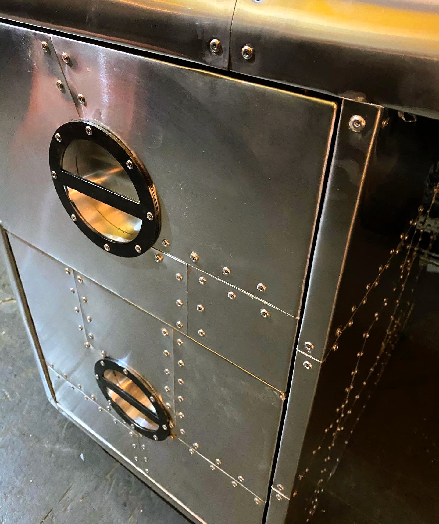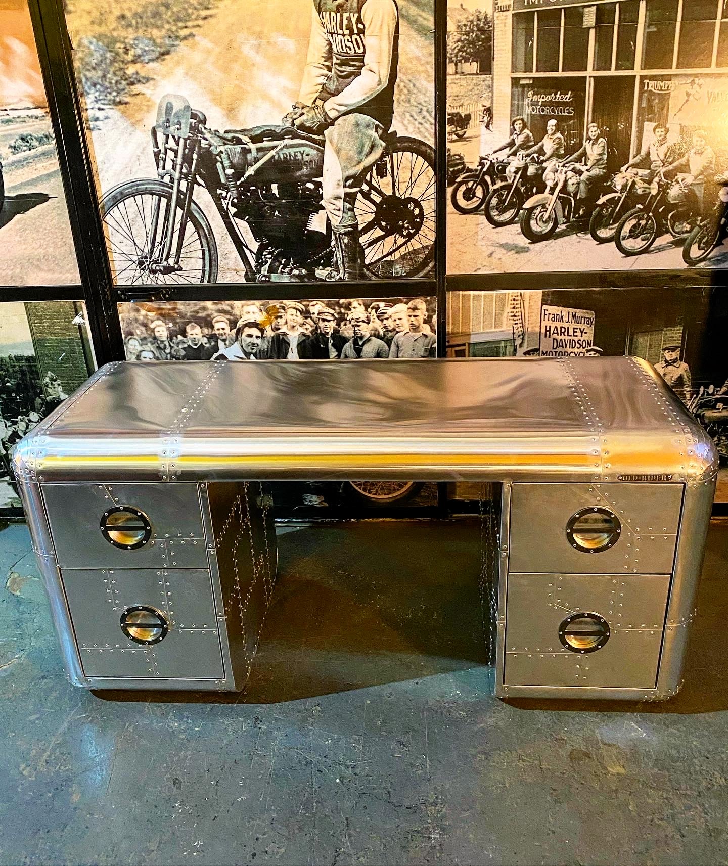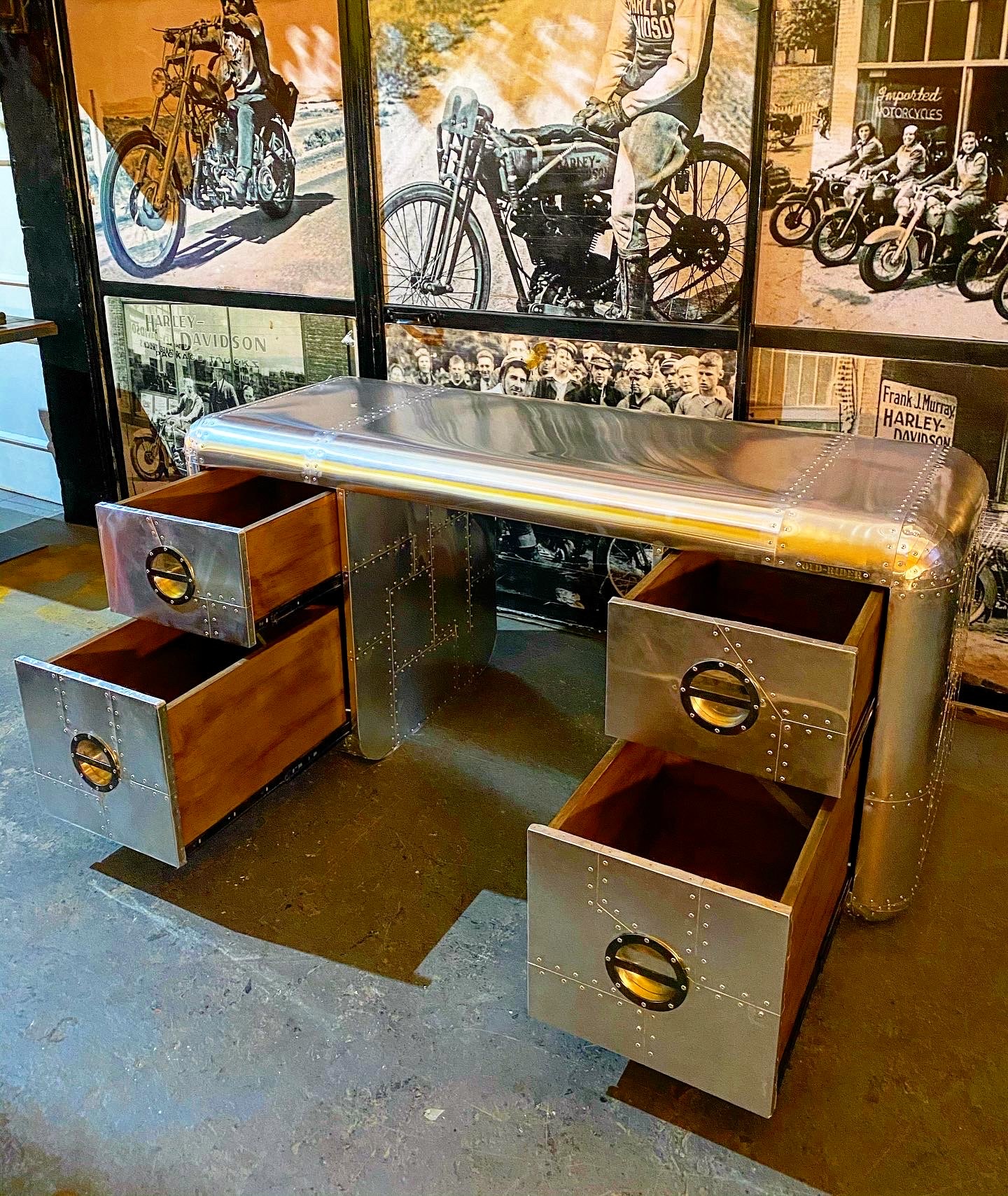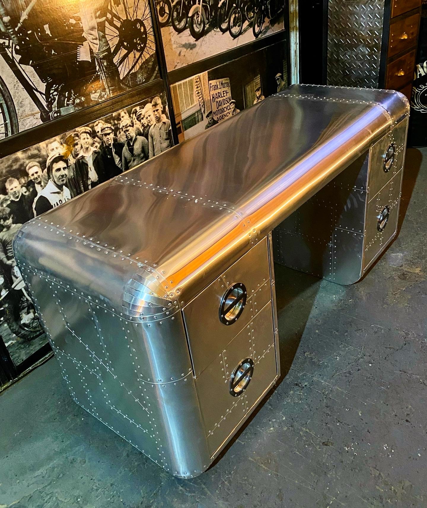 escritorio lineal aviator, hecho de aluminio y remaches, con cajones y manijas laser