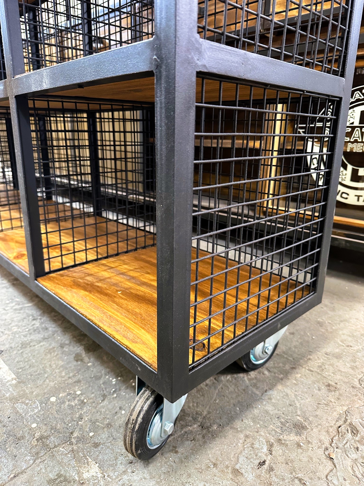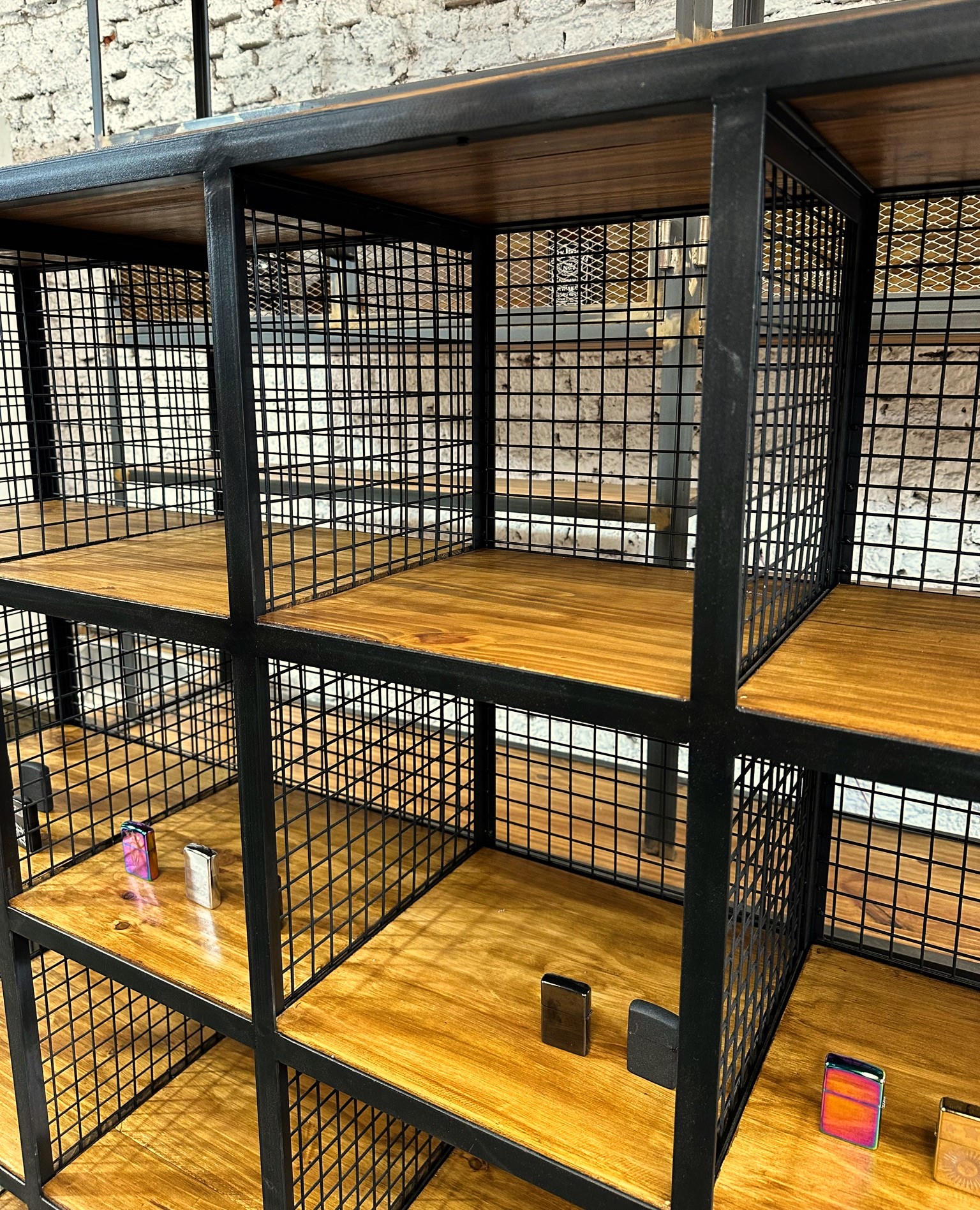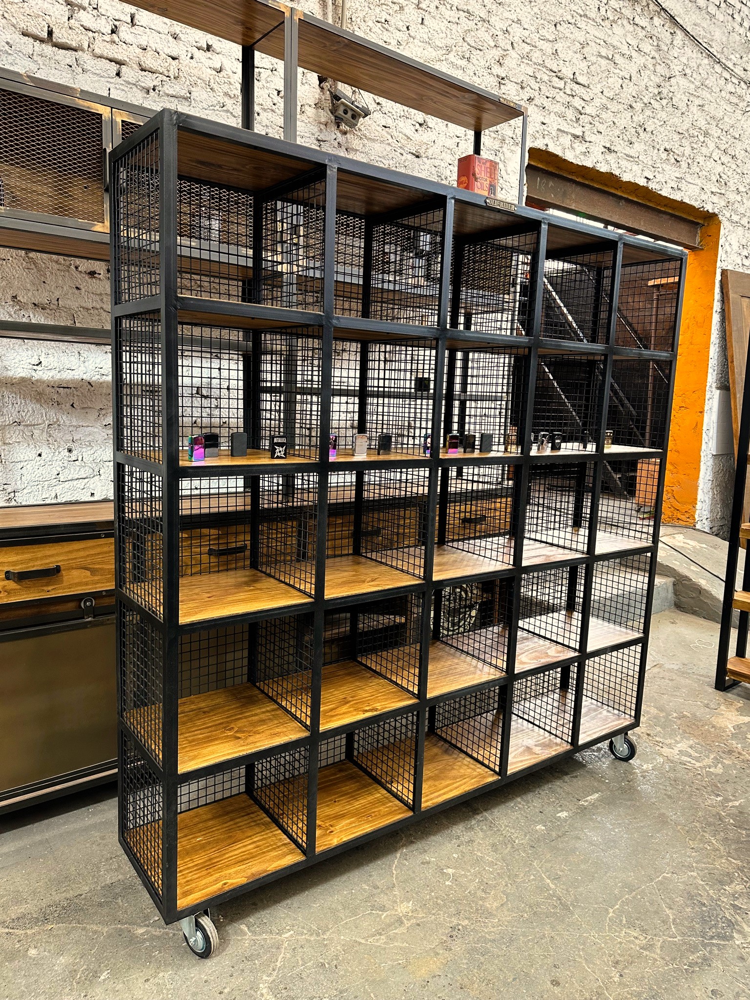 Estantería de alambre grueso y bordes de hierro con bases de madera en los cubículos.