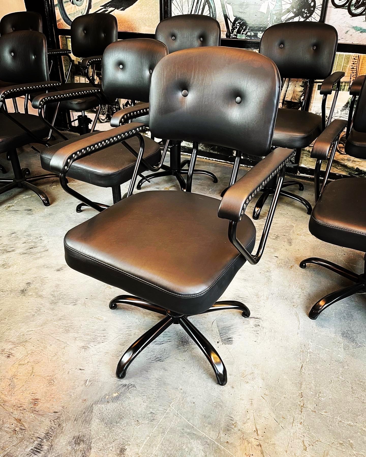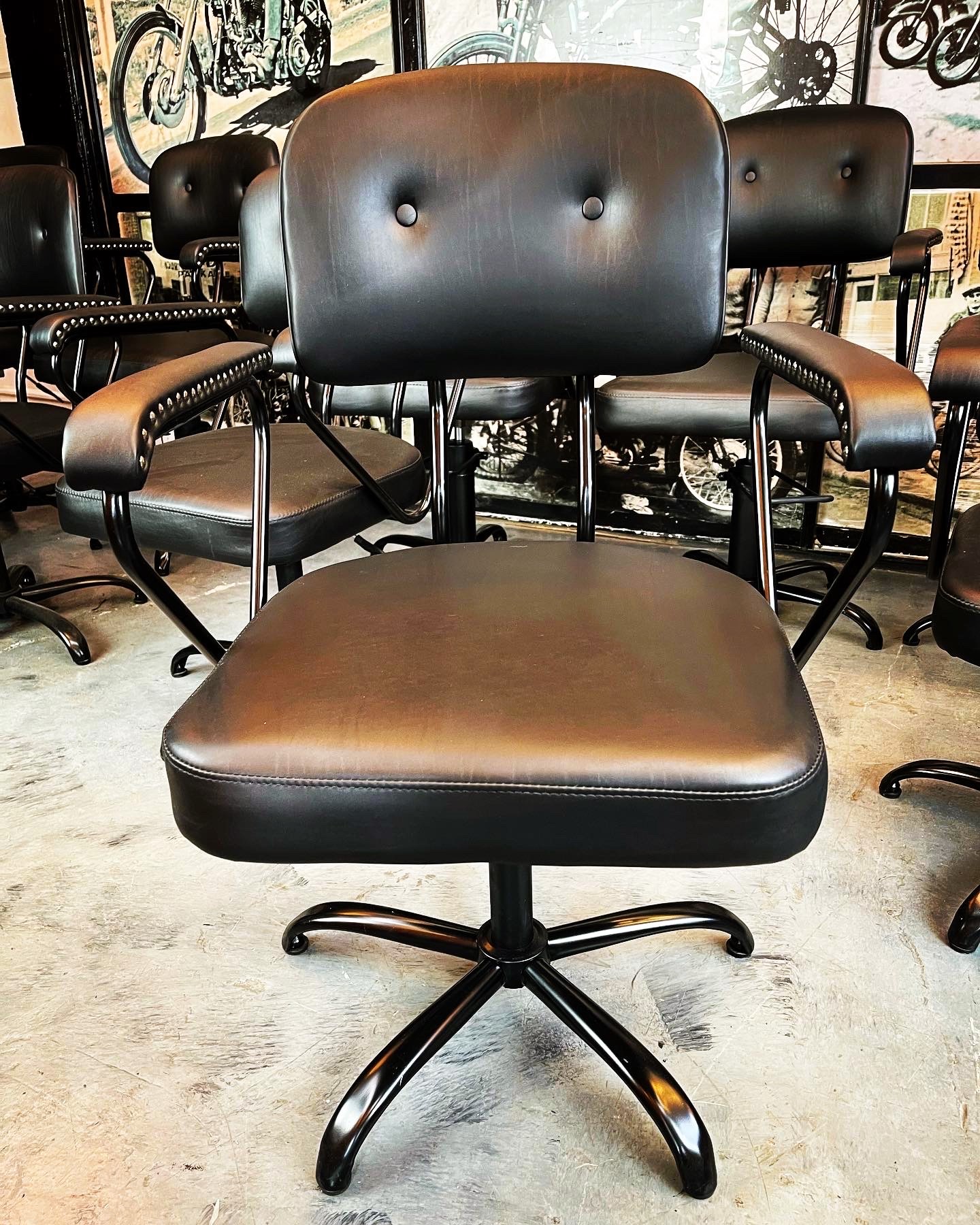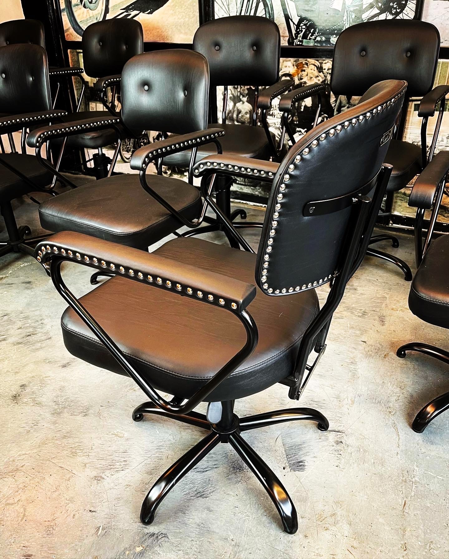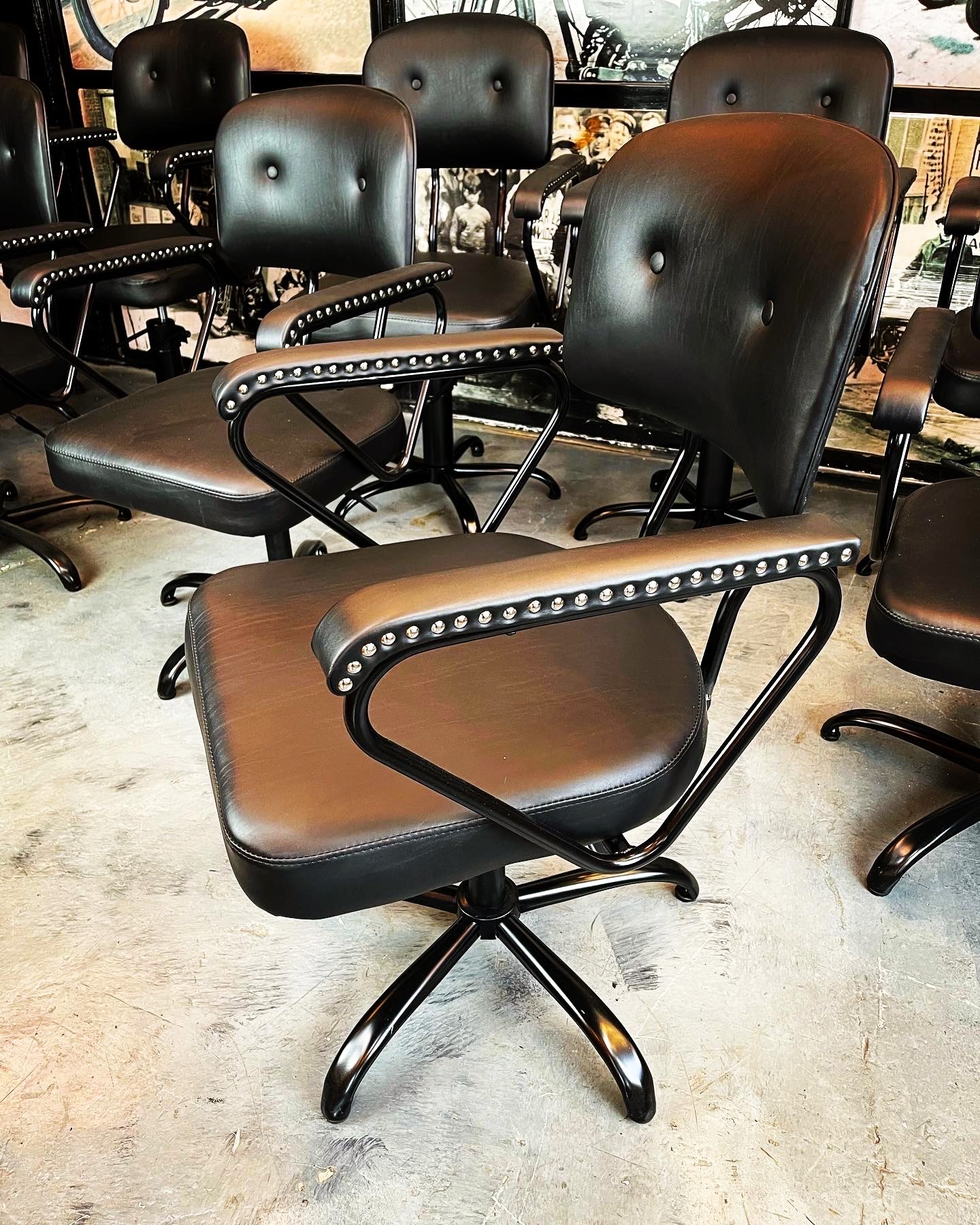 Silla giratoria de cuero con apoyabrazos metálicos y tachas decorativas.