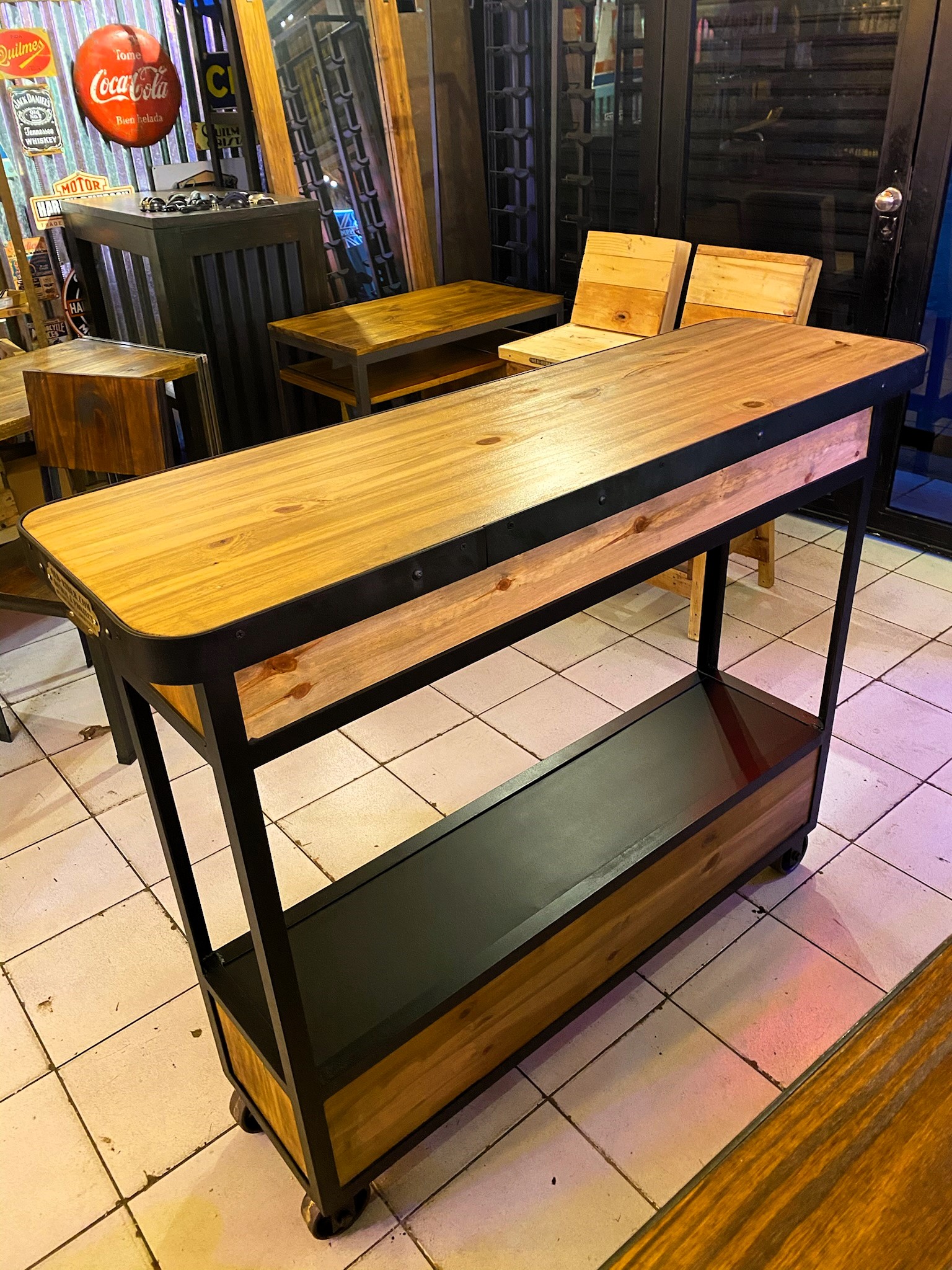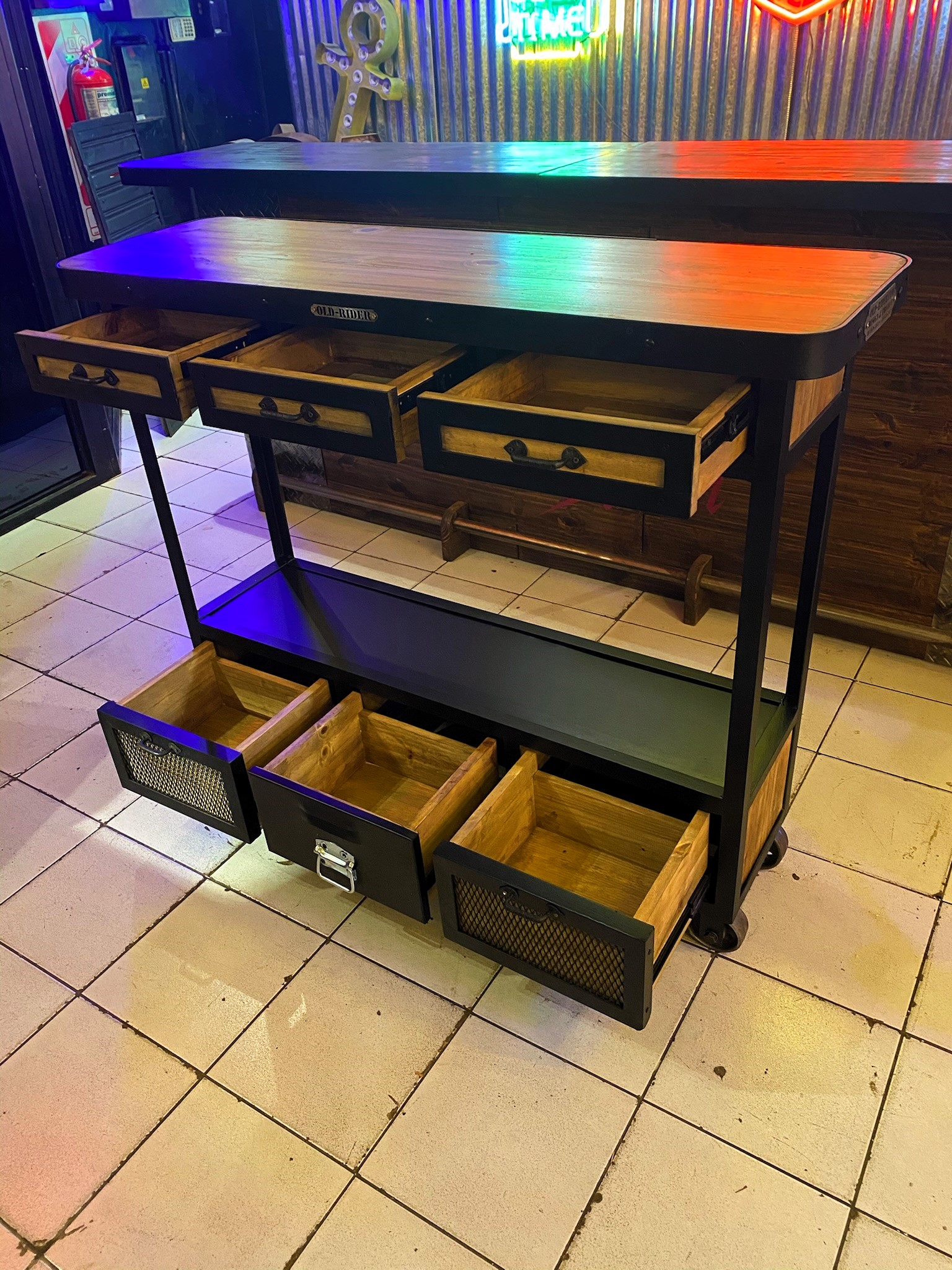 Isla carro de madera con bordes de hierro y metal desplegado. Cajones y estantes varios.