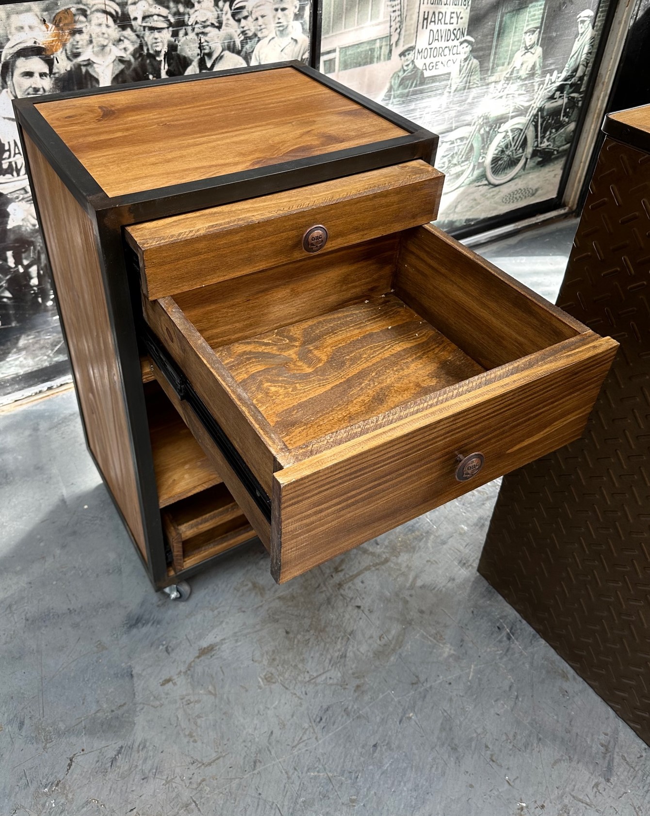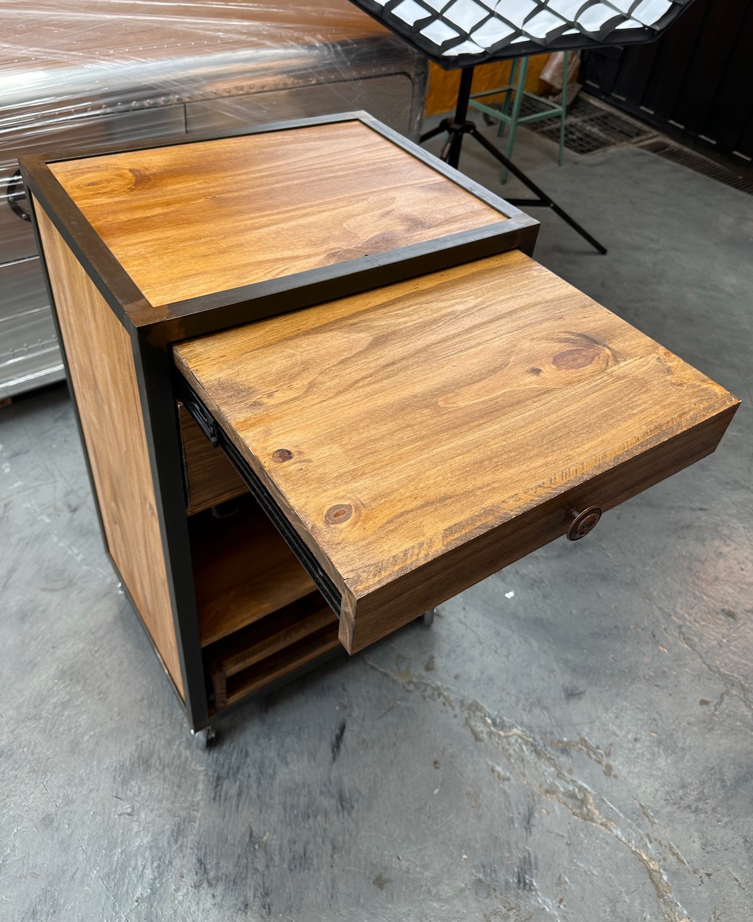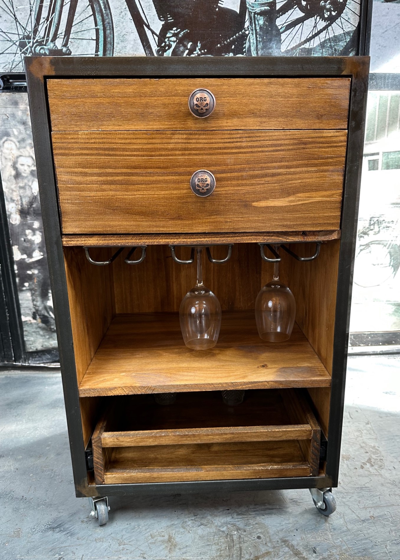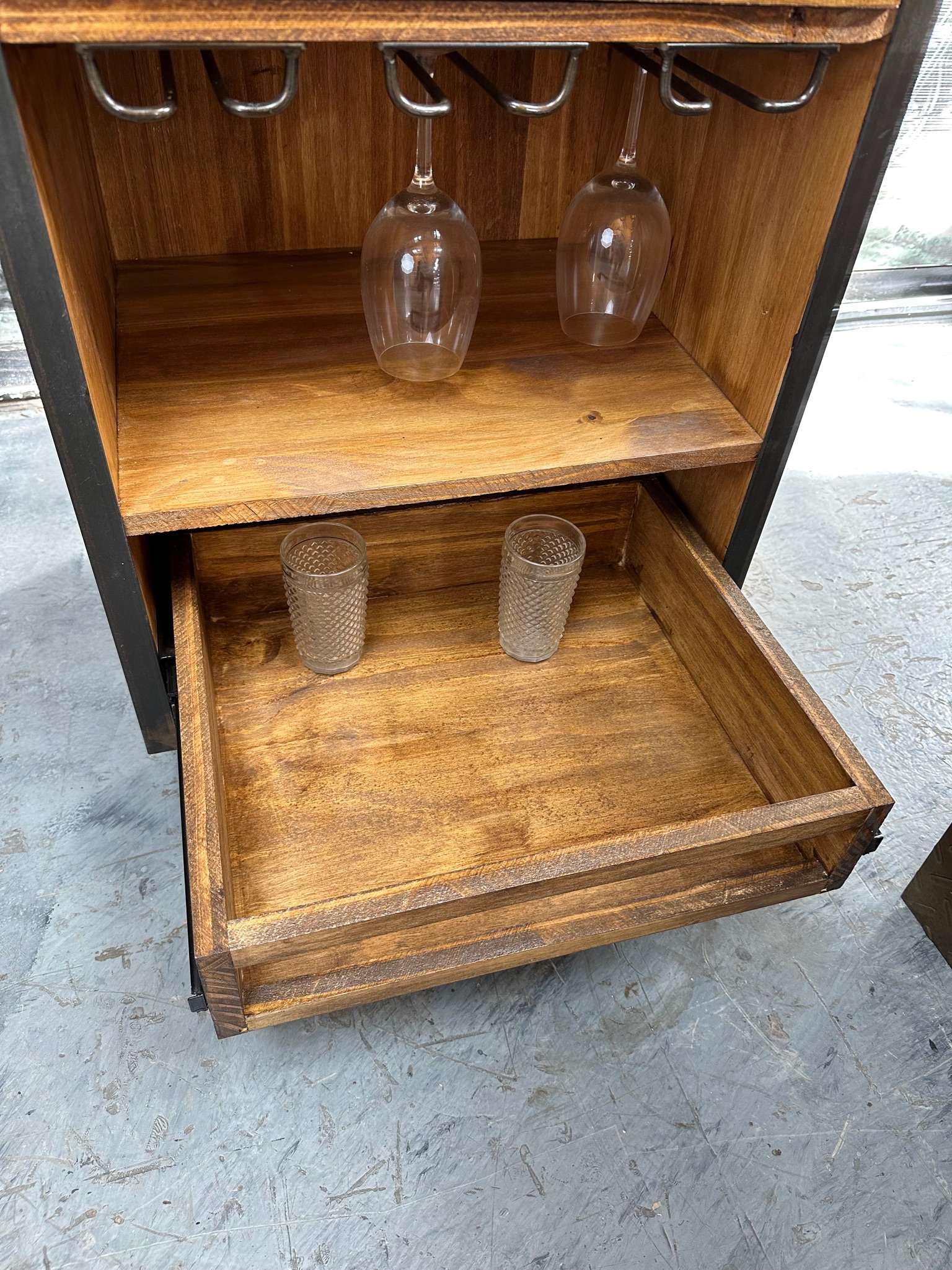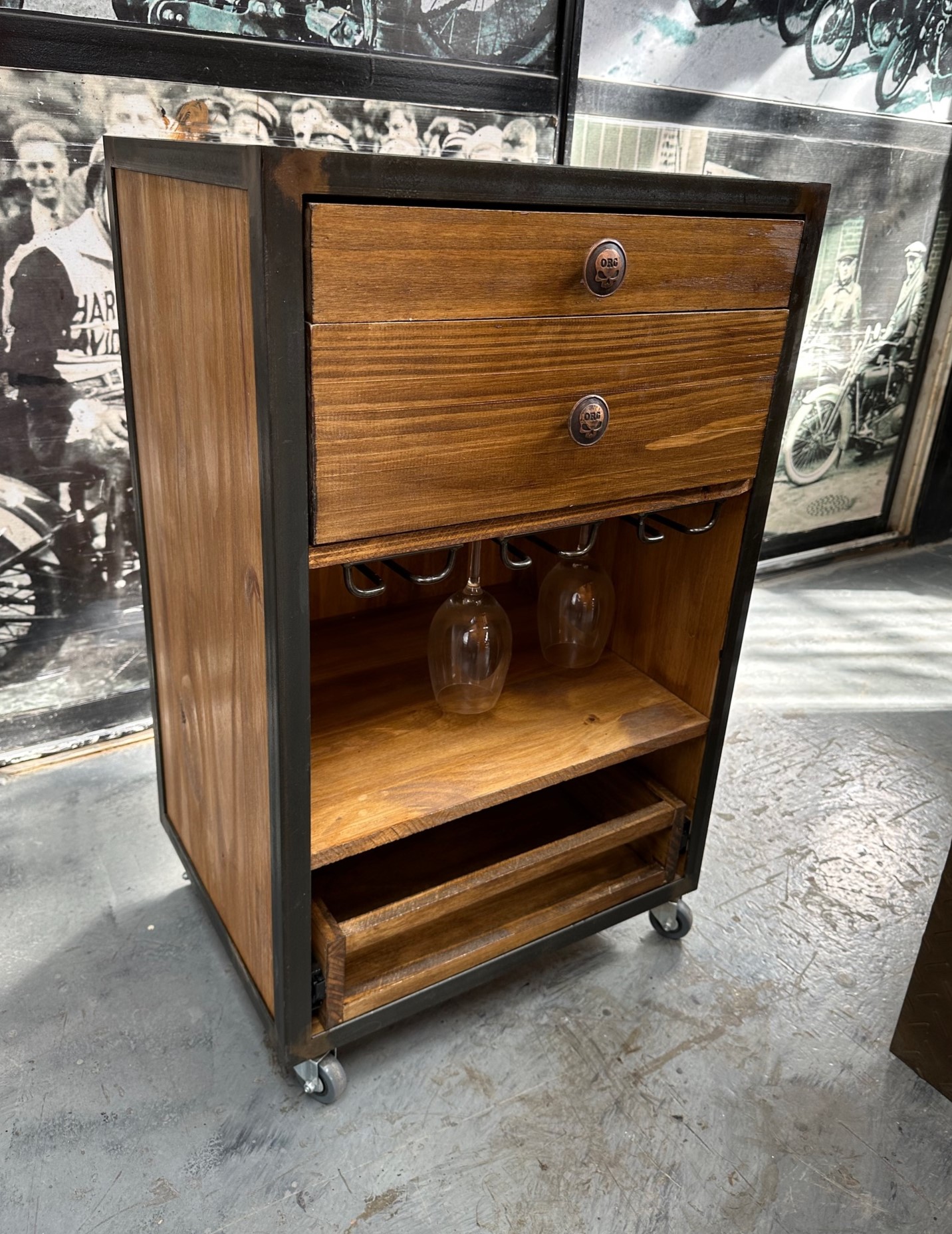 Isla carro de madera con bordes de hierro. Cajones, mesada y cuelga copas.