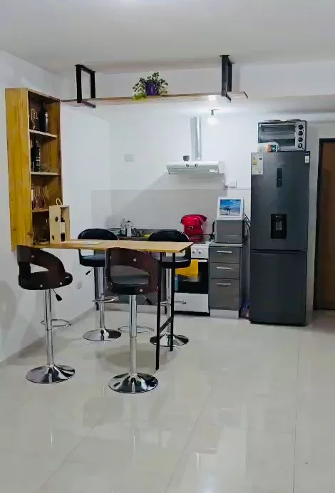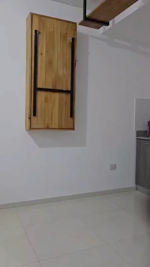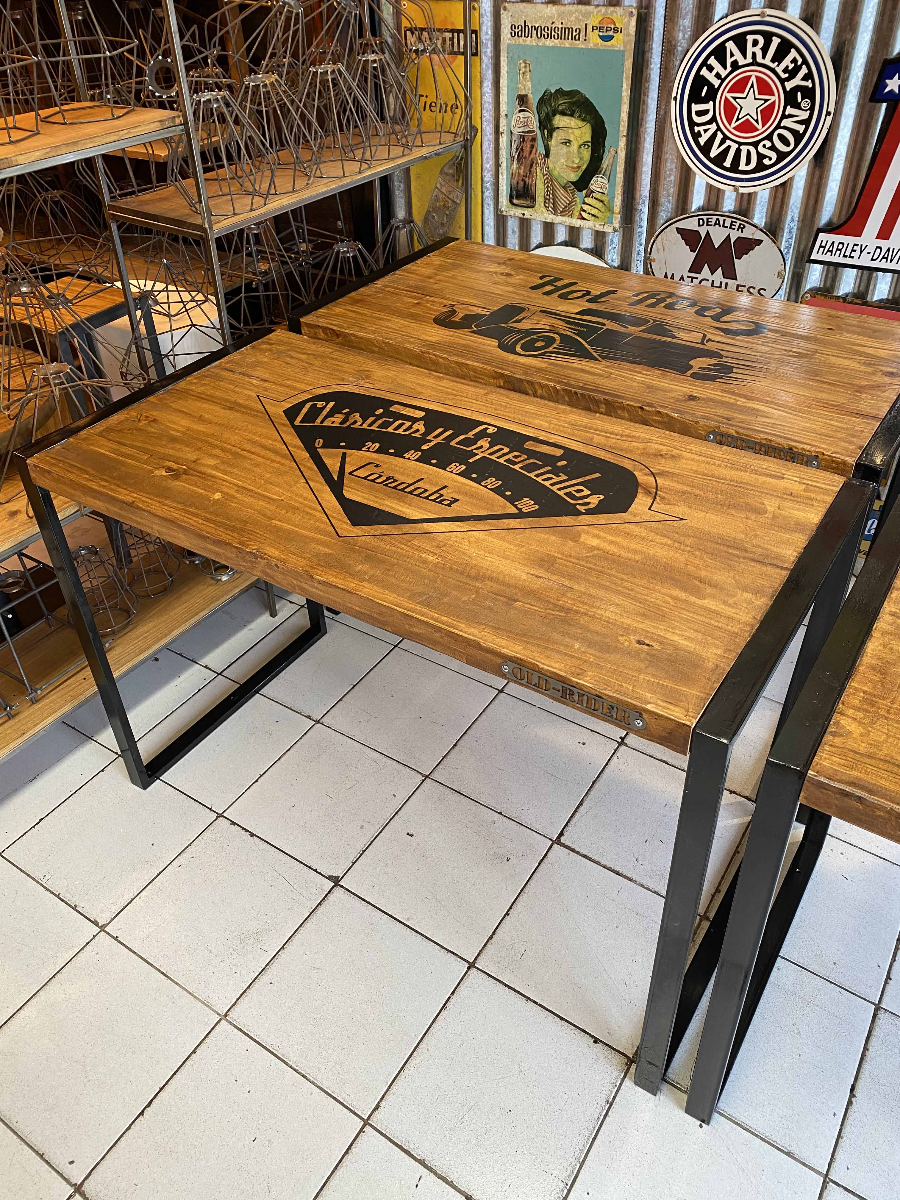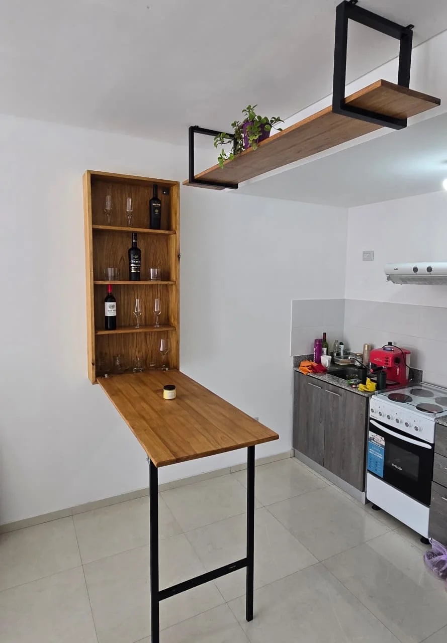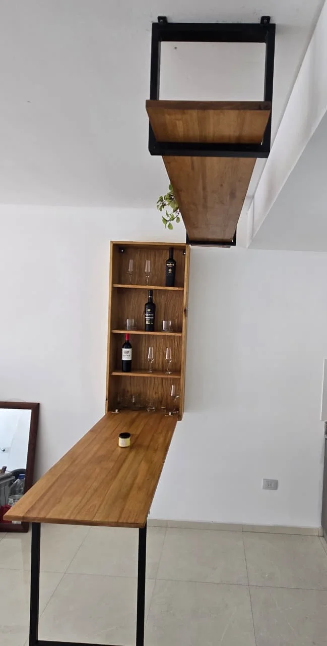 Mesa alta compacta que maximiza el espacio, con función de barra al desplegarse. Diseño practico y moderno a partir de madera de Eucalipto y base en caño cuadrado. Totalmente personalizable