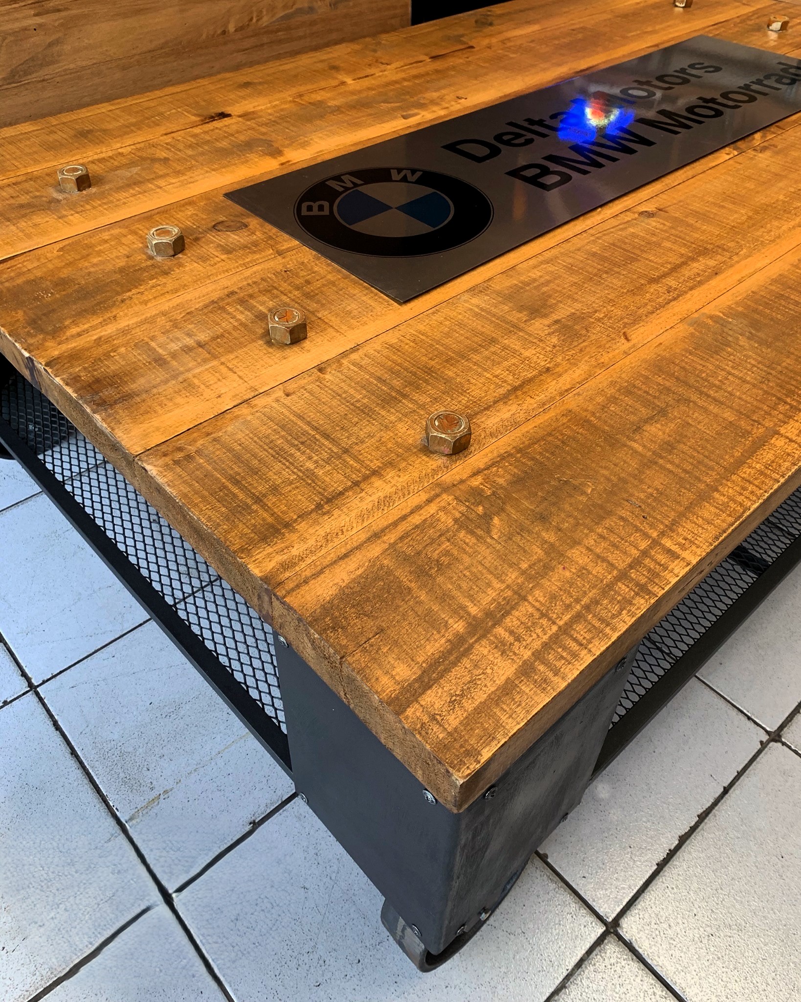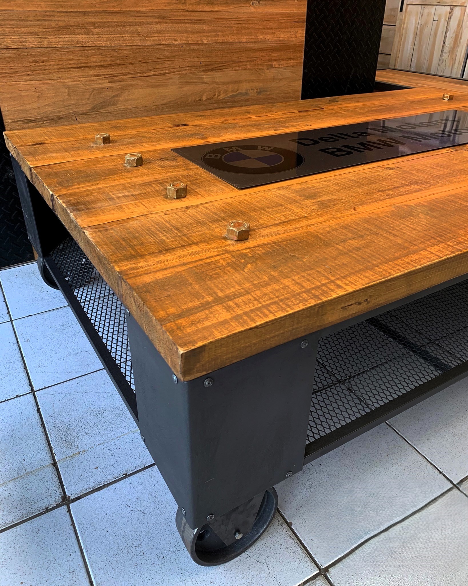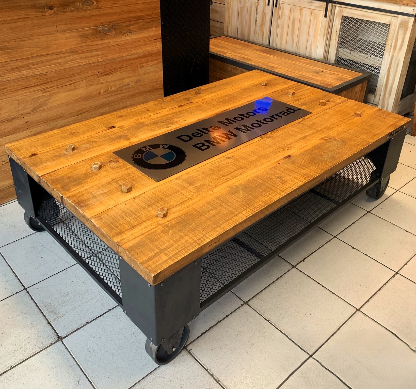 Mesa ratona de madera con planchas de acero, zona inferior de reja y ruedas.