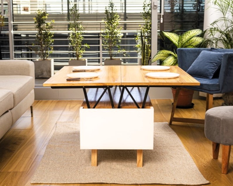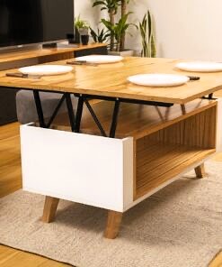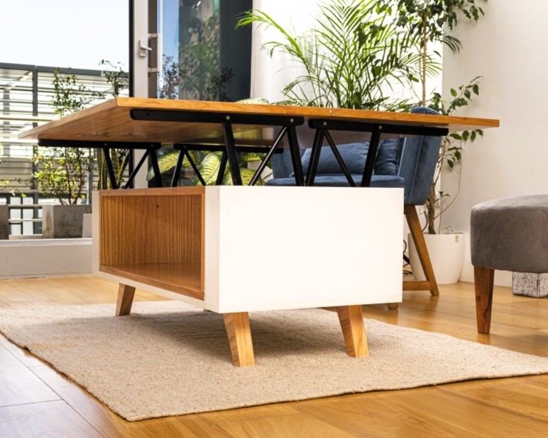 Mesa ratona elevable de madera con compartimiento inferior.