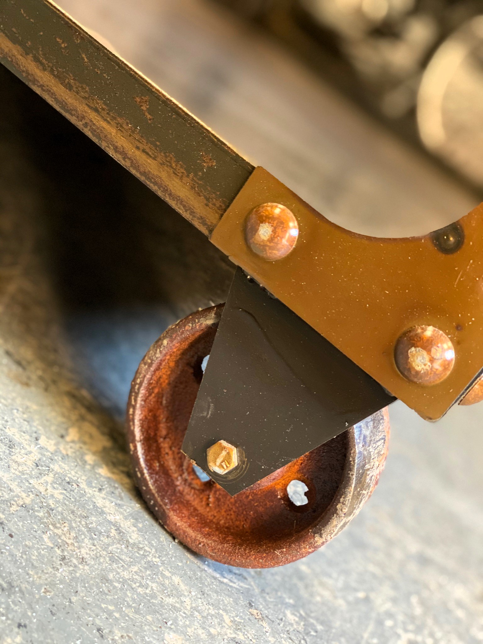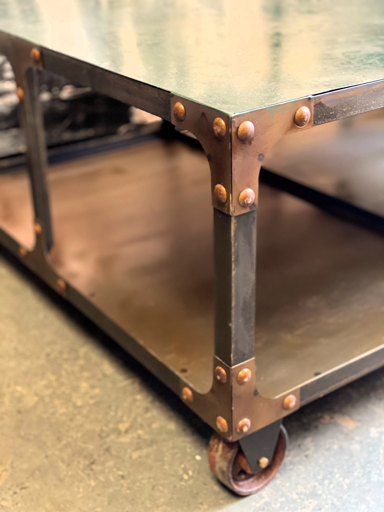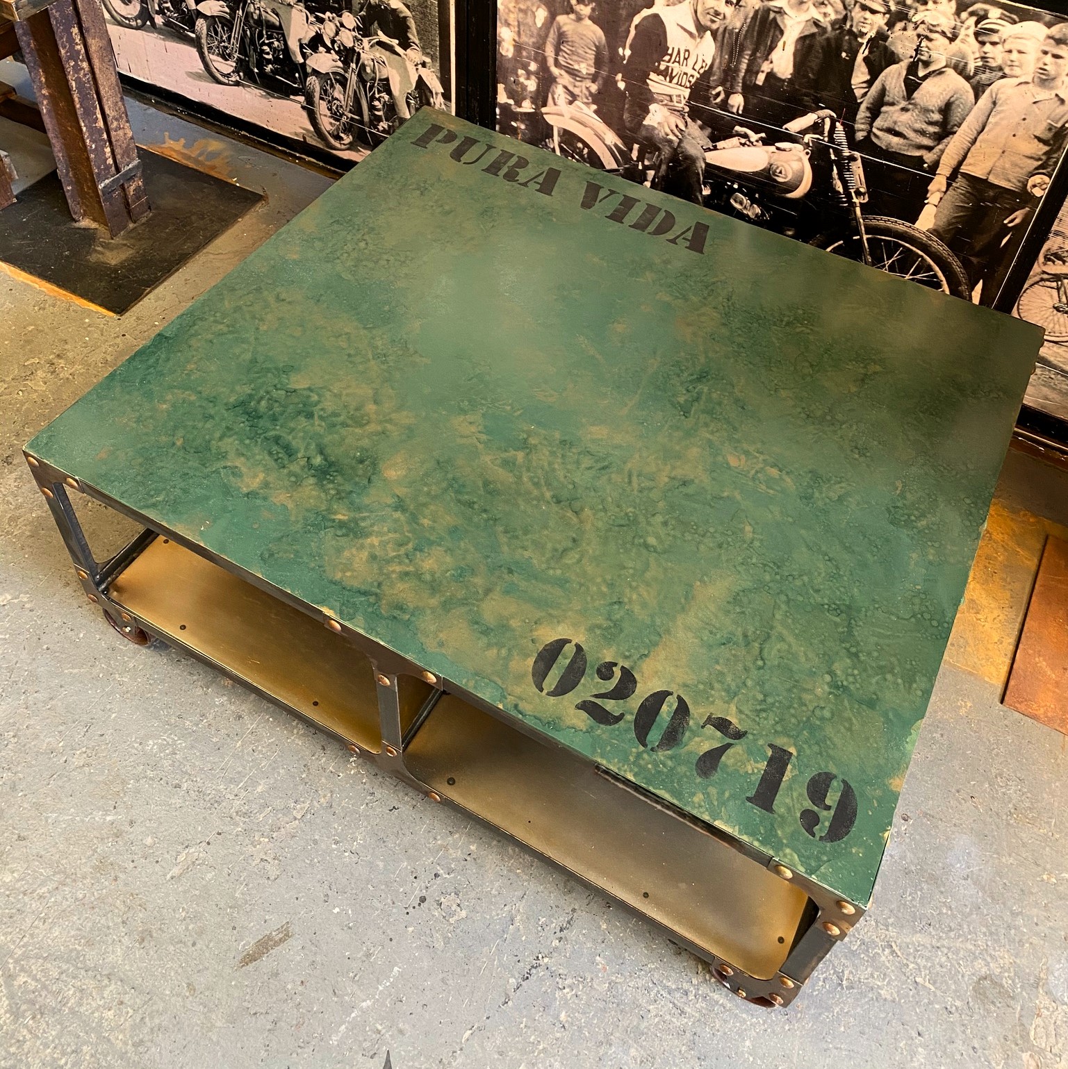 Mesa ratona de metal estilo locker con tapa pintada, ruedas para mover y espacio libre inferior.