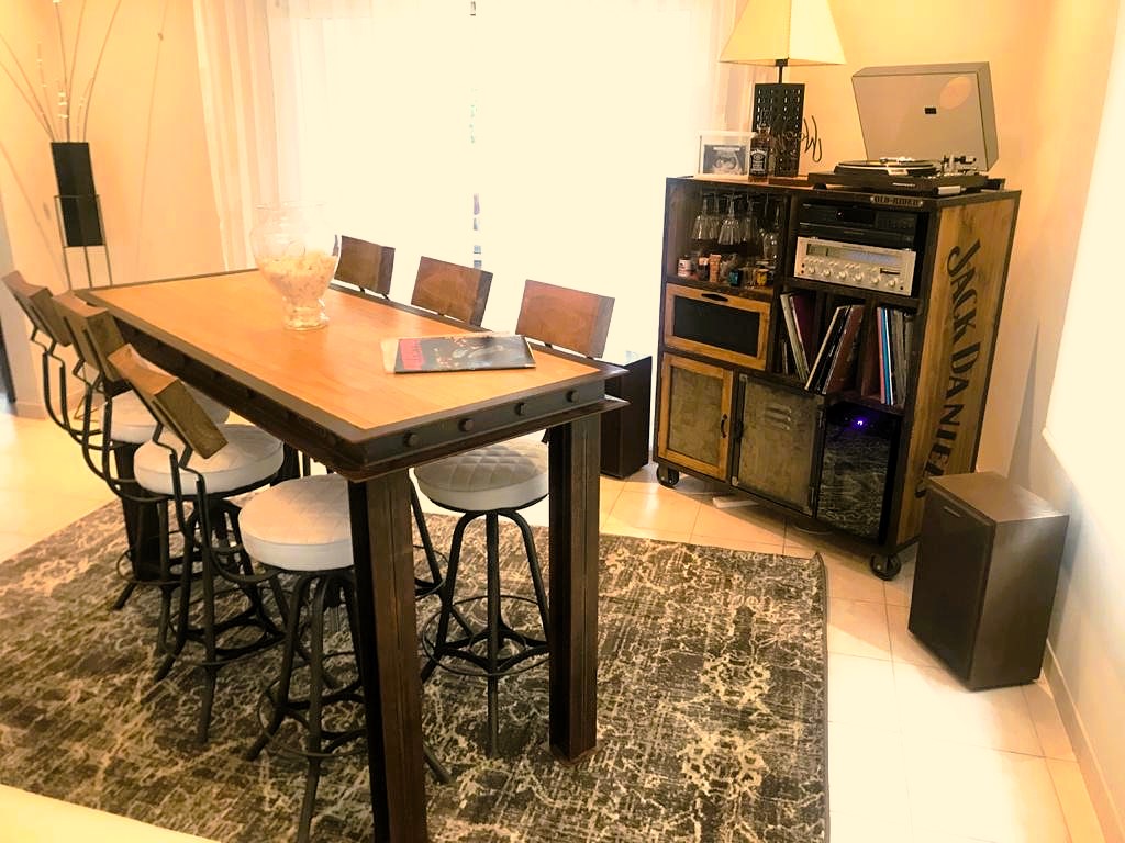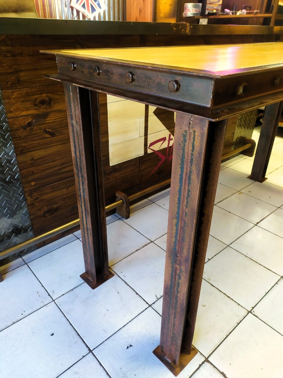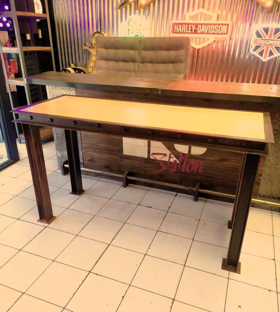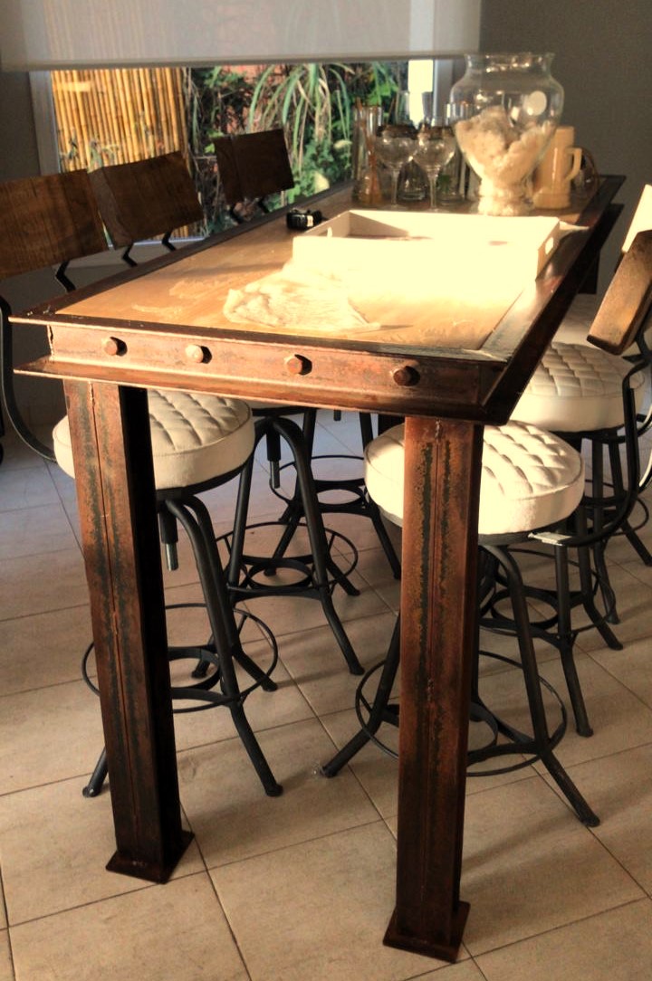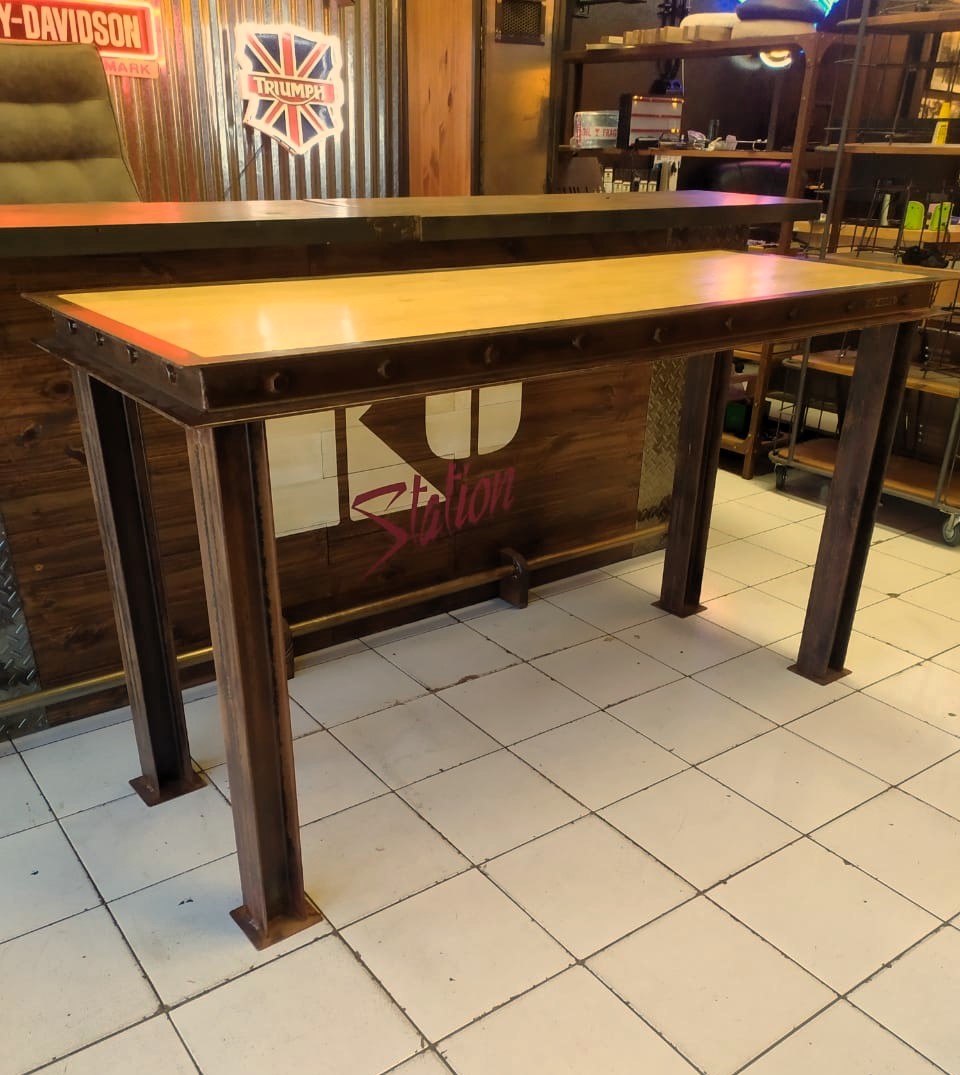 Mesa de madera con bordes de hierro remachado y patas doble T