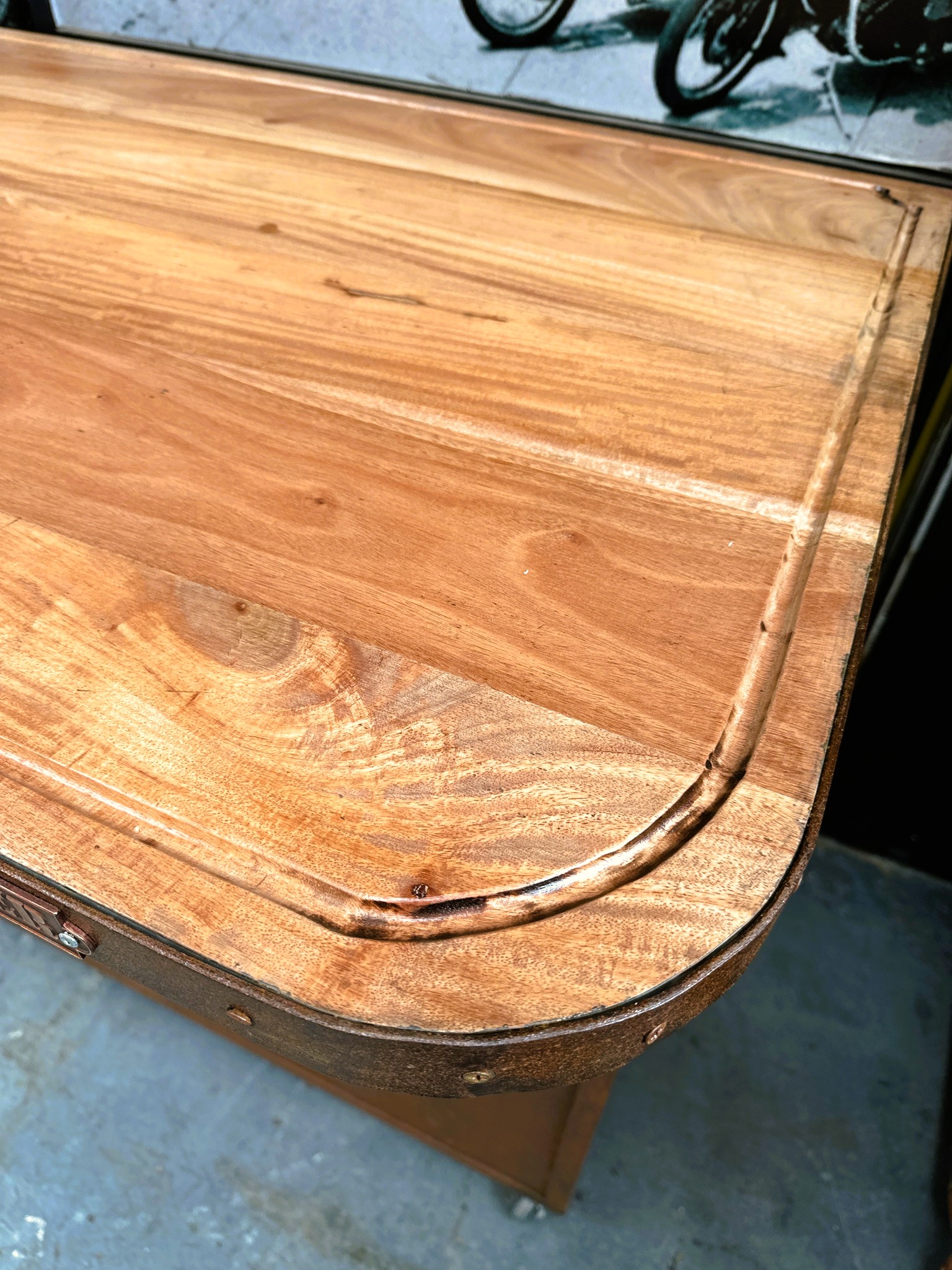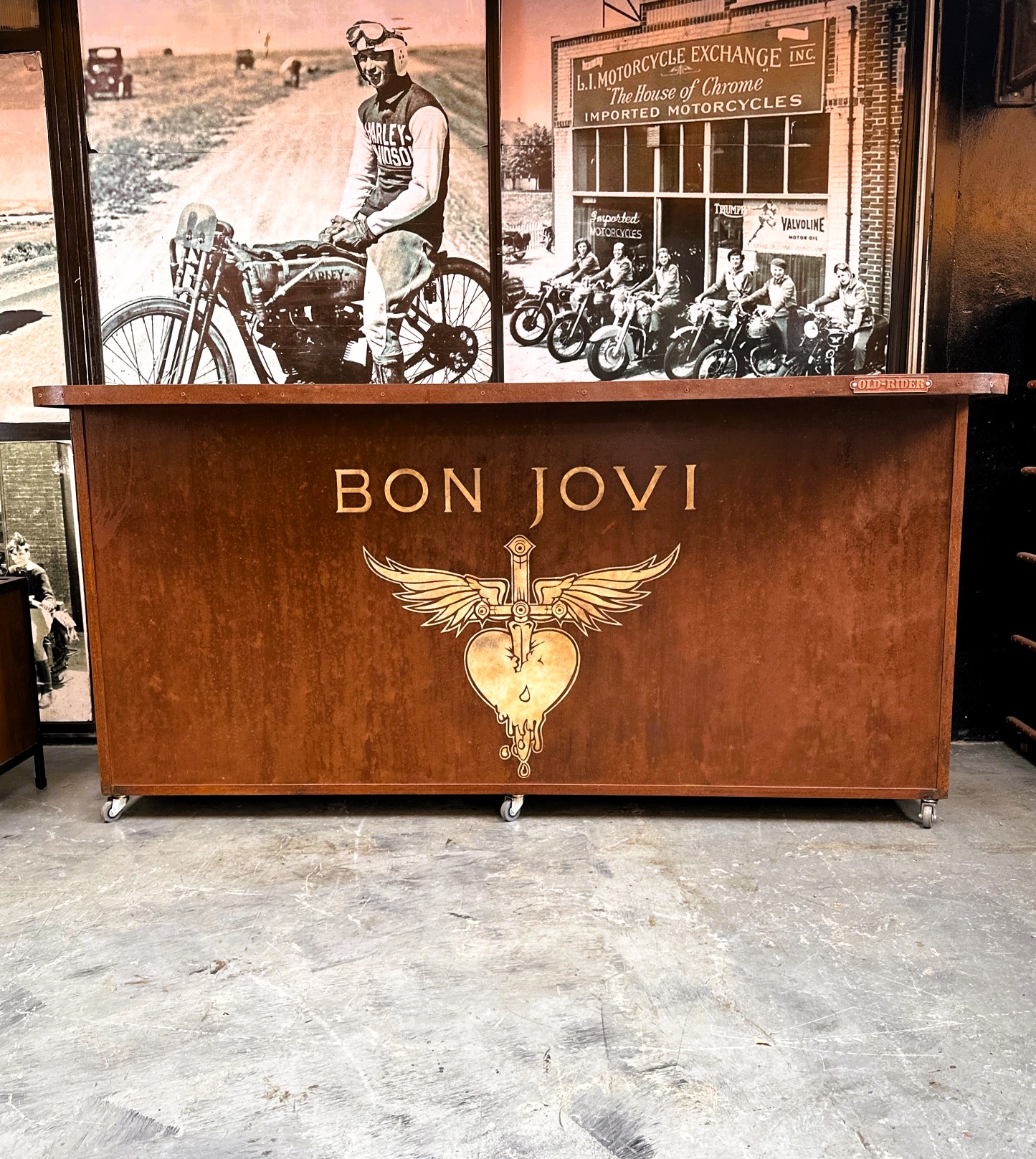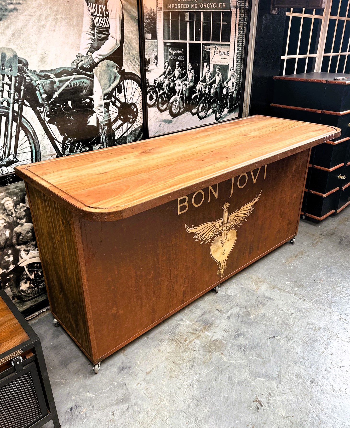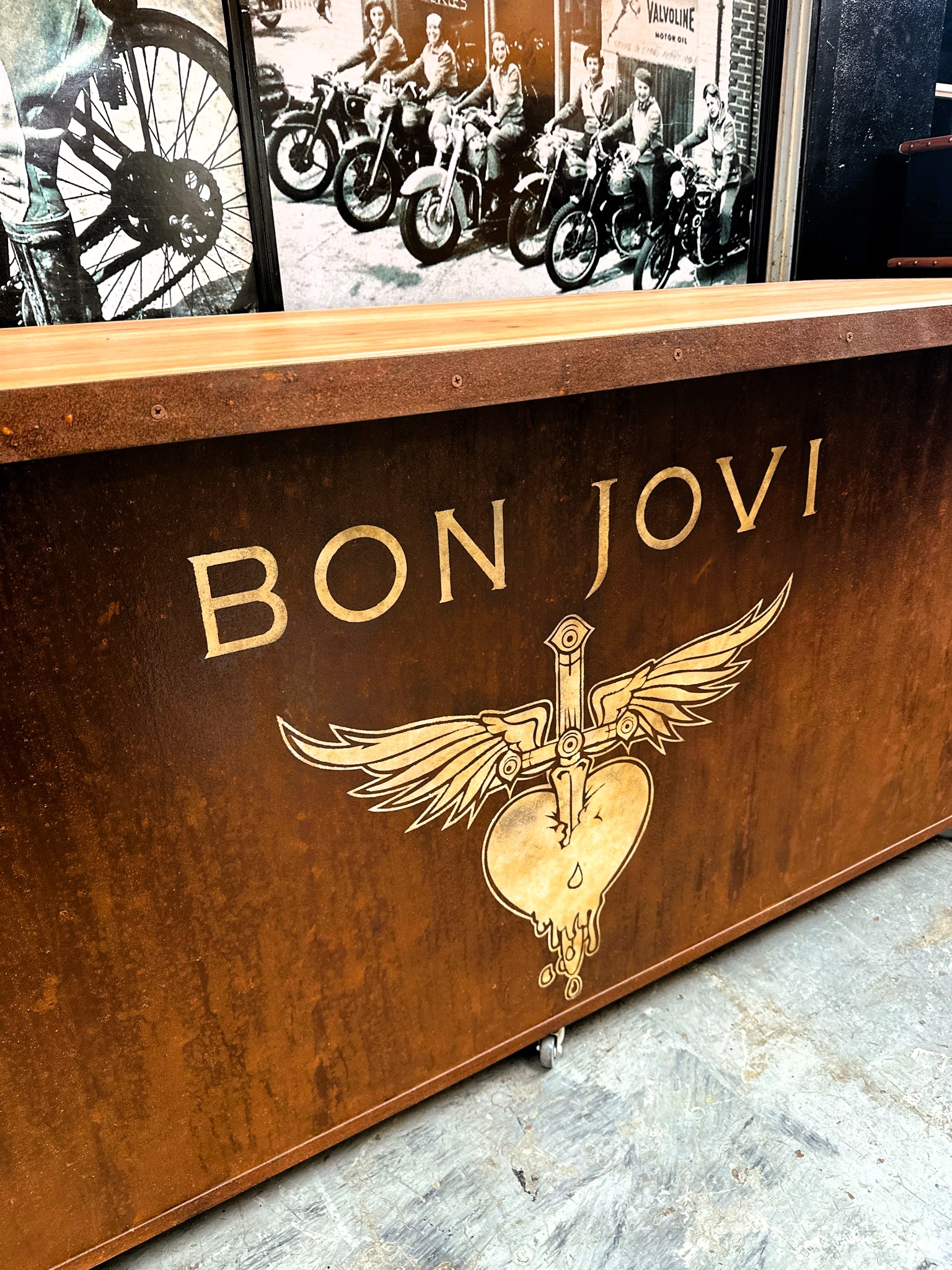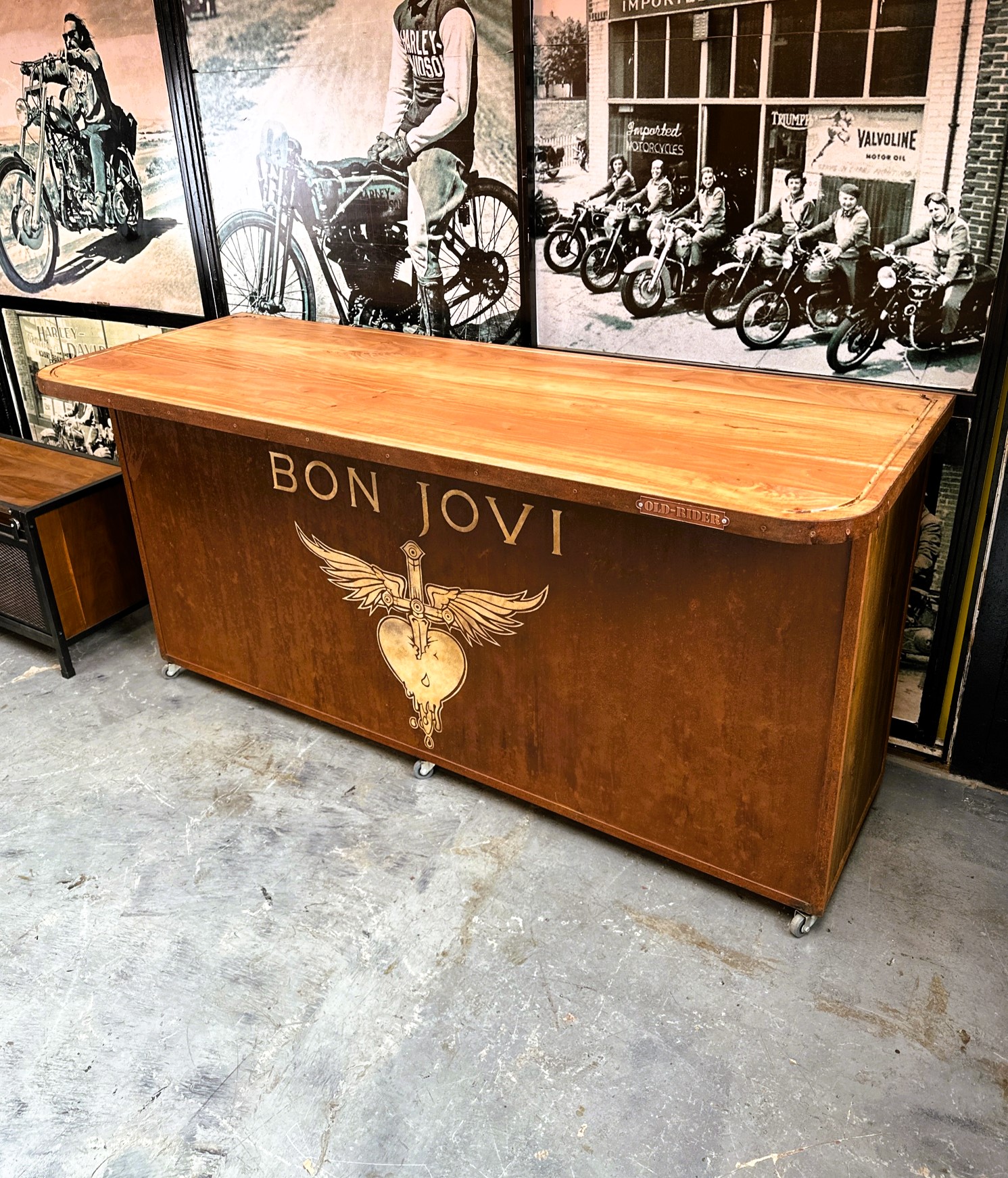 Mostrador de madera y frente de chapa estilo oxid con diseño pintado.
