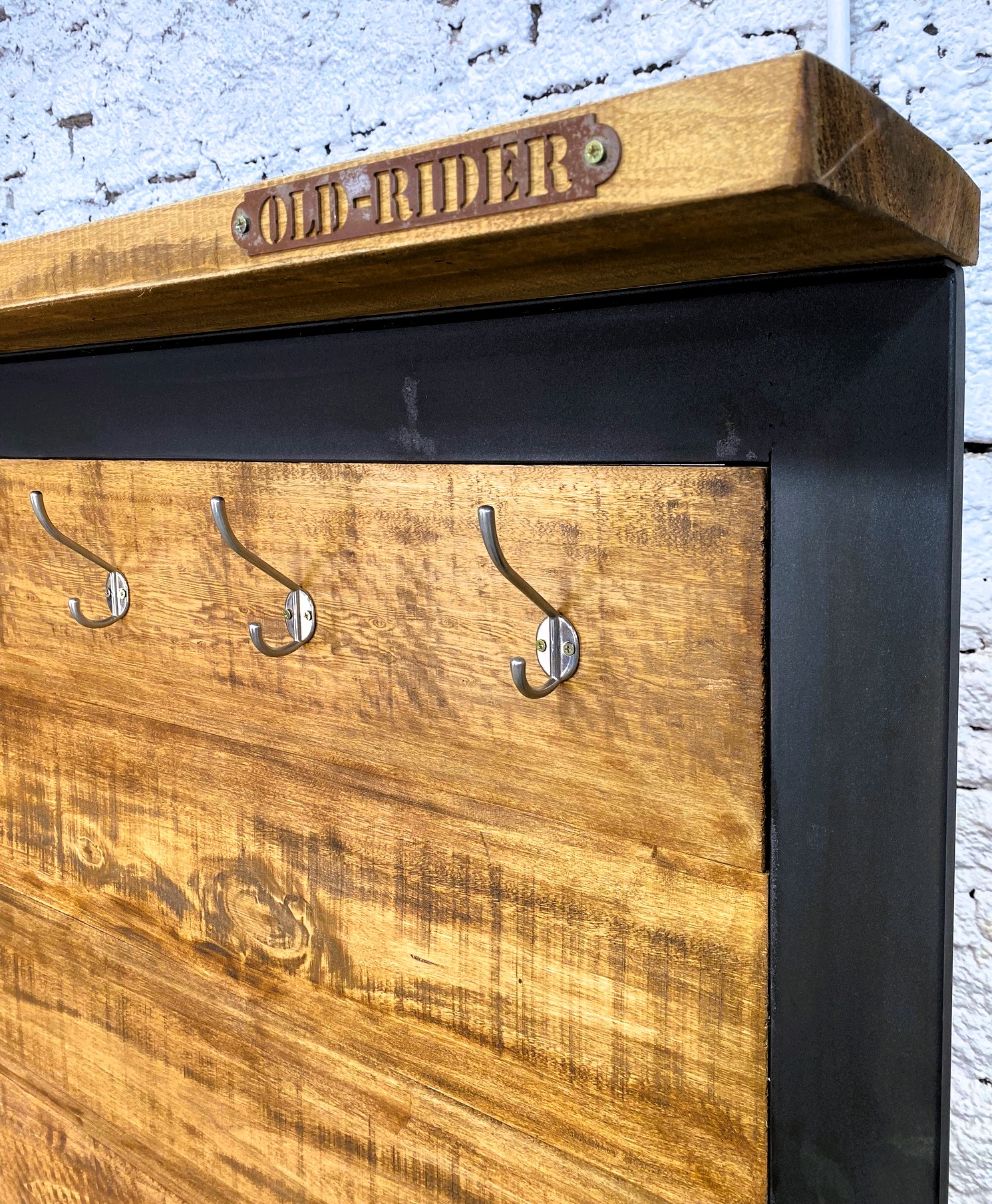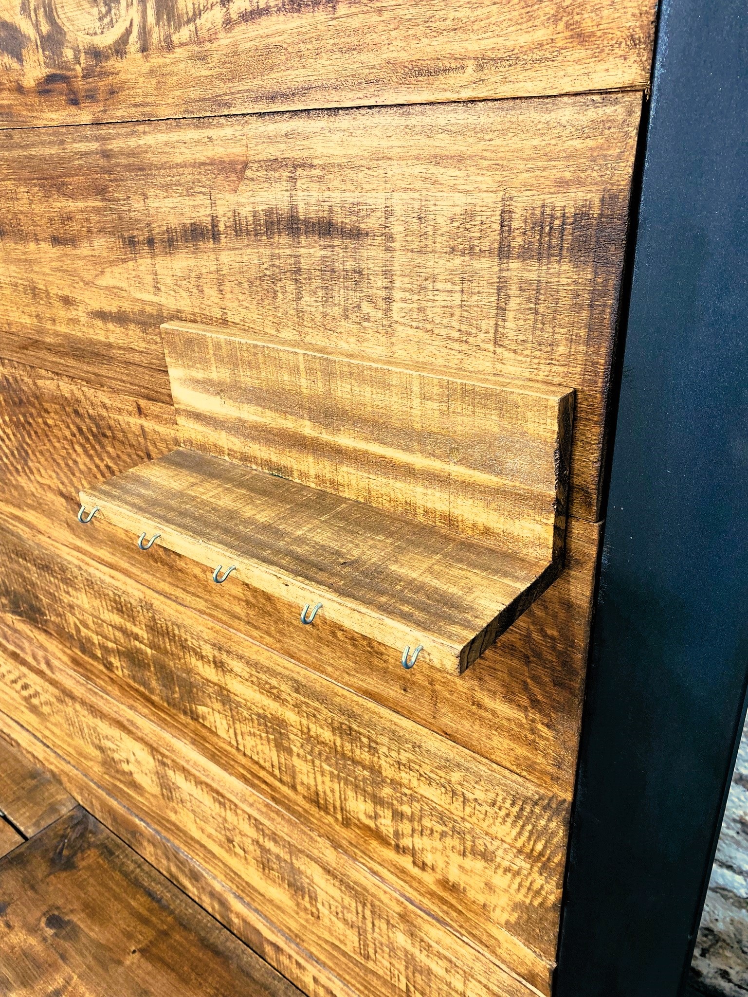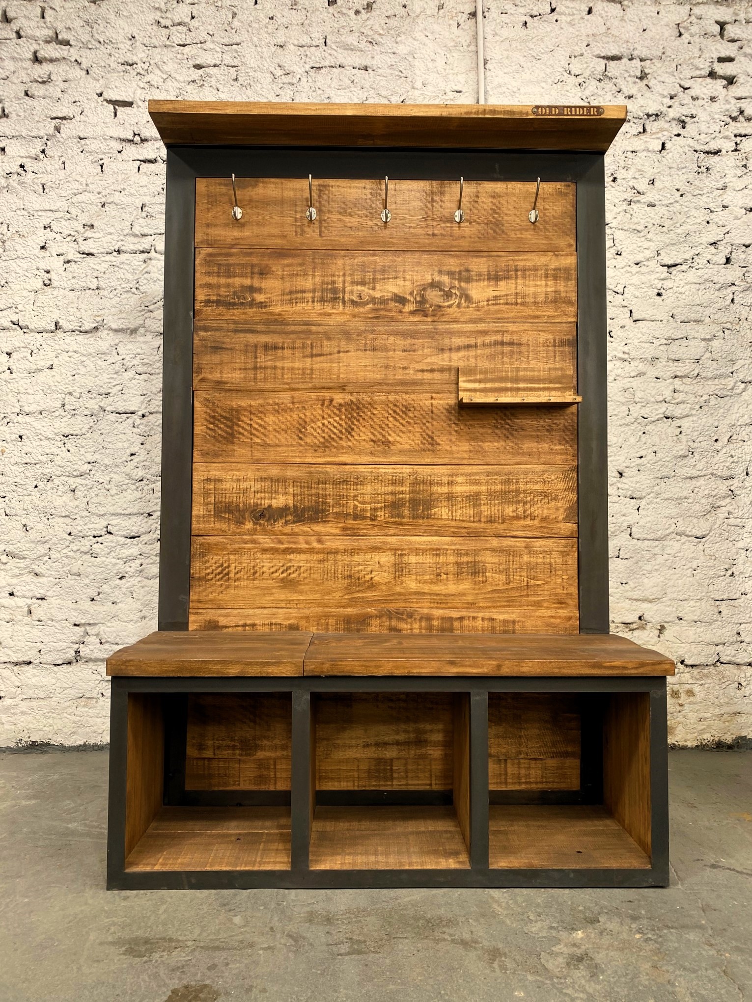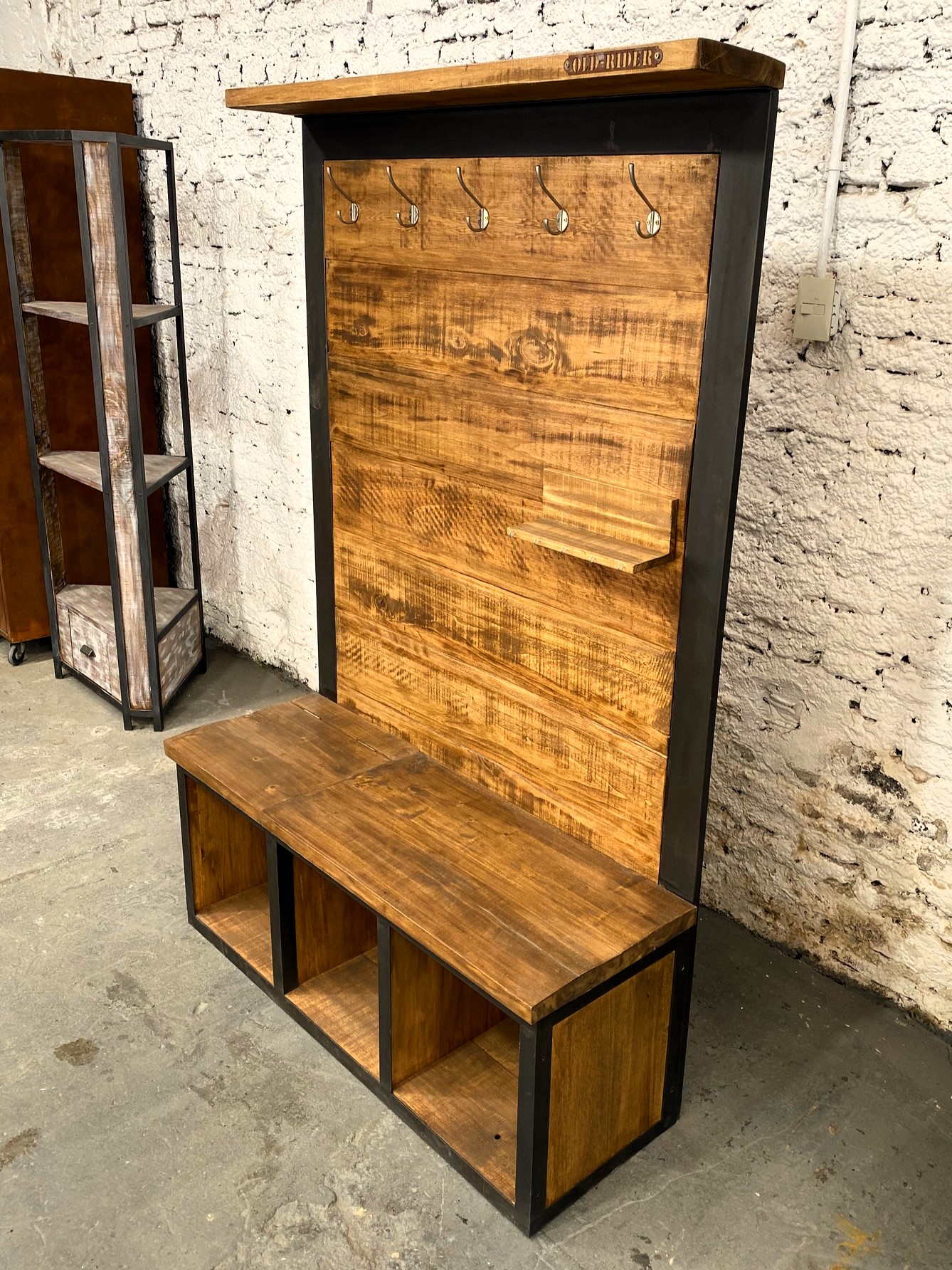 Perchero recibidor con saliente de madera, ganchos y espacio de guardado inferior.