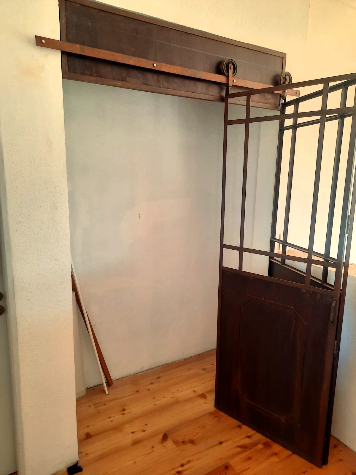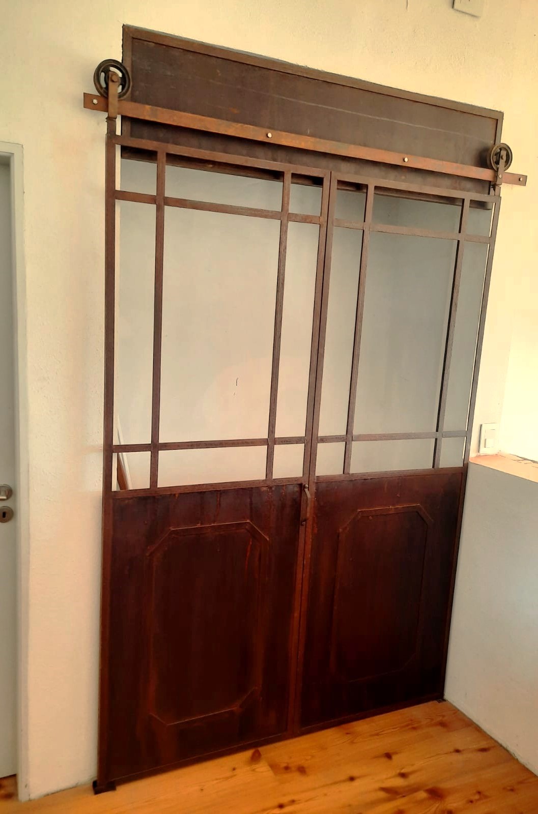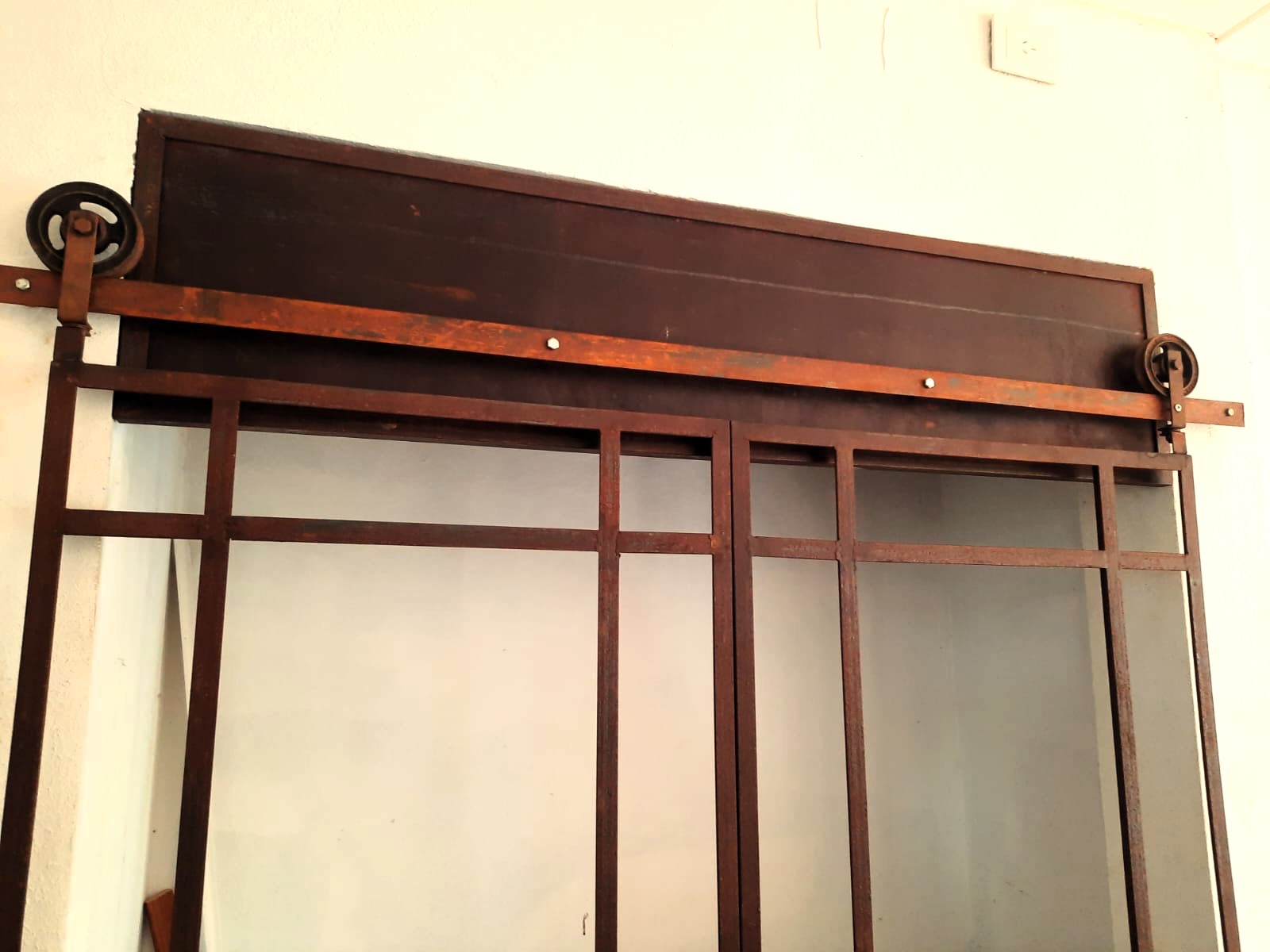 Puerta de hierro con agarre tipo granero de dos paneles plegables.