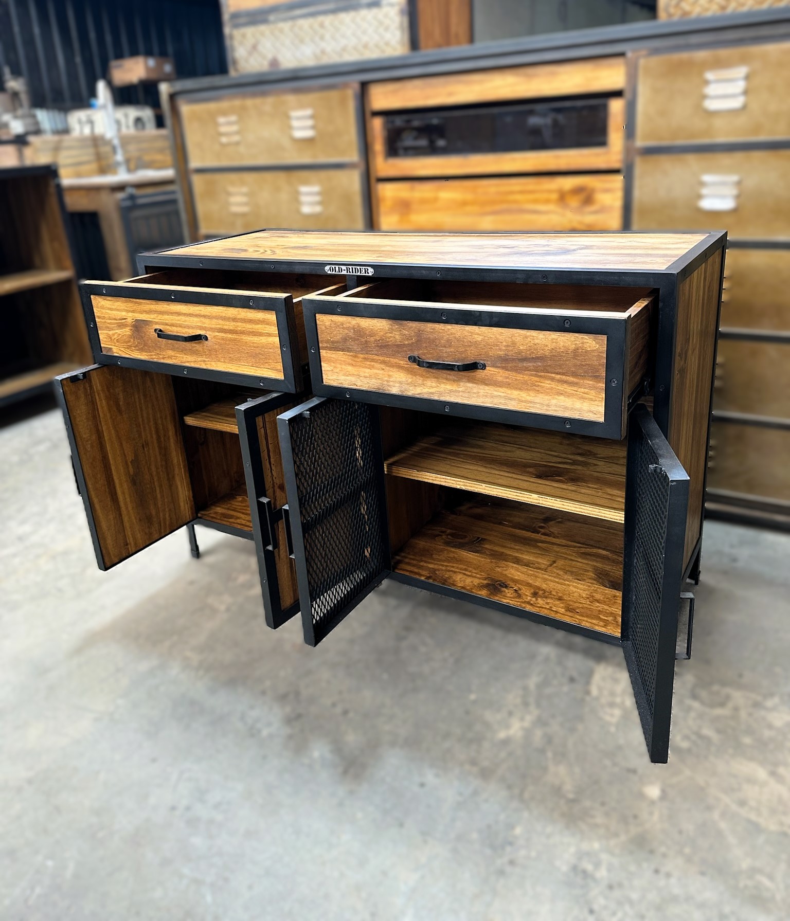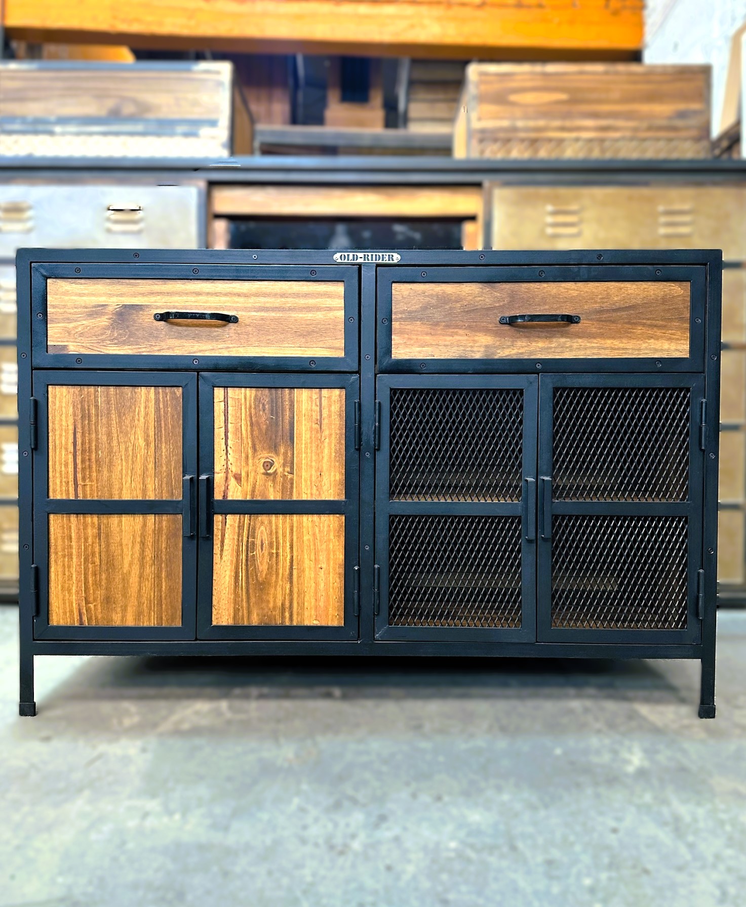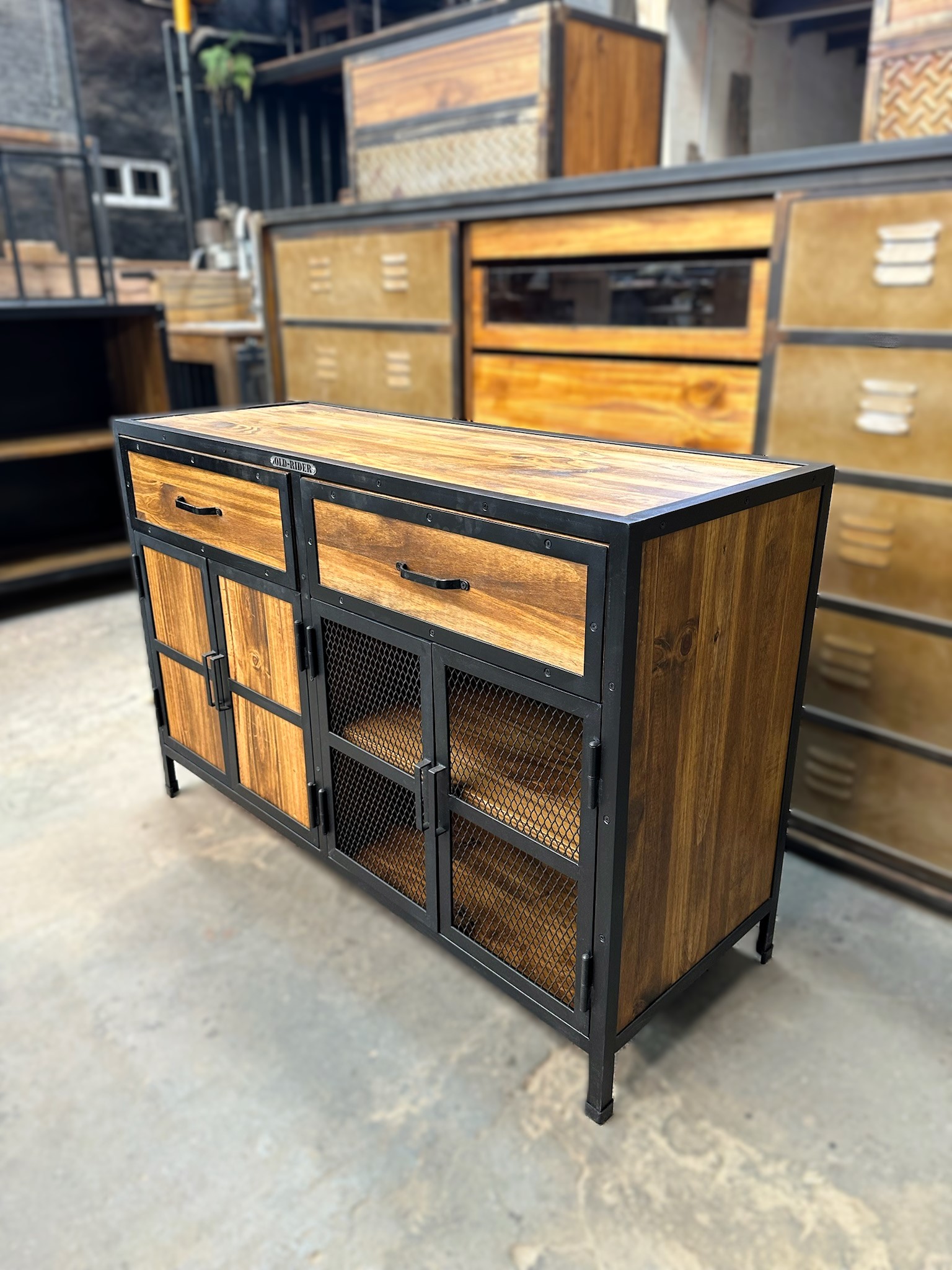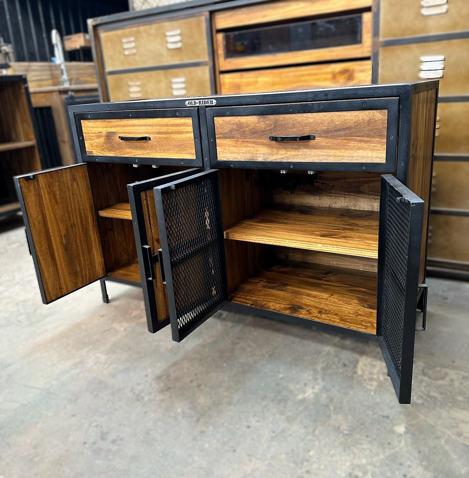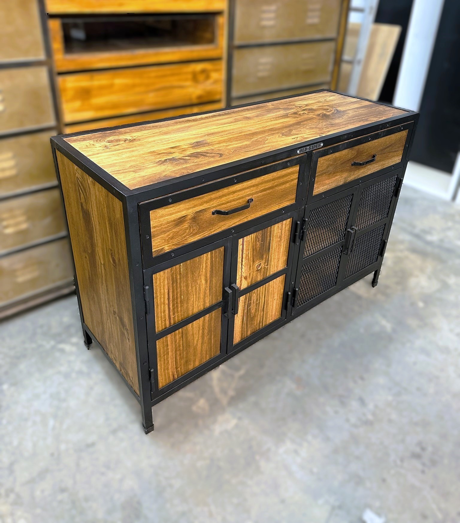 Recibidor cajonera de madera con bordes en hierro. Estanerias con puertas de madera y hierro.
