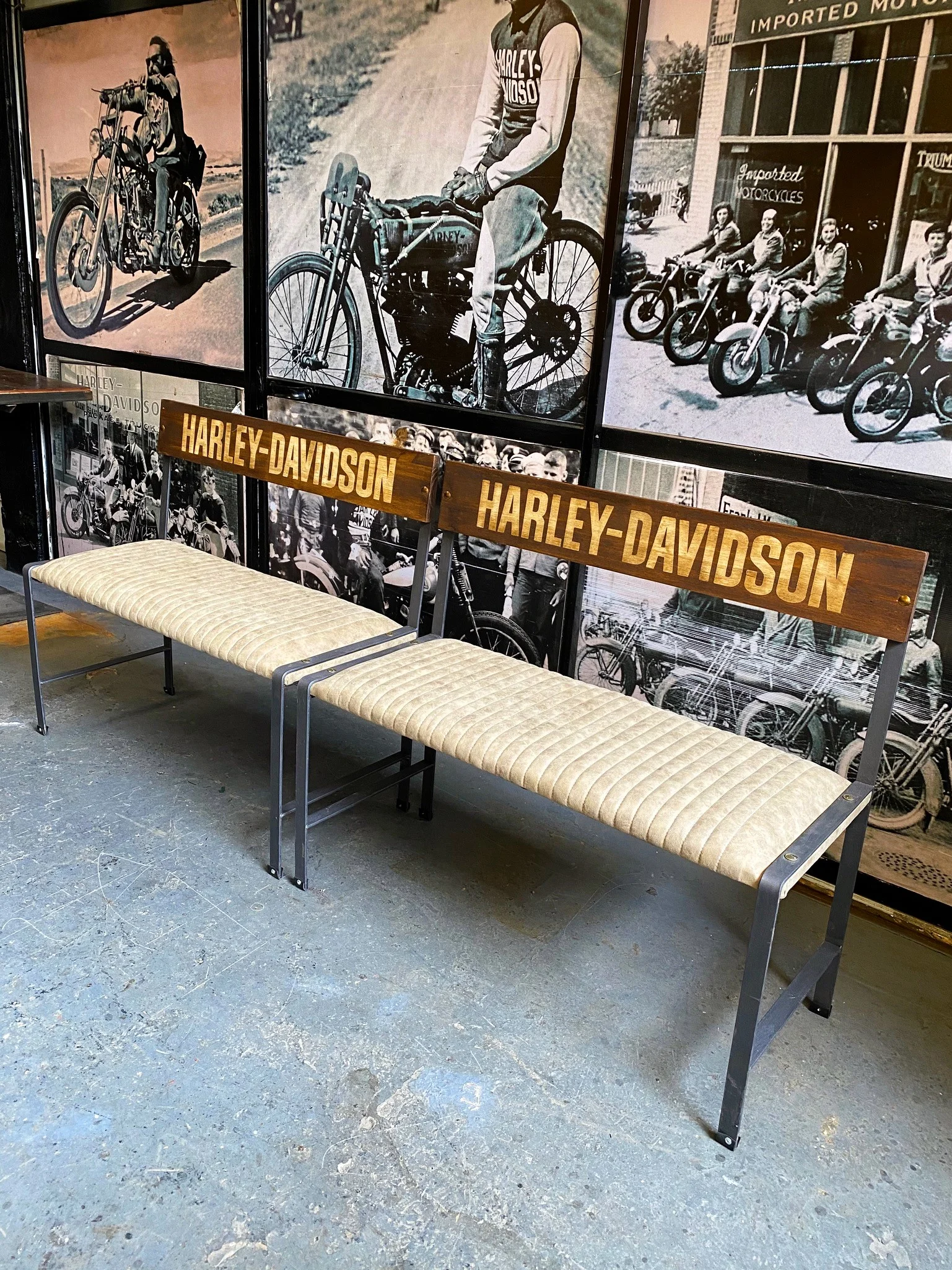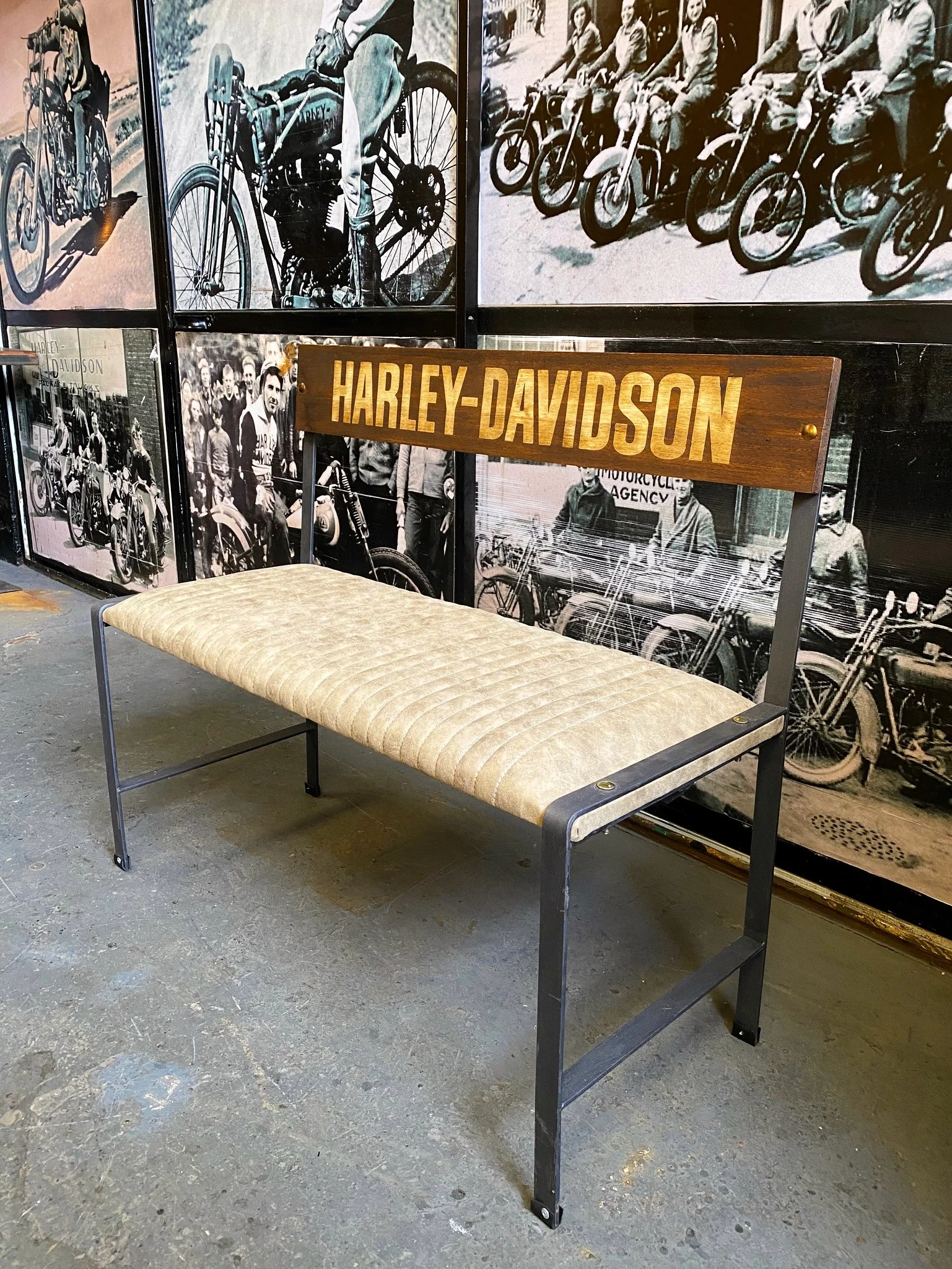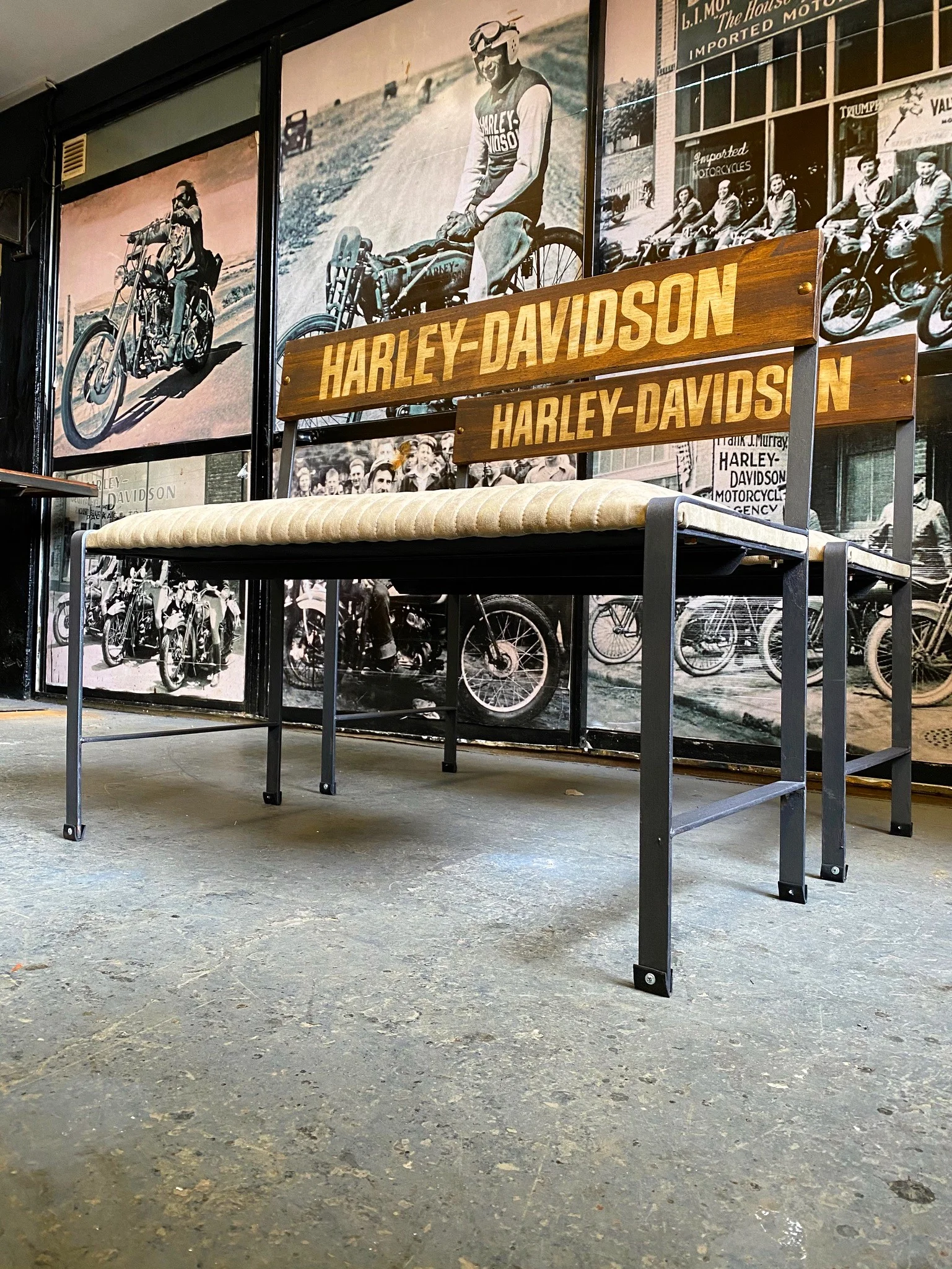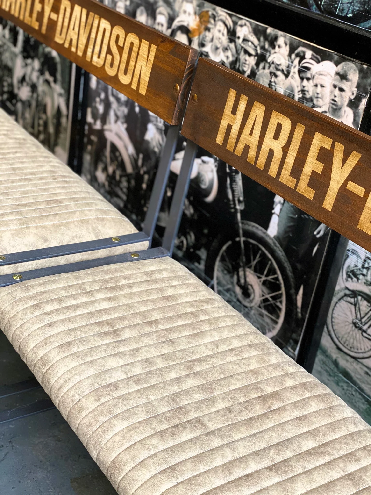 Banqueta tapizada con respaldo Harley-Davidson en madera y estructura metálica.