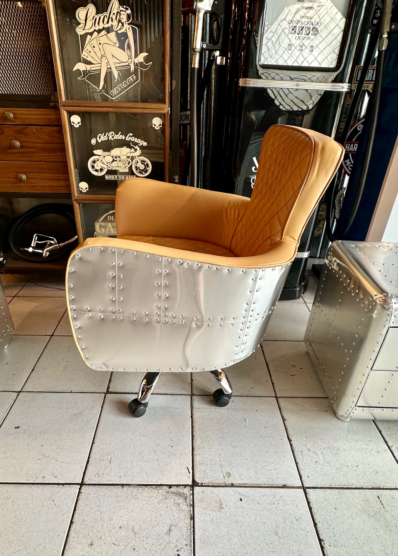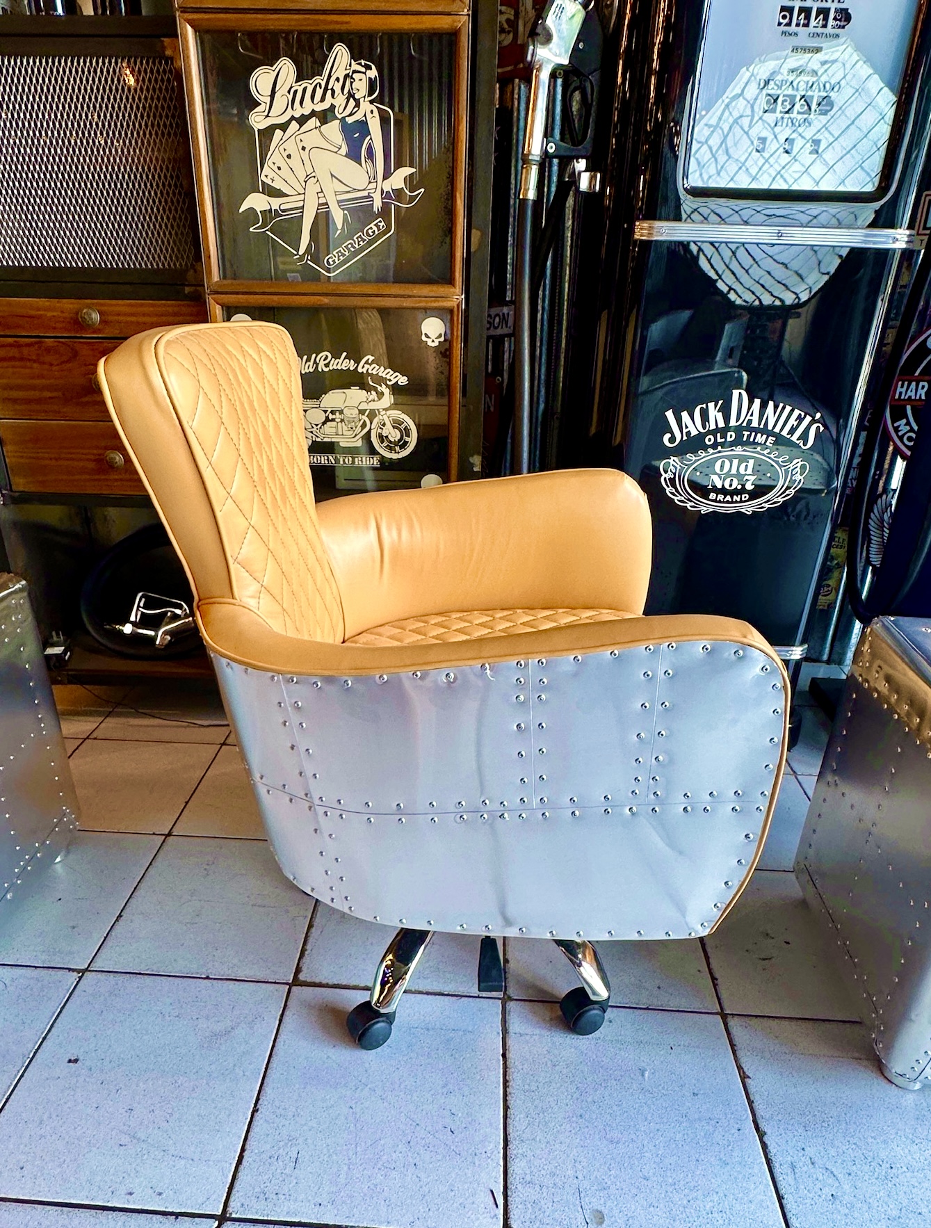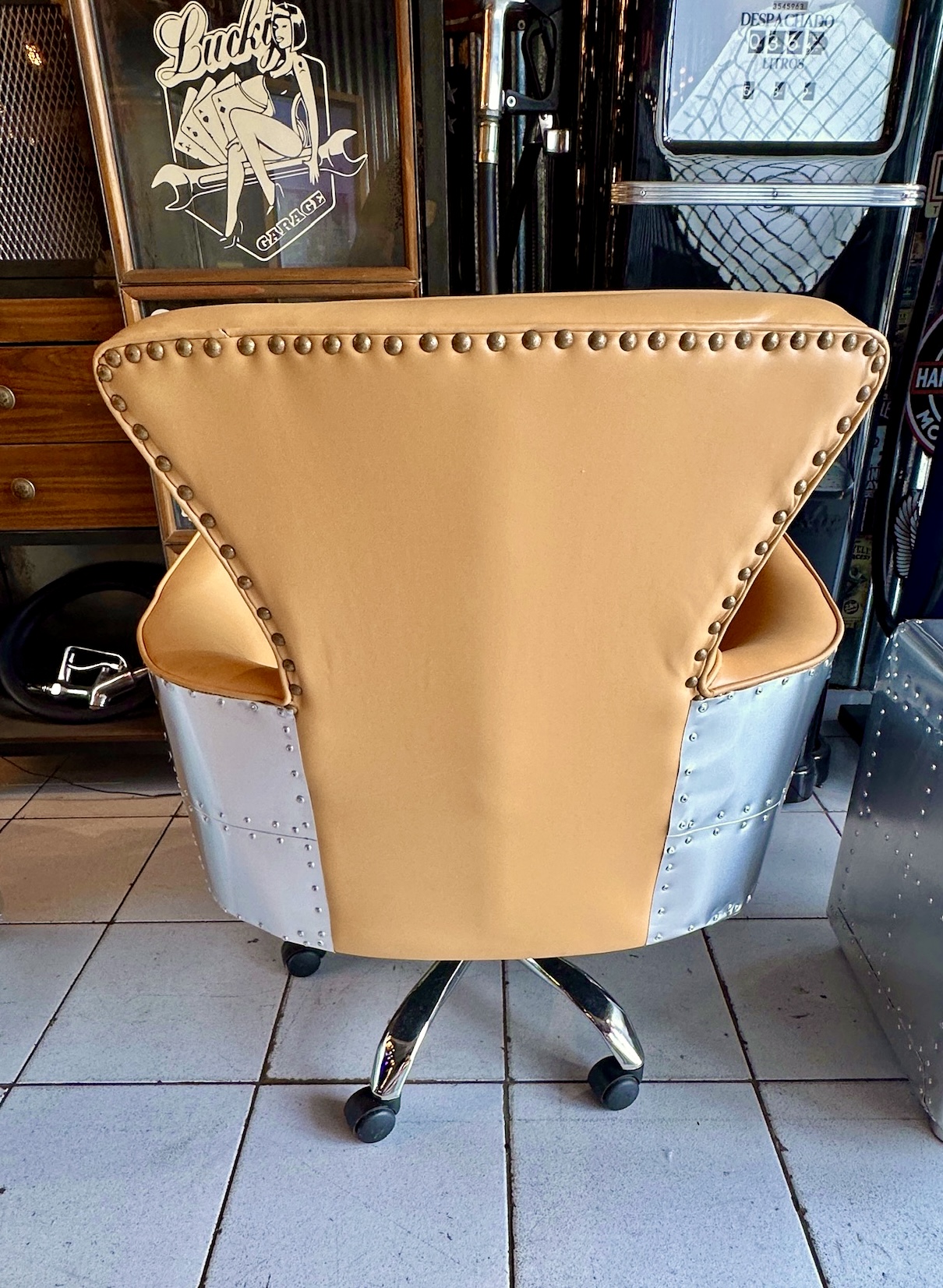 Sillón de escritorio de cuero vacuno cubierto de aluminio remachado.