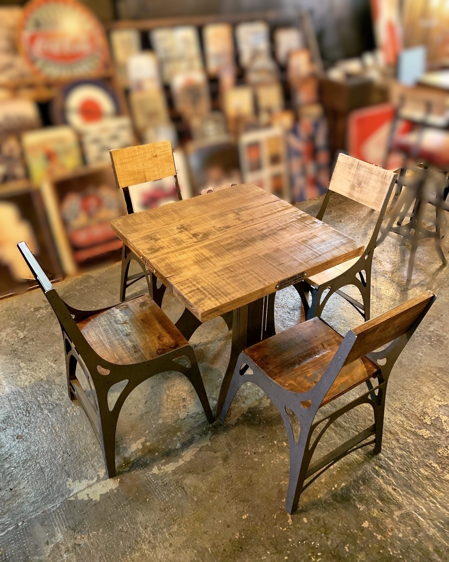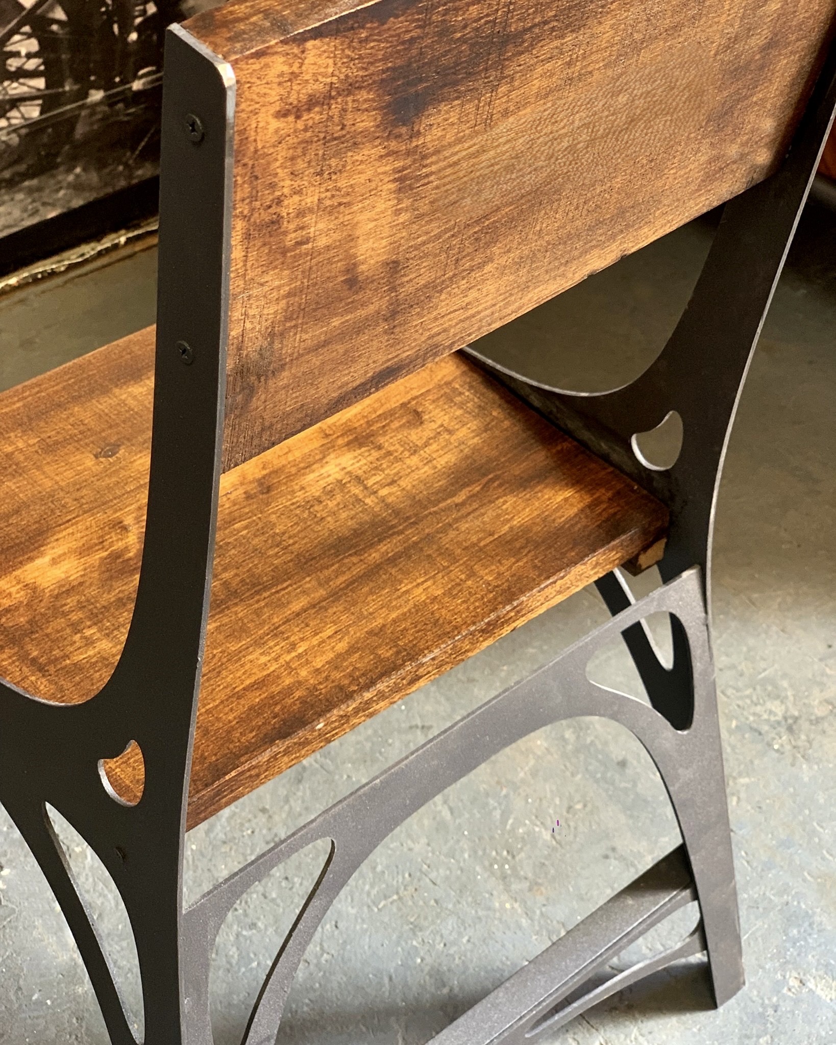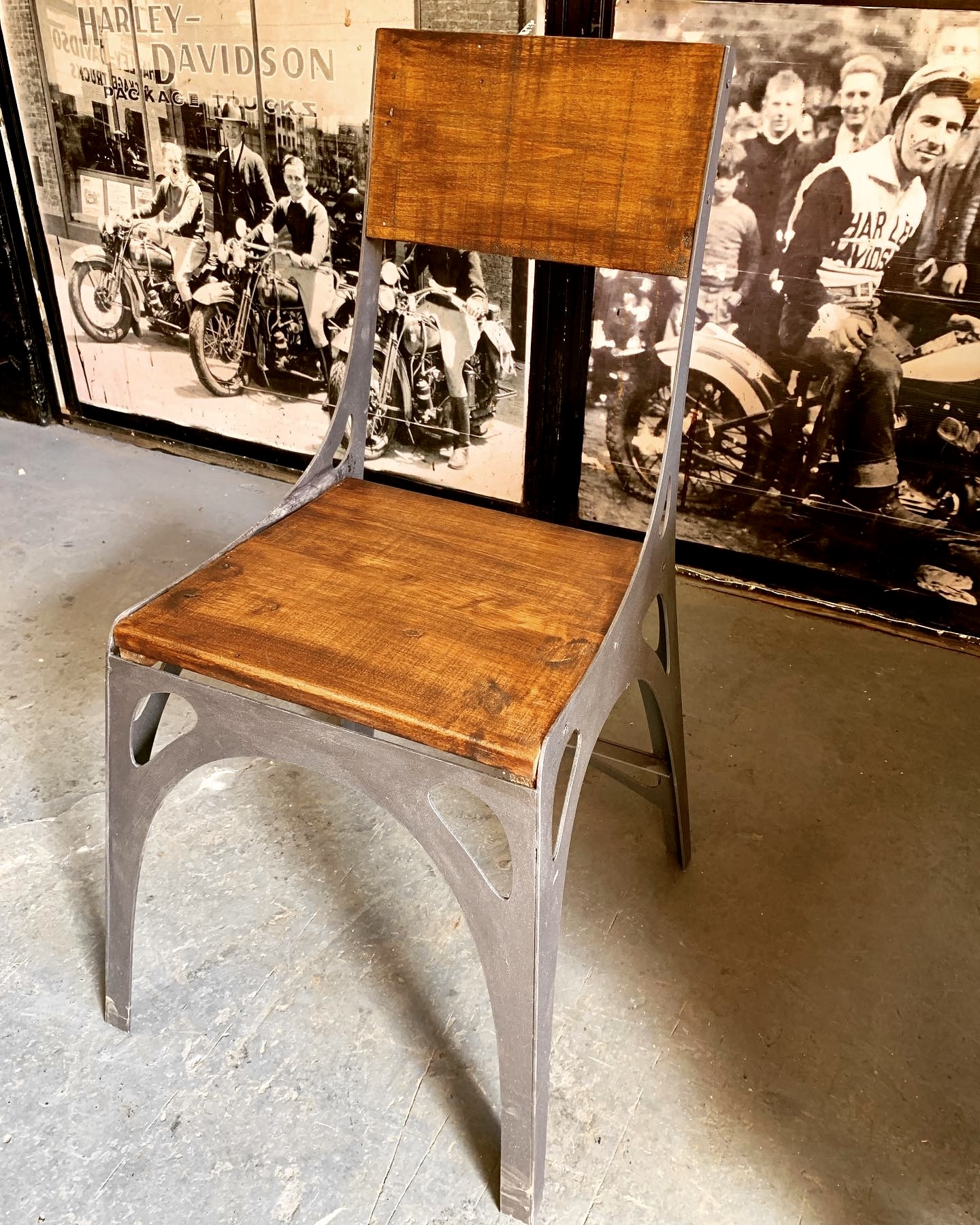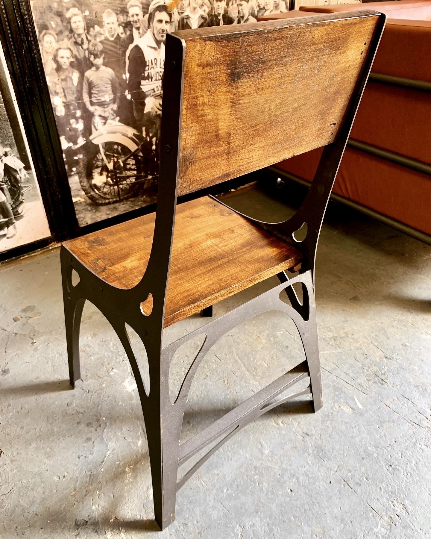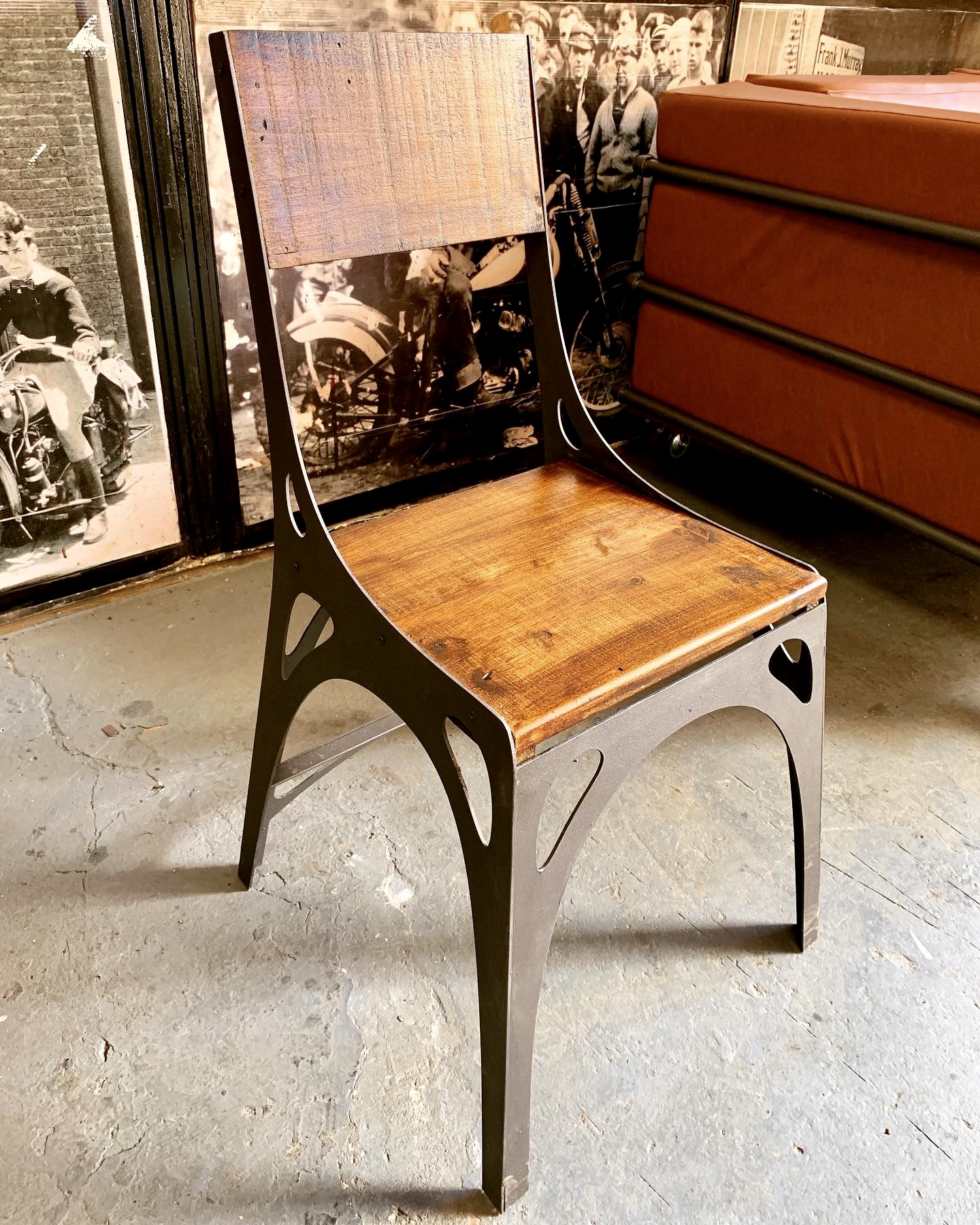 Silla de base de madera con estructura de hierro estilo arqueado.