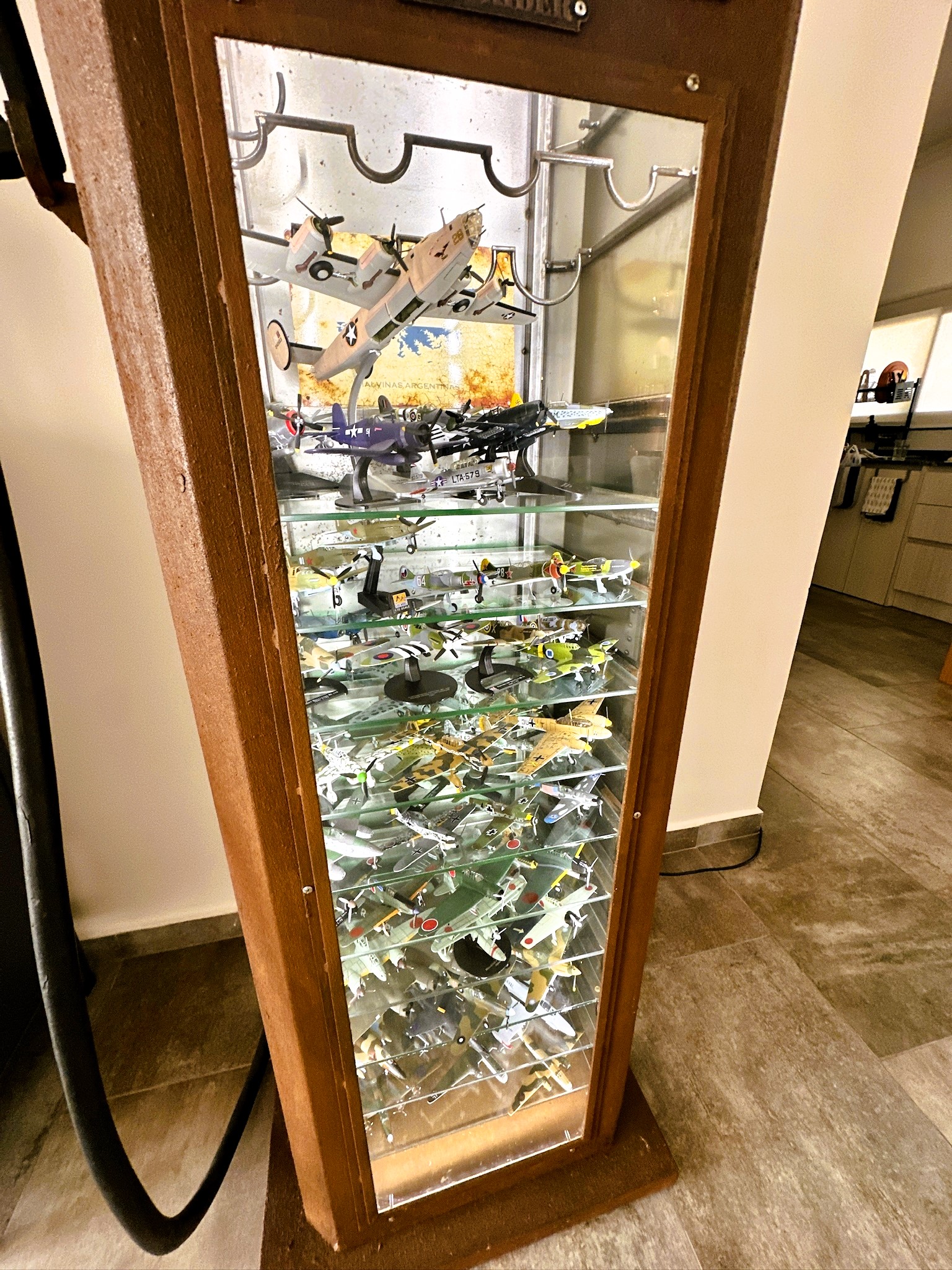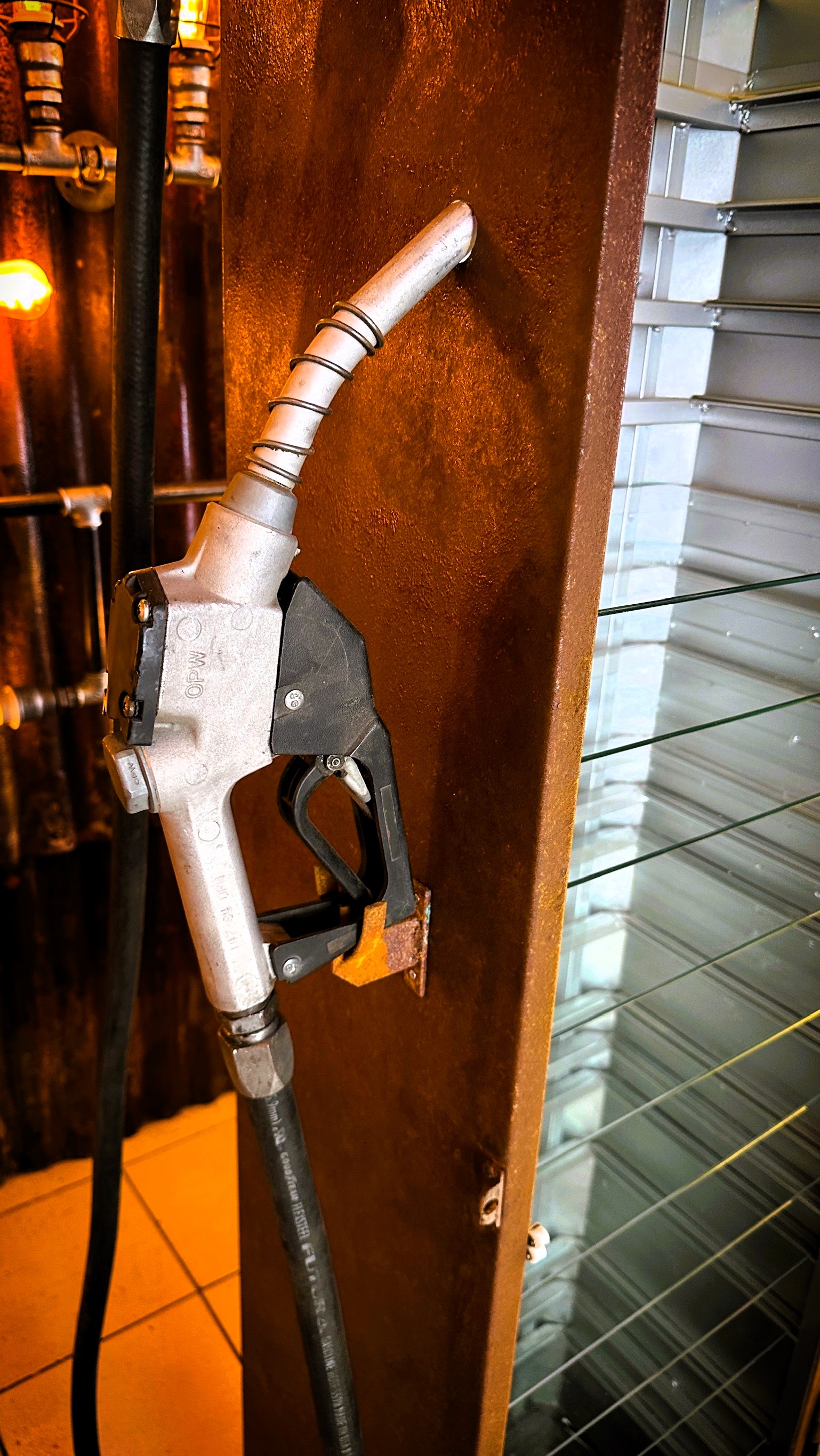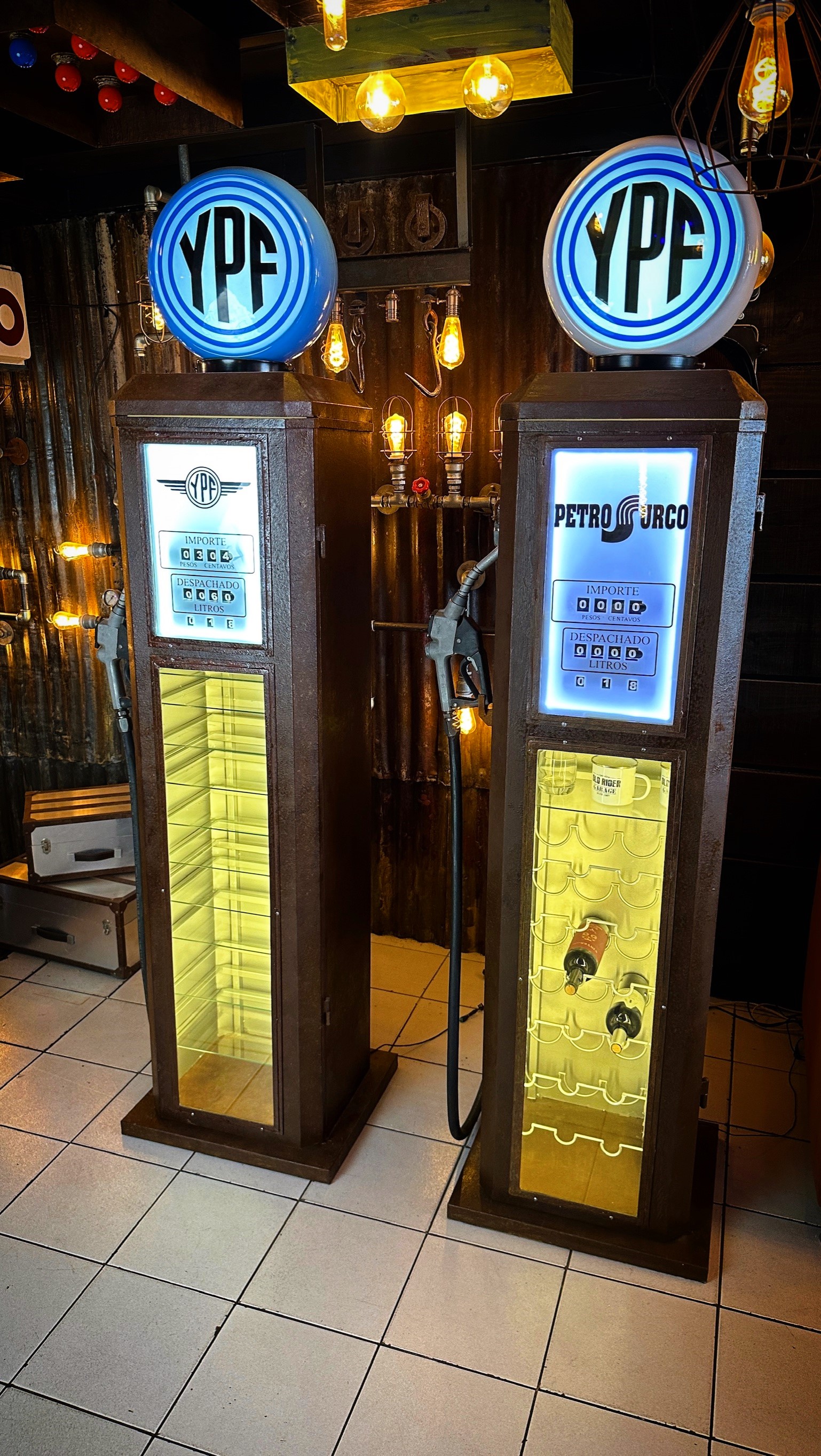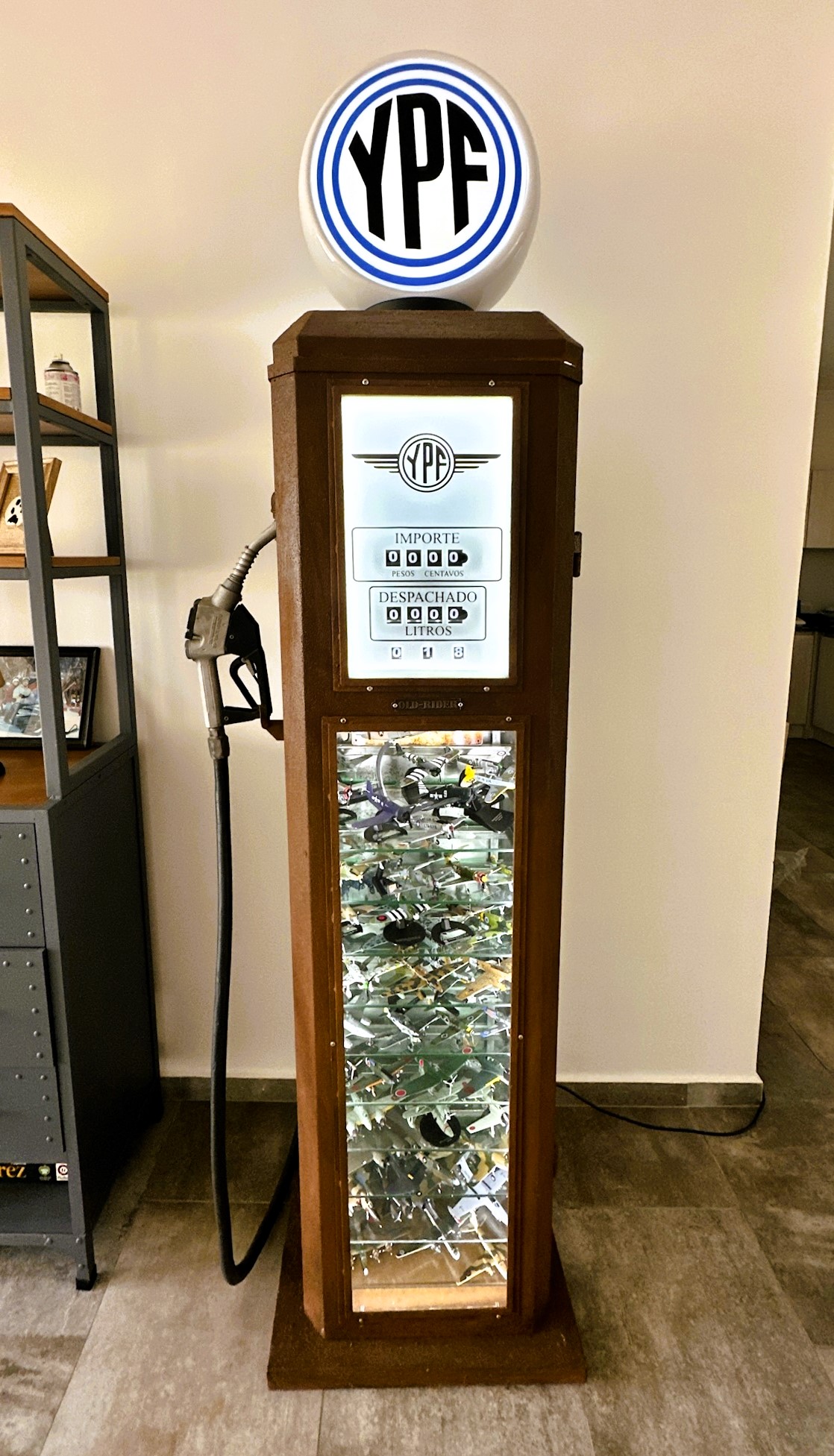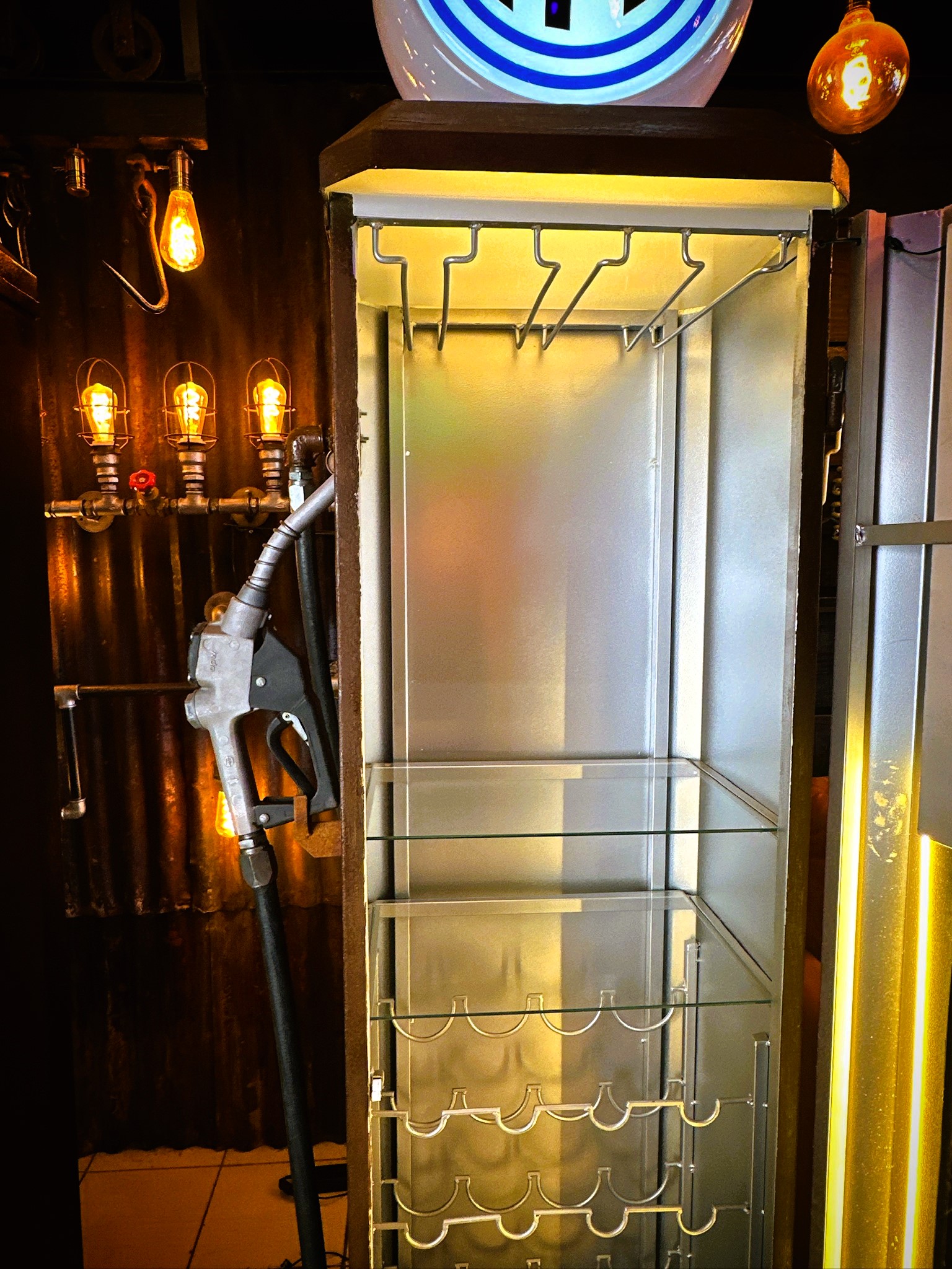 Surtidores vitrina, estantes de vidrio, exterior oxidado, ideal para colección y bodega.
