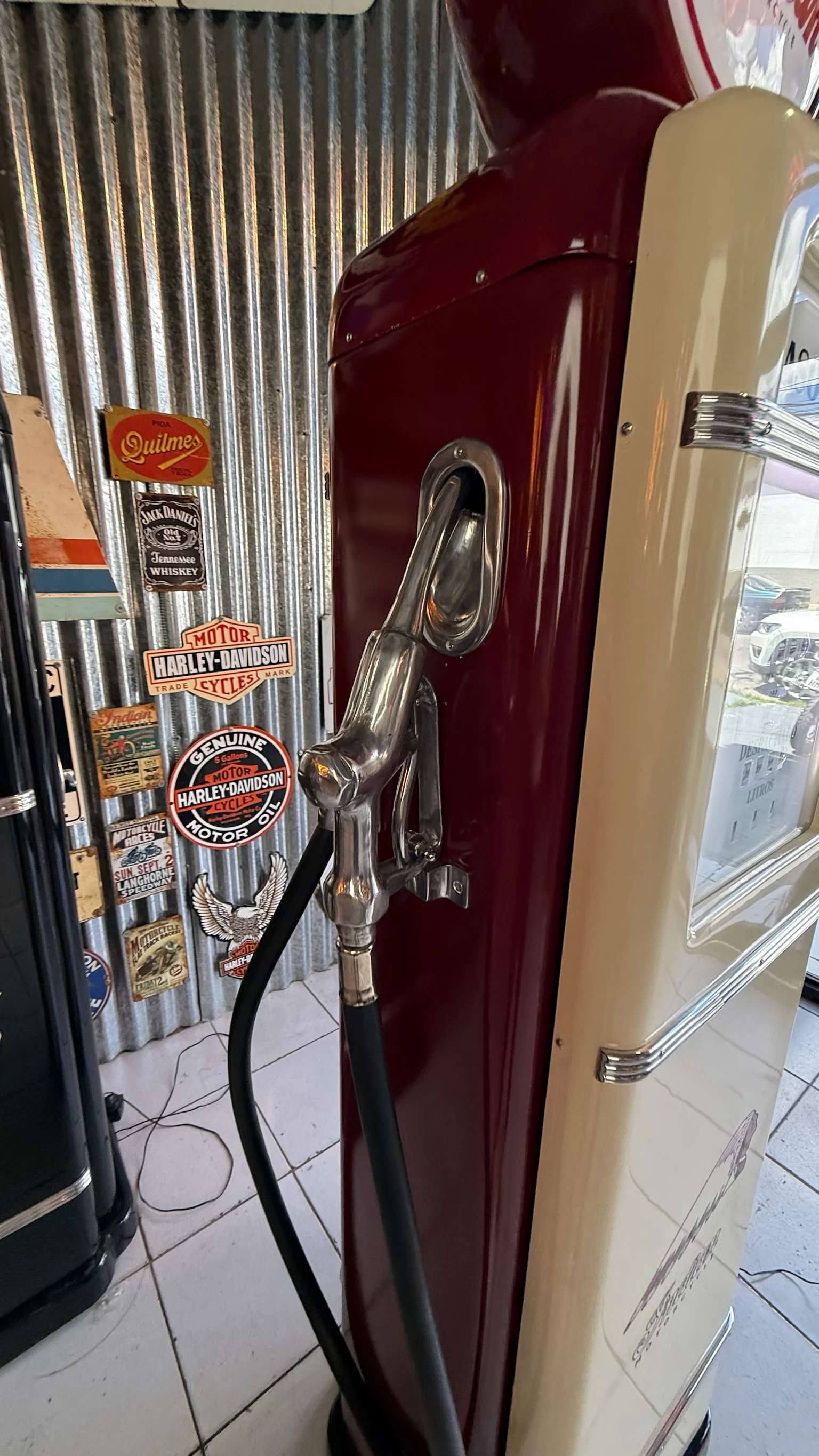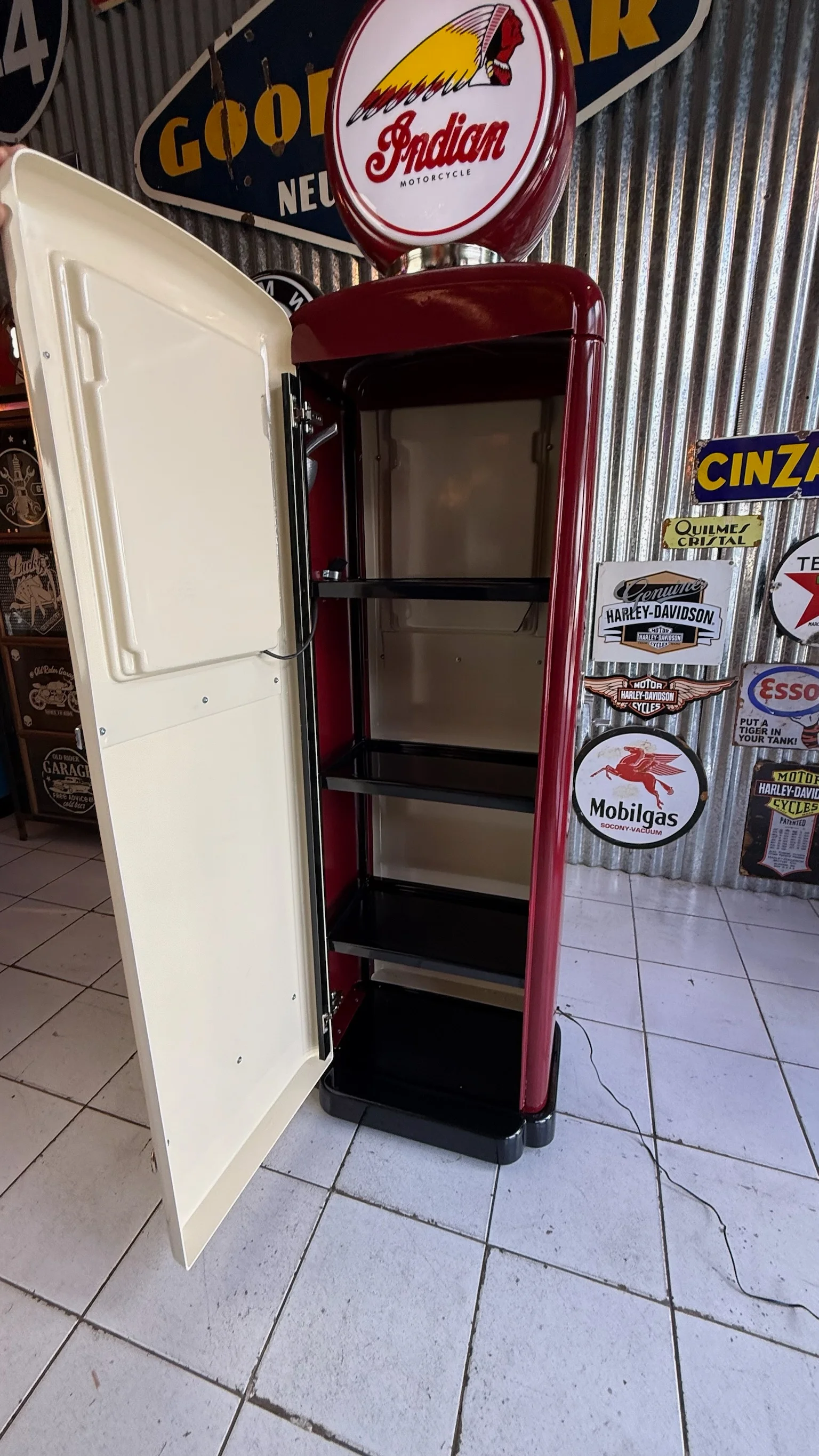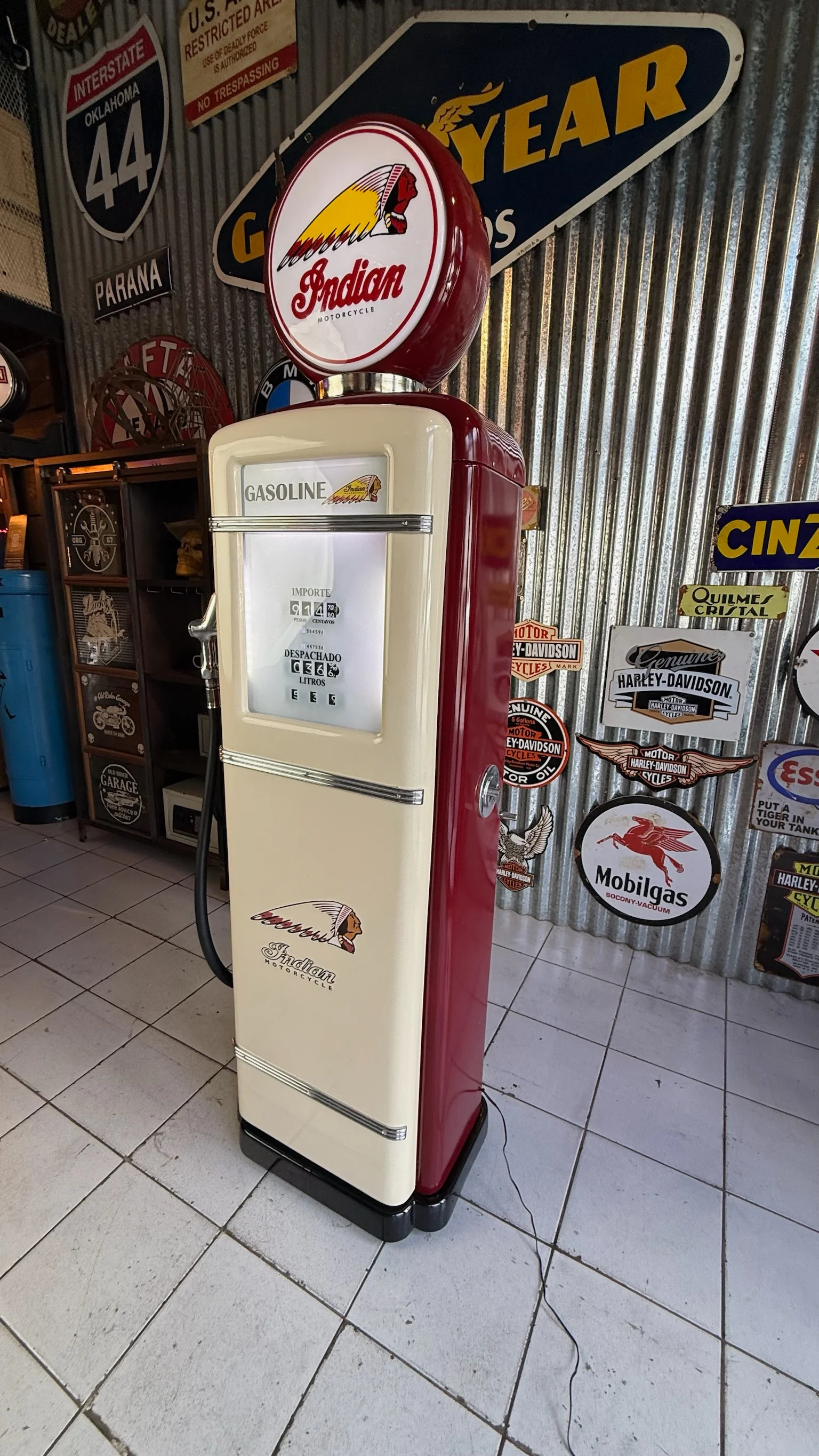Réplica de surtidor vintage Indian Motorcycle – Diseño clásico, totalmente personalizable. Incluye manguera y pico ORIGINAL, luz en visor y puerta en Doble frente para usar como vinoteca, almacenaje o espacio oculto.